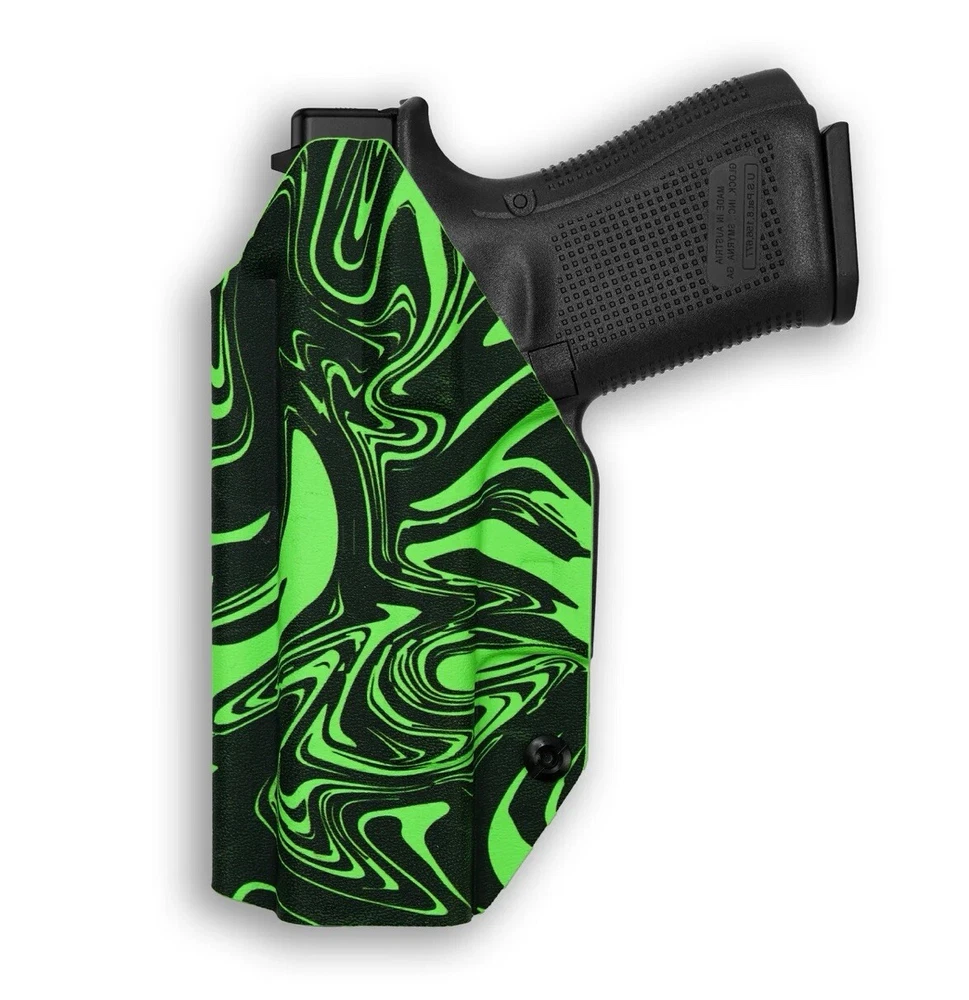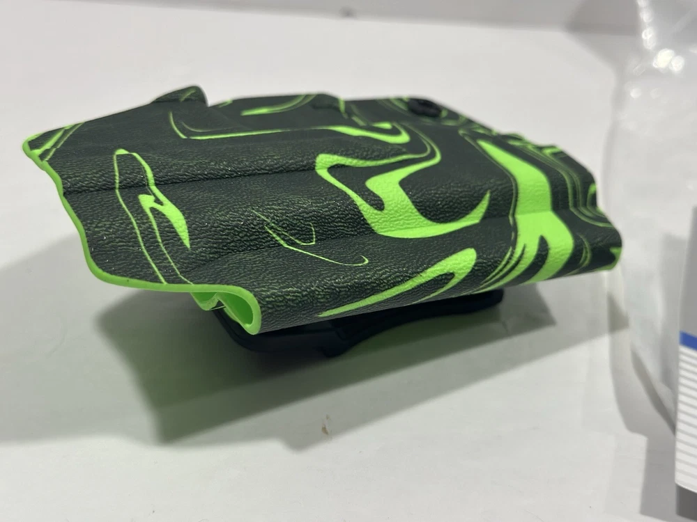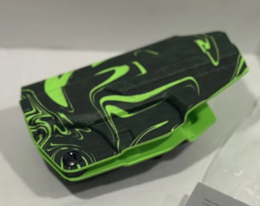 SMITH & WESSON M&P BODYGUARD 380 IWB HOLSTER - Color /Green Ink Swirl This Smith & Wesson M&P Bodyguard 380 holster is a durable, dependable, and form-fitting piece, offering effective concealment and quick, reliable access. Makes it easier to draw and re-holster the gun while keeping your eye on the possible threat or target instead of precious seconds spent searching for the holster. It will also make accidentally re-holstering your gun along with part of your shirt less of an issue Made in the USA Lifetime guarantee Inside the waistband (holster only) Fits a 1.5 inch belt
