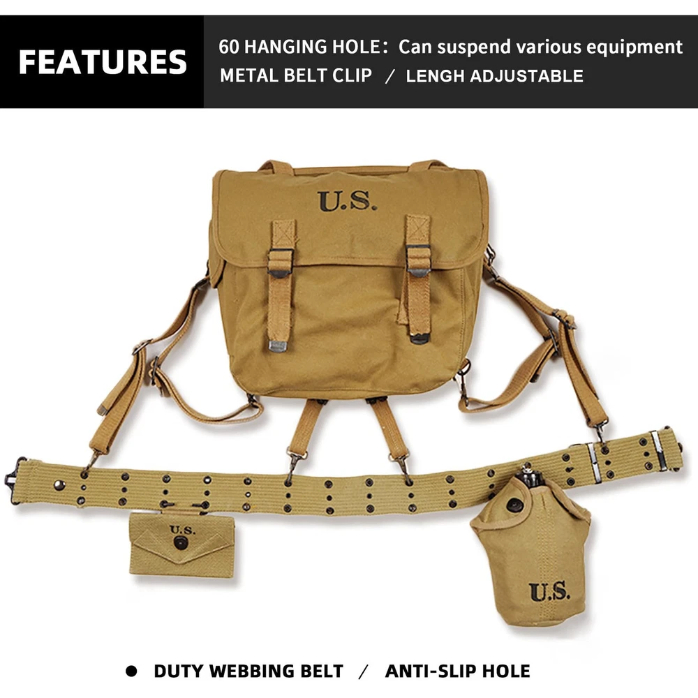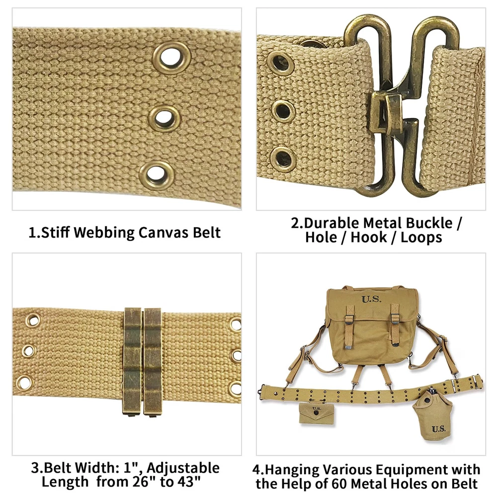 Expertly handcrafted replica. Regular Adjustable Waist length is from 26"to 43" (66 to 109cm), Full Lengh: 49 inch, Width:2 inches American M1936 pistol belt. This was the standard pistol belt used in WW2 by the US Army With three rows of eyelet's. The top row is to attach M36 suspenders, the middle row allows the belt to be adjusted in size (the belt hook clips into these) and the bottom row allows pistol holsters and first aid pouches etc. to be attached If you interested for other WW2 US webbing gear, you can search SMONT WW2 US. Any problem please connect us, we will try our best to solve your problem Metal belt clip, anti-slip holes, duty webbing belt. 60 hanging holes can suspend various equipment