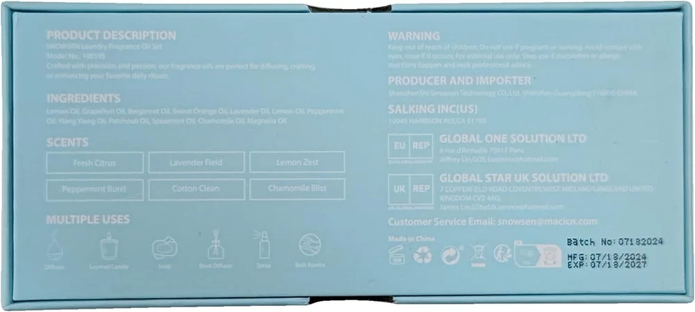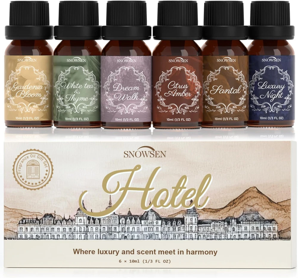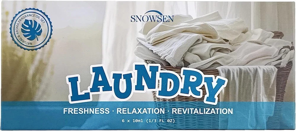 Envelop Your Space in Fresh: This Laundry essential oil set comes in six vibrant and diverse scents, including Fresh Citrus, Lavender Field, Peppermint Burst, Lemon Zest, Cotton Clean, and Chamomile Bliss. These carefully selected fragrances are designed to invigorate and elevate any room, whether you're looking to create a relaxing sanctuary, a fresh and energizing atmosphere, or simply enjoy a pleasant scent throughout your home. Perfect for Use in Diffuser : Perfect for diffusing, they bring a fresh and welcoming ambiance to any environment. Laundry essential oils set is designed to work seamlessly with a wide range of diffusers, including humidifier and oil burner. Add a few drops to your essential oil diffuser to enjoy a continuous flow of your favorite aroma.Their concentrated formula ensures that a few drops are enough to fill your space with a fresh clean aroma. Versatile Applications: SNOWSEN laundry clean fragrance oils are not just for diffusers. these essential oils offer endless possibilities for creative projects. Use them in candle making to create custom scented candles that enhance your home’s atmosphere. They are also ideal for crafting room sprays, scented bath bombs, or bath salts, allowing you to personalize your DIY creations. Artfully Crafted for Tranquility: Enhance your living space with our laundry fragrance oils. Create a calming retreat with Lavender Field and Chamomile Bliss, perfect for unwinding after a long day. Enjoy the crisp, clean scent of Cotton Clean to reminiscent of sun-dried clothes on a warm day. Each fragrance is crafted to making every room feel more pleasant and comfortable. Thoughtful Gift Choice: Packaged in a beautifully designed box, laundry essential oil set is perfect for celebrating special moments or simply enhancing everyday life. Whether it's for birthdays, anniversaries, holidays, or housewarming events, this clean fragrance oil set offers a touch of practicality. It’s a wonderful way to enrich the ambiance of any home. Product Description 1 Diffuser 2 Room Spray 3 Oil Burner 4 Reed Diffuser 5 DIY Home Fragrance