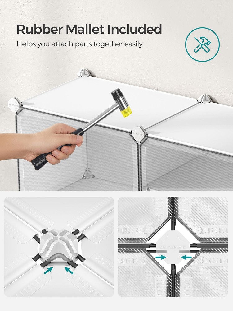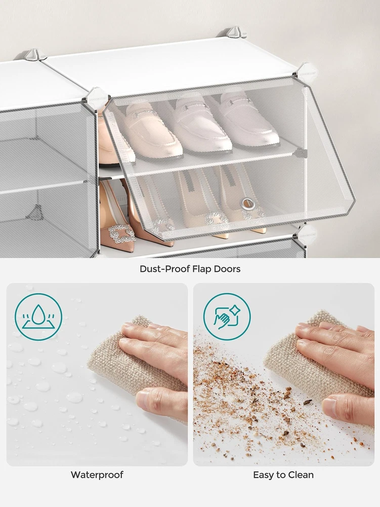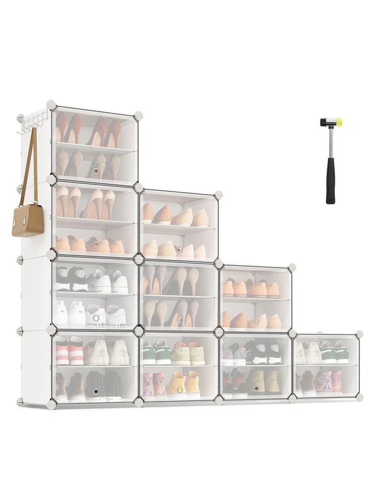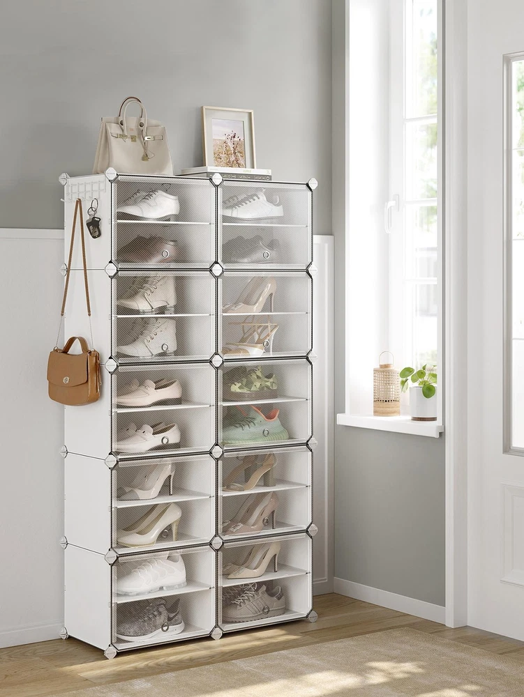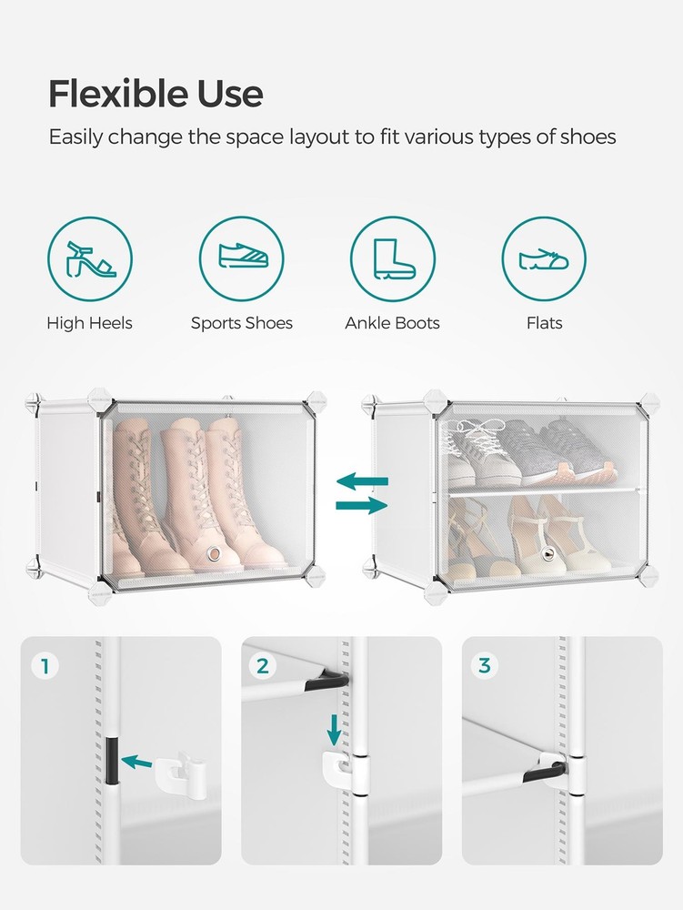 About this item [Storage Aplenty] This versatile plastic shoe storage organizer, able to accommodate up to 40 pairs of shoes, doubles as storage for bags and clothing. Its space-efficient side hooks offer a handy spot to hang hats or dog leashes [Robust and Secure] Crafted with premium connectors, durable plastic panels, and strong steel wire, each slot of this shoe storage cabinet holds up to 11 lb. The provided anti-tip kit ensures safe use in living rooms or bedrooms [Easy Assembly and Disassembly] The included rubber mallet makes assembling this shoe rack quick and easy. This organizer can also be quickly disassembled to store or transport, letting you easily rearrange this around your home [Adaptable and Versatile] Configure this storage unit in different ways. Make it have 2 or 3 separate rows, or even divide it into 2 small shelf units to organize shoes, clothes, or toiletries in your entryway, bathroom, or any other desired space [Ventilated and Easy to Clean] This plastic shoe cabinet features clear doors, providing dust-proof and waterproof protection while allowing easy viewing of shoes inside. Grommets on the doors enable effortless opening and promote ventilation Specifications: Material: ABS Plastic Connector, PP Plastic Panel, Steel Frame Product Size: 12.6"D x 32.7"W x 61.4"H (32 x 83.1 x 156 cm) Interior Size of Each Compartment: 11.8"D x 15.7"W x 11.8"H (30 x 40 x 30 cm) Product Weight: 21.2 lb (9.6 kg) Max. Static Load Capacity per Compartment: 11 lb (5 kg) Total Max. Static Load Capacity: 110 lb (50 kg) Package Contents: 10 x Plastic Panel with Grommet (15.7" x 11.8") 34 x Plastic Panel (15.7" x 11.8") 15 x Plastic Panel (11.8" x 11.8") 2 x Anti-Tip Device 34 x Joint 40 x Plastic Connector 1 x Wire Panel with 5 Hooks 1 x Rubber Mallet 1 x Instructions SONGMICS Notes: For safety, be sure to secure the shoe rack to the wall with the included anti-tip kit. Children are not allowed to climb on or play with the shoe storage cabinet for safety. Do not overload this shoe storage organizer. Do not place the storage unit outdoors for a long time to avoid weathering. Keep the rounded sides of the plastic connectors marked "SONGMICS" facing outwards during assembly. During assembly, ensure that the corners of the panels are fully inserted into the bottom of the connectors for greater stability. Material: Stainless Steel