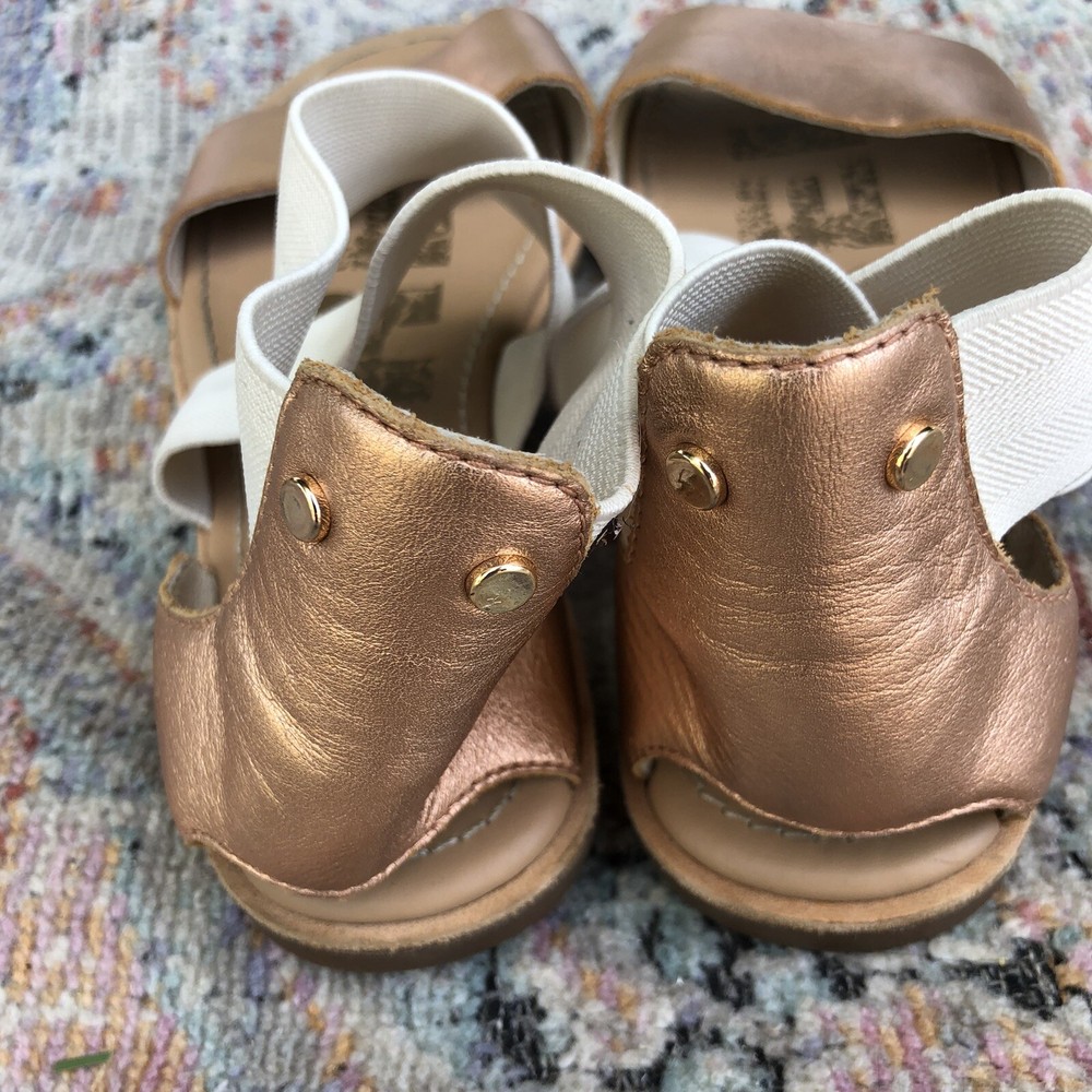 These sandals are super comfortable with a stylish criss-cross metallic strap—perfect for casual outings! The leather is soft, and the elastic adds a snug fit. They do show some wear, but that just gives them a cool, lived-in vibe. Great find for a laid-back summer look!