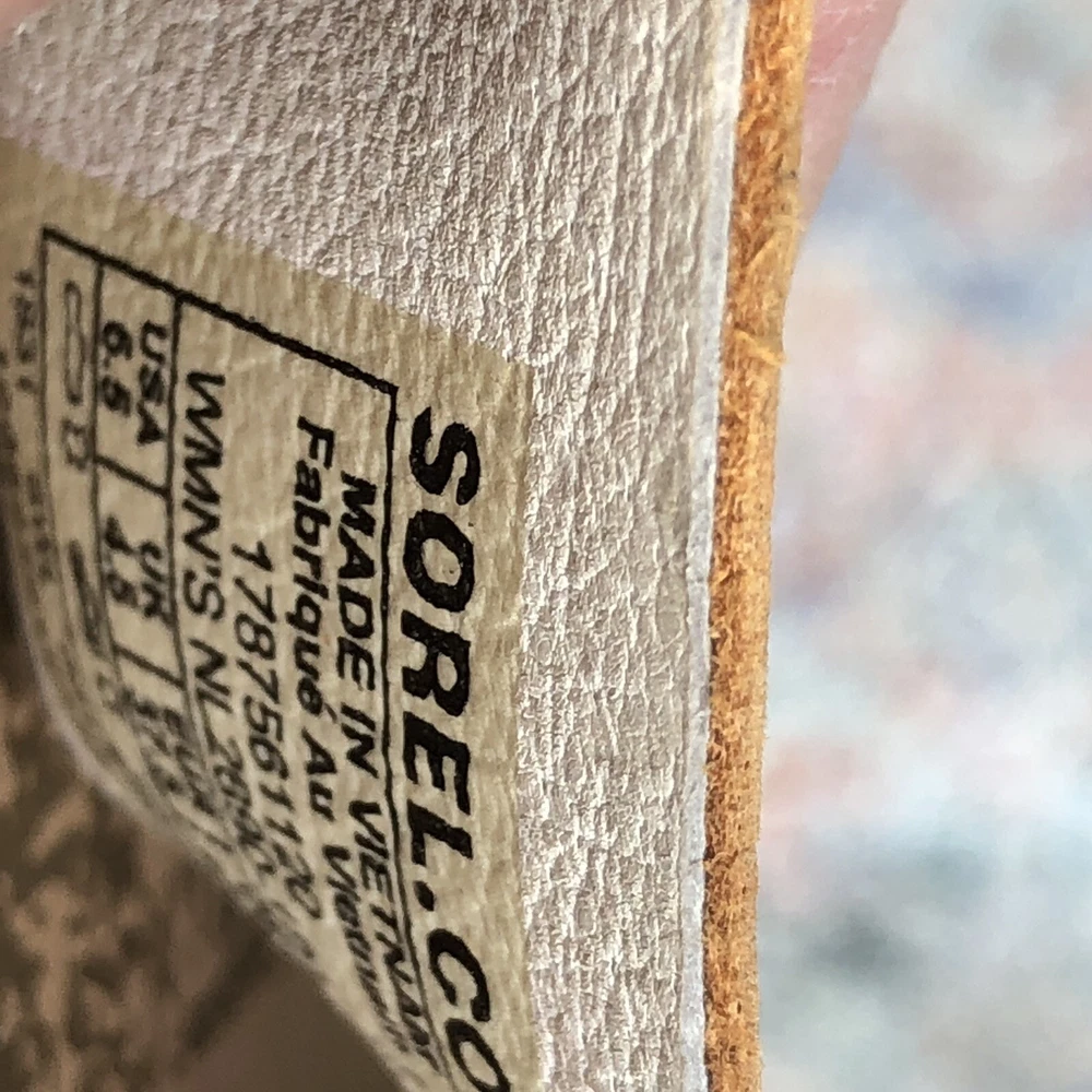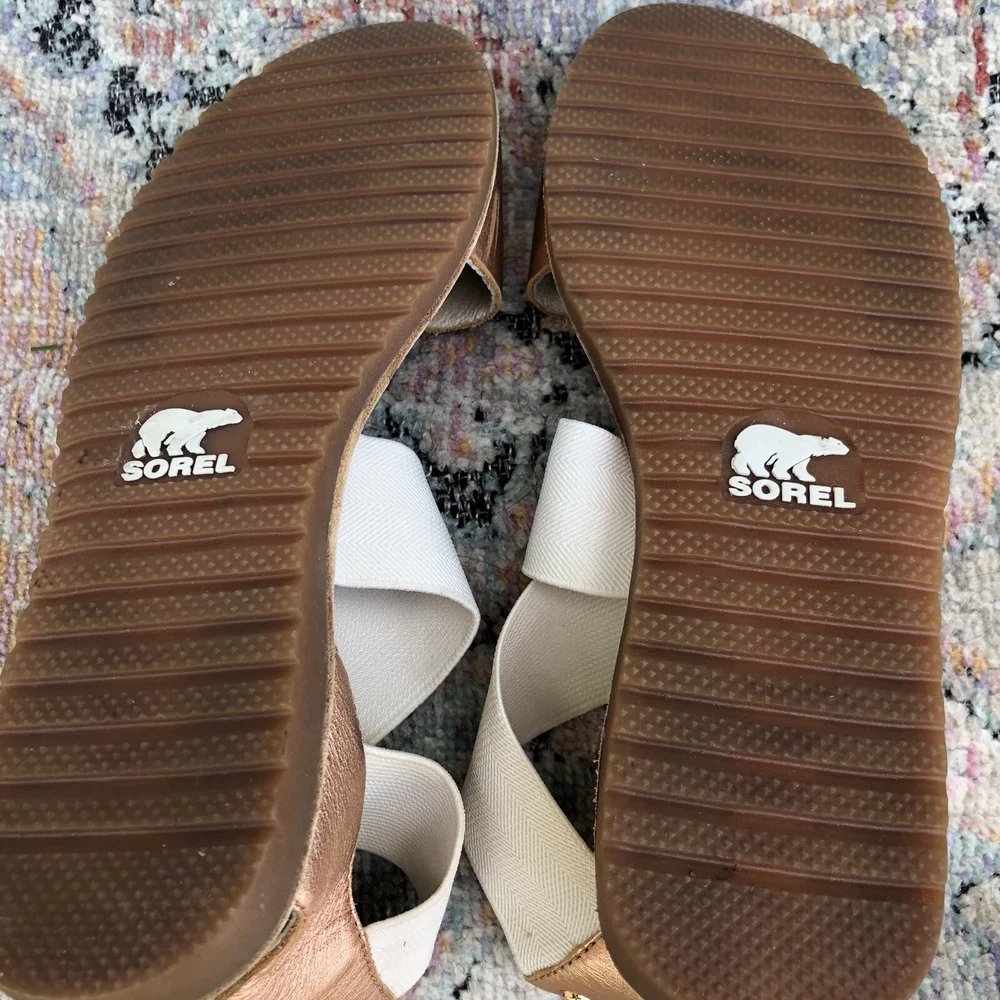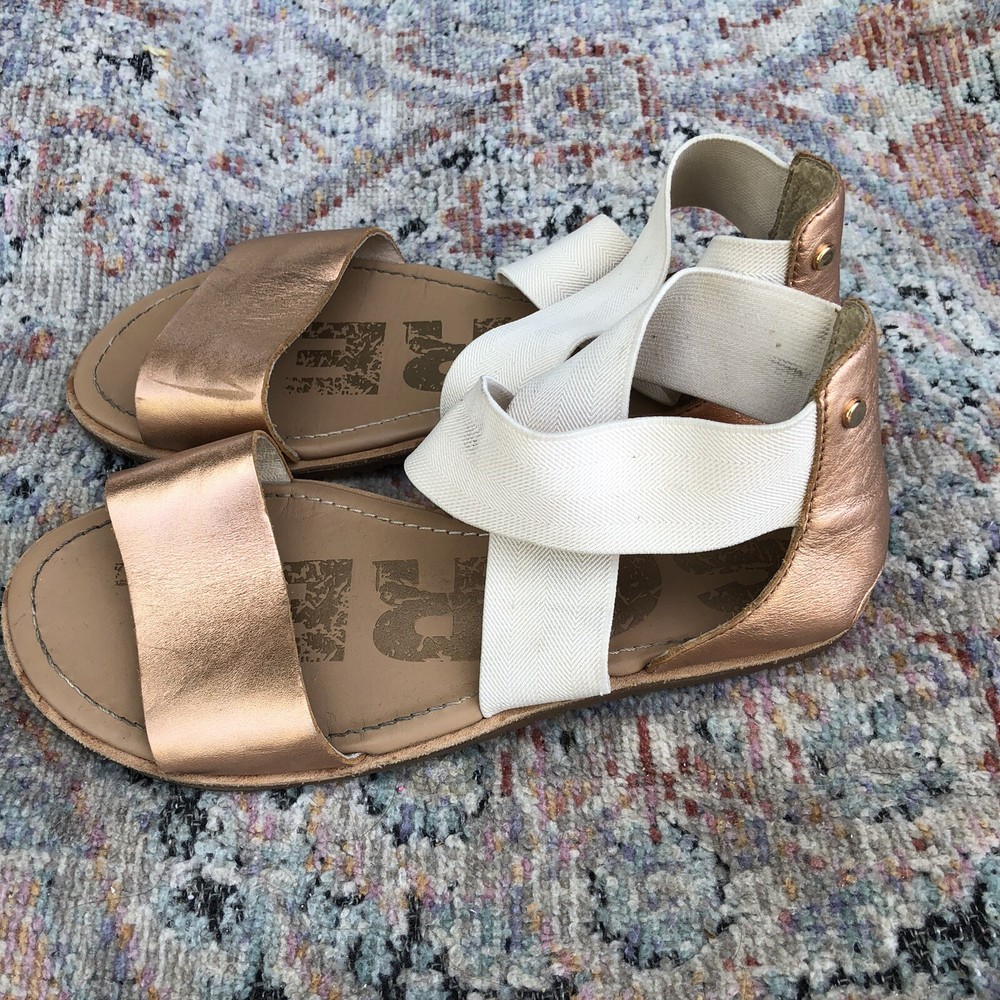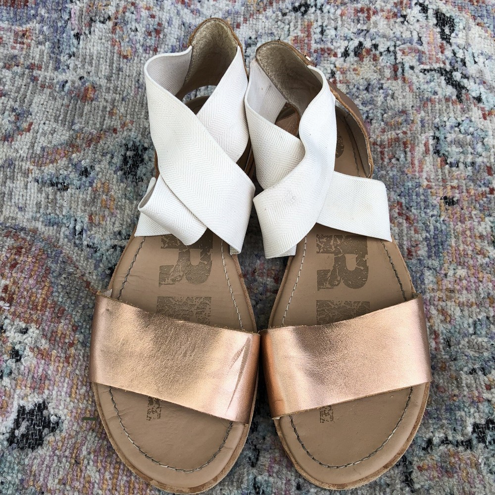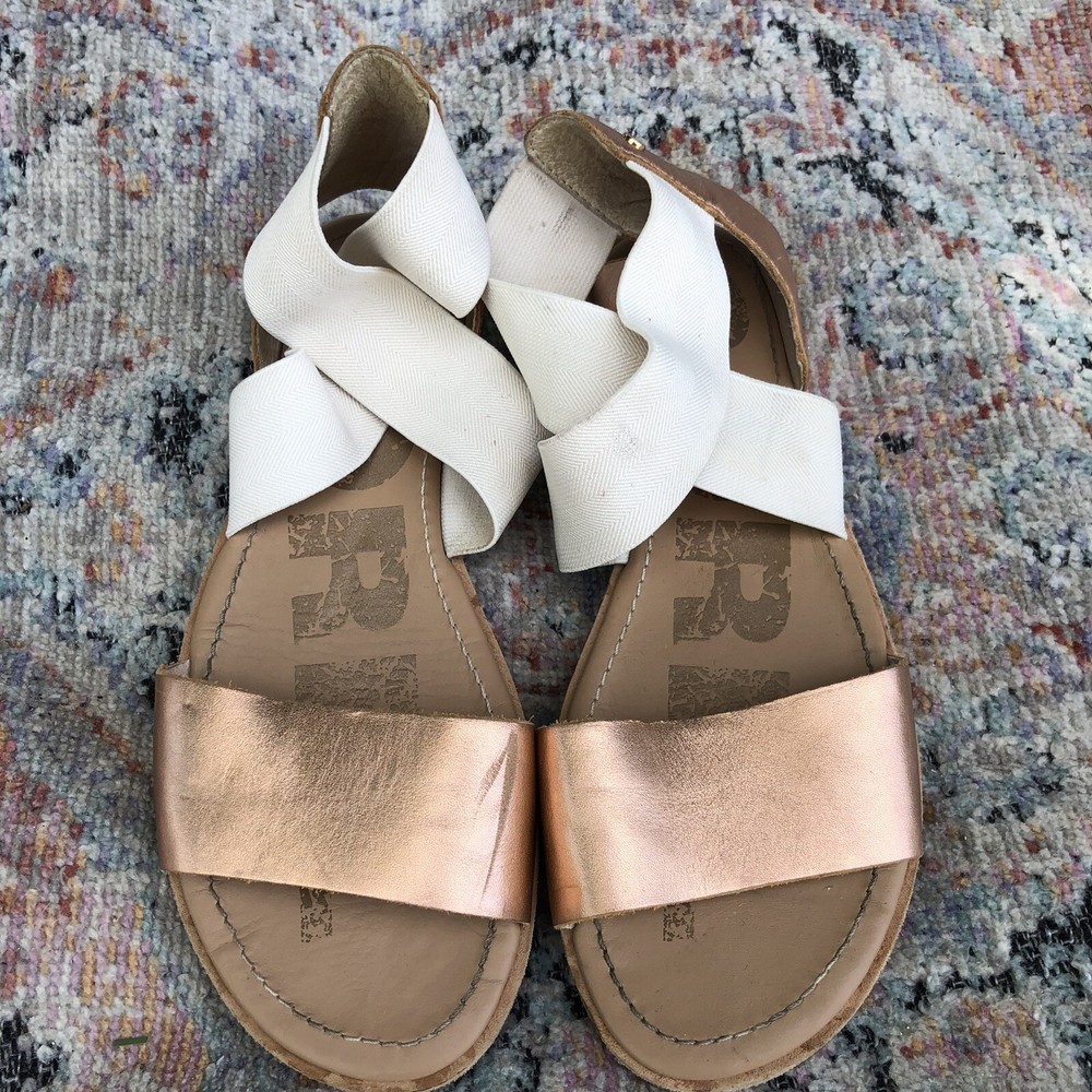 SOREL Beige Criss Cross Elastic Metallic Leather Strap Flat Sandal Size 6.5. Has some scuff marks and wear.