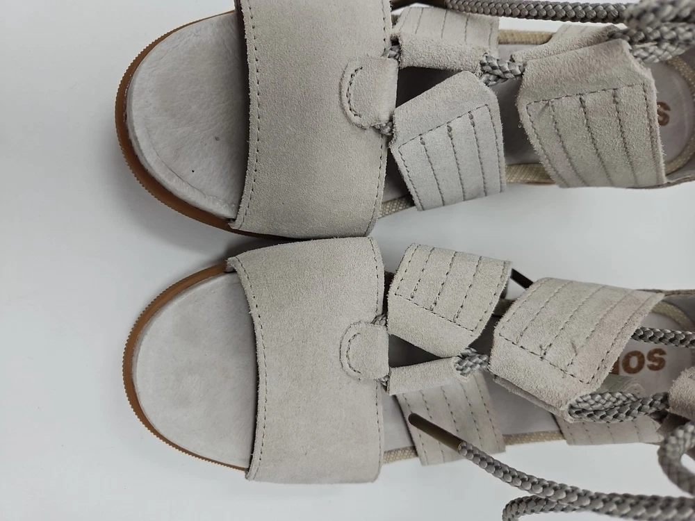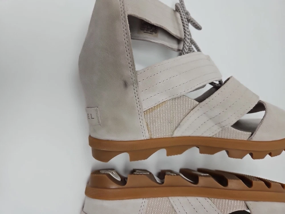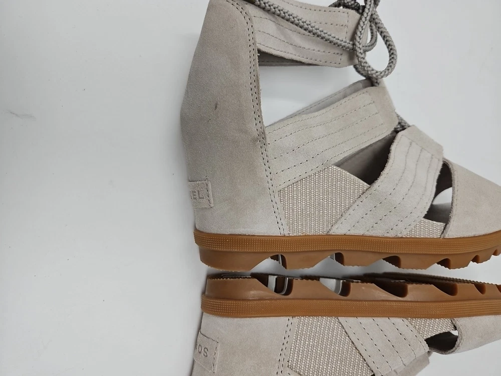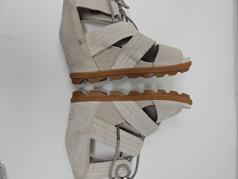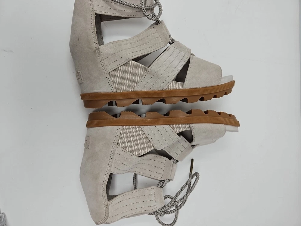 Embrace the effortless sophistication with the SOREL Joanie II sandal, a perfect blend of style and comfort for the discerning woman. These tan wedge sandals, crafted from premium nubuck leather, offer a sleek gladiator-inspired design that complements any casual or party ensemble. The breathable lining and memory foam insole ensure your feet stay cool and comfortable throughout the day, while the adjustable lace-up closure provides a secure fit. With a versatile beige color that transitions smoothly from spring to summer to fall, the Joanie II is a reliable companion for various occasions, from a casual stroll to a chic cocktail party. The durable rubber outsole offers stability and grip on diverse terrains, making these sandals a practical choice for travel or everyday wear. Experience the fusion of fashion-forward accents like the embossed logo and delicate lace detailing with the functional features that make the SOREL Joanie II a standout addition to your footwear collection.