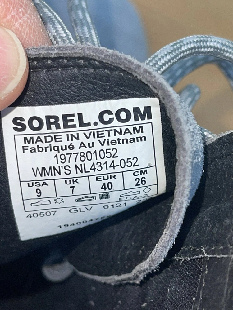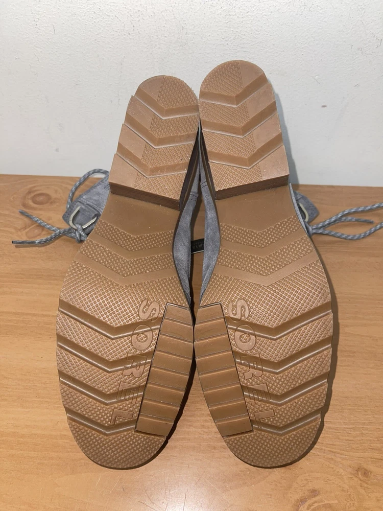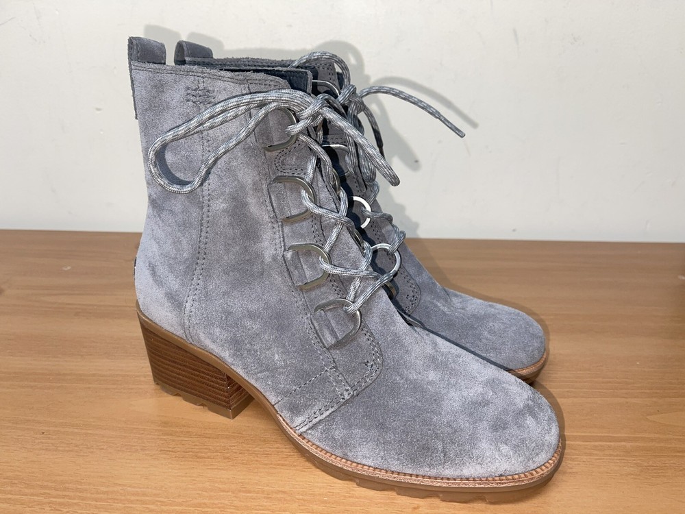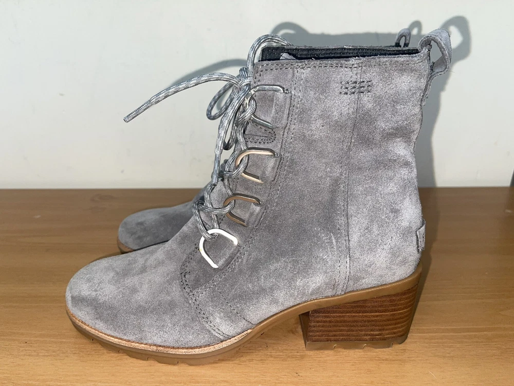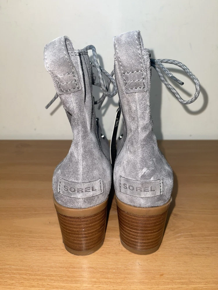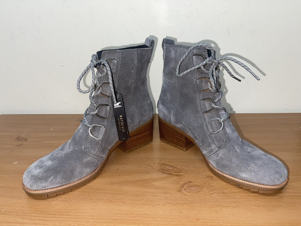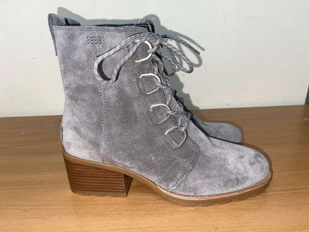 Elevate your shoe game with these stylish SOREL Women's Suede Cate Lace Booties. These waterproof leather boots in gray color are perfect for travel, casual outings, workwear, and business meetings. The round toe shape and low block heel style provide comfort and arch support, while the lace-up closure and eyelet logo accents add a touch of sophistication. Made with high-quality suede material and lined with canvas, these boots are both durable and stylish. The SOREL brand is known for its superior quality, making these boots a great investment for any wardrobe. Get ready to step out in style with these trendy booties! New without box. Shipped with USPS ground advantage.