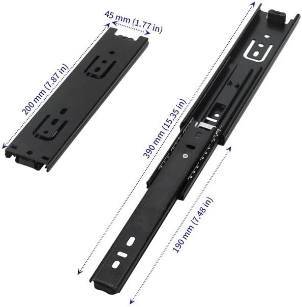 SOUJAP 6 PCS 8 Inch Full Extension Drawer Slides, 8 x 1.8 x 0.5 inch, Black Product Details Drawer Type: Ball Bearing Slide, Side Mount Manufacturer: SOUJAP Number of Items: 6 Part Number: 2302006 Item Weight: 2.59 pounds Product Dimensions: 7.87 x 1.77 x 0.49 inches Item model number: 2302006 Size: 8 x 1.8 x 0.5 inch Finish: Powder Coated Included Components: 6 x 8 inch drawer slides Batteries Included?: No Batteries Required?: No Color: Black Material: Alloy Steel Brand: SOUJAP Finish Type: Powder Coated Mounting Type: Side Mount MATERIAL - Our telescopic drawer slides are made of cold rolled steel material, carefully designed and manufactured, making them very smooth and quiet when parallel, making them the best choice for drawer slides. SIZE - Our packaging includes a total of 6 pieces of side mount drawer slides, totaling 3 pairs, each measuring 8 x 1.8 x 0.5 inches / 200 x 45 x 12.5mm, with an extension length twice that of when closed. EASY TO INSTALL - Each 8 inch drawer slides is also equipped with screws. You only need to align the pulley with the inside of the drawer and fix it with screws, and it is equipped with a shackle to easily and quickly connect or remove both slide rails. The slide rail is also designed with a self locking switch inside, which can effectively prevent automatic opening. WIDELY USED - When your furniture has been used for too long and the drawers are not sliding smoothly, our telescopic ball bearing slide is your best choice. It can also be widely used in kitchen cabinets, offices, shops, and bedrooms. HASSLE-FREE SHOPPING - Once you purchase our 8 inch drawer slides, you are entitled to a 30 day worry-free refund. Or if you have any questions or doubts about the product, please feel free to email us. We will get back to you as soon as possible. Description ABOUT US:We are committed to providing our customers with brand new and useful products. Customer satisfaction is backed by high quality products and perfect after-sales service. We take this as our company guideline. Try shopping at SOUJAP now, we won't let you down! PRODUCT FEATURES:1.The telescopic drawer slides is made of cold rolled steel material, which is sturdy, durable, and has a longer service life. 2.You will receive 6pcs side mount drawer slides, each measuring 8 x 1.8 x 0.5 inch / 200 x 45 x 12.5mm. 3.The installation of the 8 inch drawer slides is very simple, and it is equipped with a quick buckle, making connection and disassembly very convenient. 4. The telescopic ball bearing slide can be widely used in kitchen cabinets, drawers, office tables, and more. SPECIFICATIONS: Material: cold rolled steel Size: 8 x 1.8 x 0.5 inch / 200 x 45 x 12.5mm Color: black Quantity: 6 x 8 inch drawer slides