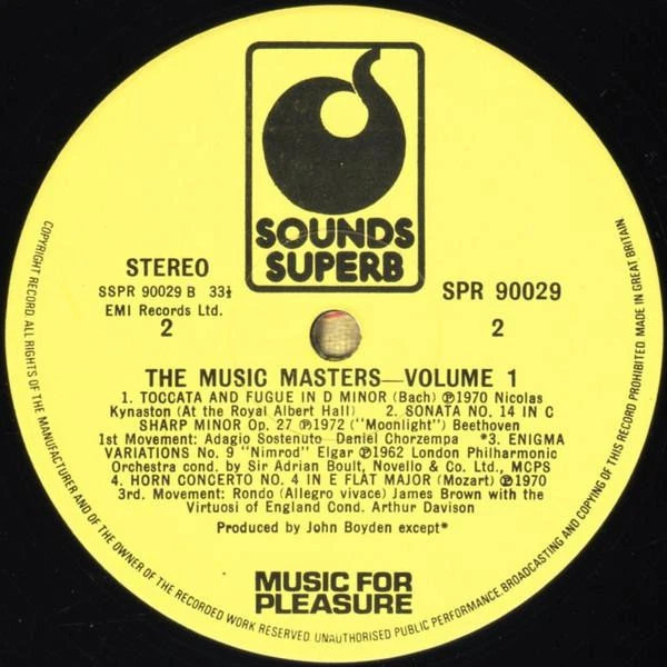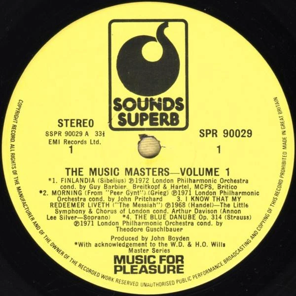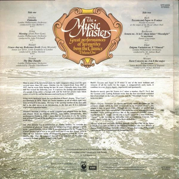 GRADING Our Grading System The table below is an overview of how our grading system works. The first grade is for the sleeve and second grade is for the media/disc, e.g. VG+/EX means that the item's sleeve is in Very Good Plus condition and the media/disc is in Excellent condition. If there is only one condition, e.g. /EX, it means that the item is not in a picture sleeve and that the media/disc is in excellent condition. Records that aren't in picture sleeves will either be in a company sleeve or a generic plain sleeve. If you have any questions, please get in touch. Condition Sleeve Media MINT (10/10) Mint, perfect Mint, perfect EX+ (9/10) Excellent plus, near mint Excellent plus, near perfect EX (8/10) Excellent, well looked after, clean, only slight signs of use Excellent, well looked after, clean, only slight signs of use EX- (7/10) Excellent minus, light wear and signs of use Excellent minus, light wear and signs of use VG+ (6/10) Very good plus, some moderate wear Very good plus, some scuffs, no deep marks VG (5/10) Very good, well used and worn Very good, well used and marked VG- (4/10) Very good minus, very worn Very good minus, very worn and marked GOOD (3/10) Good, some major wear Good, some major wear and scuffing FAIR (2/10) Fair, major wear Fair, major wear and scuffing POOR (1/10) Poor, severe wear Poor, severe wear and scuffing DELIVERY Combined Postage If you add all the items you wish to purchase from us to your shopping basket/cart, and then go to the checkout page from the shopping basket page, the shipping cost will be automatically combined. Packaging All of our items are parcelled using strong specially designed packaging, each vinyl in an order is placed in a clear plastic sleeve and plain paper white sleeve, and is separated from its cover (unless it is advertised as sealed), to prevent any damage during transit. If an item is sealed, and you would prefer the vinyl to be placed outside of its sleeve before dispatch, please let us know. Prices You can see all delivery options and prices for an item on the "Postage and payments" tab. Tracked delivery If you wish to have a tracking number with your order, please select the "Signed" or "Express" delivery option, "Standard" delivery does not include a tracking number. SHOP Click here to view our Ebay shop, with over 200,000 items in stock FAQ Does a used item include the original inner sleeve/insert/poster etc.? We will always include in the description if a used item includes any additional parts, e.g. "with inner" or "includes poster", if you know an item originally came with any additional parts, such as a printed inner sleeve, and it isn't mentioned in the description, then generally the used item won't include it, but please feel free to ask. New items will always be complete, unless otherwise specified. CATEGORIES Shop Home 10" Vinyl Records 12" Vinyl Records 7" Vinyl Records Cassettes (Tape) CDs (Compact Discs) LP Vinyl Records Music Memorabilia Other Artist Various Artists Title Music Masters Volume One Format LP Vinyl Country UK Label Sounds Superb Catalogue Number SPR90029 Description 8 track vinyl lp Condition (Sleeve/Disc) EX-/EX- Track List A1. Jean Sibelius - Finlandia A2. Edvard Grieg - Morning A3. Georg Friedrich Händel - I Know That My Redeemer Liveth A4. Johann Strauss Jr. - The Blue Danube B1. Johann Sebastian Bach - Toccata And Fugue In D Minor B2. Ludwig van Beethoven - Sonata No. 14 In C Sharp Minor "Moonlight" 1st Movement B3. Sir Edward Elgar - Enigma Variation No. 9 "Nimrod" B4. Wolfgang Amadeus Mozart - Horn Concerto No. 4 In E Flat Major 3rd Movement DELIVERY INFORMATION If you wish to have a tracking number with your order, please choose the Signed or Express delivery option, the Standard delivery option does not include a tracking number. Please note, the Express option for delivery outside of the UK includes a tracking number, but has the same delivery time as the Standard option. WE HAVE MORE VARIOUS ARTISTS ITEMS IN STOCK We have more items in stock by this artist, click here to see them. ABOUT US Vinyl Tap has been in the business of selling music for over 30 years, and in that period we have supplied many thousands of collectors and music fans around the globe with vinyl, CDs and music memorabilia. You can check out the over 200,000 items that we have in stock on our Ebay shop, here . Artist: Various Artists - Title: Music Masters Volume One - Format: LP Vinyl - Country: UK - Label: Sounds Superb - Catalogue Number: SPR90029 - Year: - Description: 8 track vinyl lp