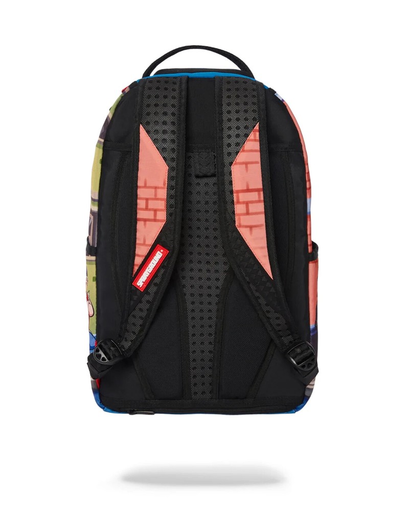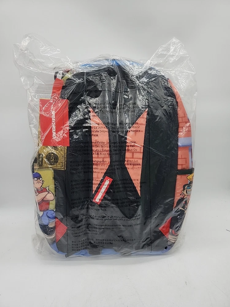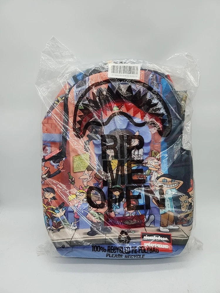 This is a Sprayground Hey Arnold Anniversary Backpack (DLXR) in a large size, designed for unisex adults. It features a multicolor design with faux leather and polyester materials. The backpack is part of the Sprayground brand and is styled with the iconic Hey Arnold theme. DLXR = 100% RECYCLED POLYESTER FABRIC PRODUCT DETAILS Exterior Dimensions: 18" x 6" x 11.5" ∙ Front zipper pocket ∙ Side pockets ∙ Zippered Stash pocket ∙ Ergonomic mesh back padding ∙ Adjustable Straps for custom sizing ∙ Nylon Zippers with Metal Hardware ∙ Metal "Sprayground Authentic" badge ∙ Slide through back sleeve connects to Carry on luggage to free your hands Interior Separate Laptop compartment ∙ Separate Velour sunglass compartment ∙ Mesh organizer pocket Fabric Durable 900D Poly water-resistant fabric 100% RECYCLABLE MATERIAL