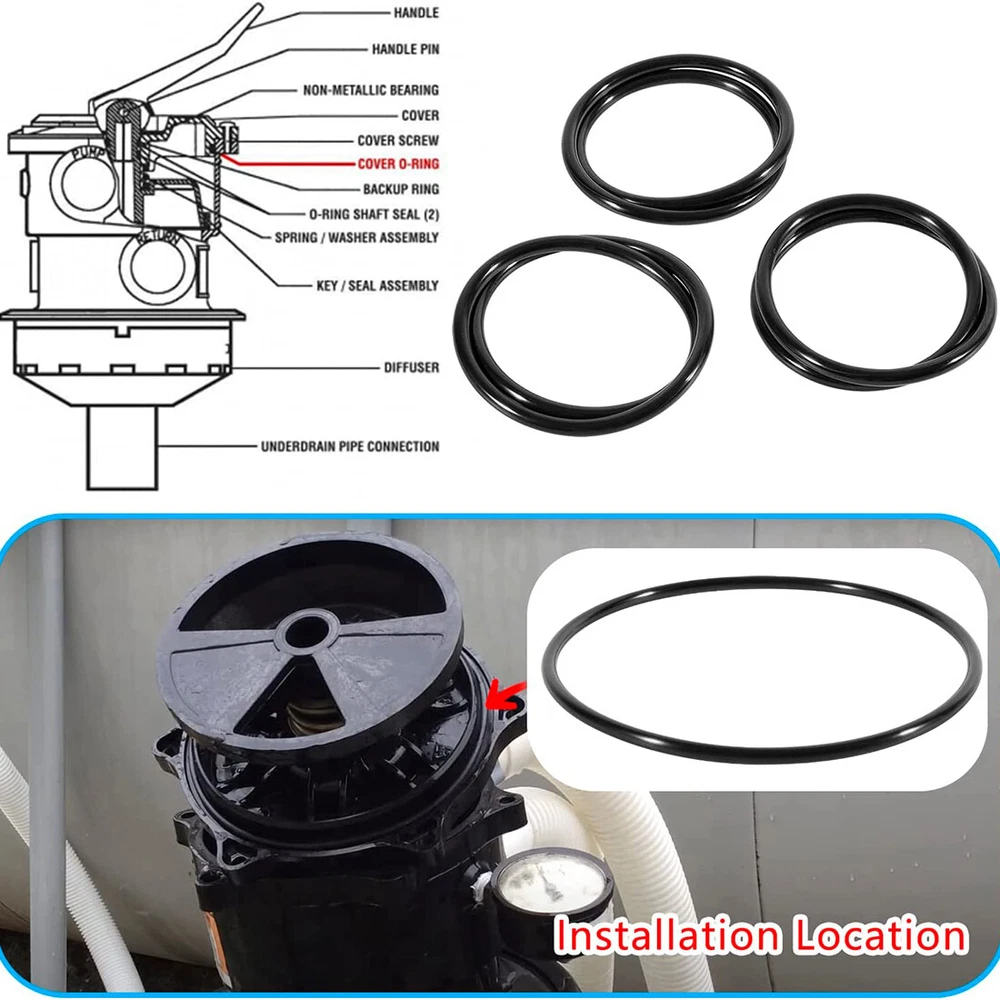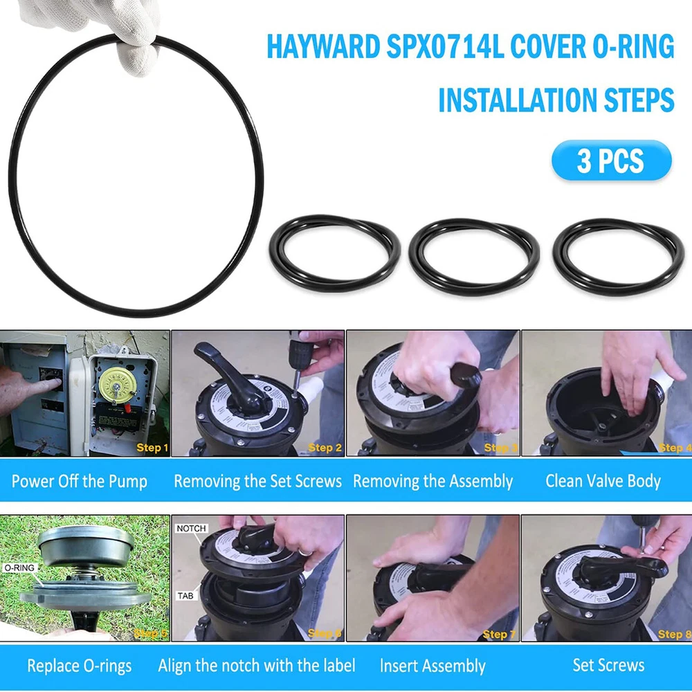 Fitment: Compatible Models: SPX0714L Cover O-Ring Fits for Hayward 1.5" Vari-Flo XL Valve SP0714T O-336. SPX0714L Cover O-ring for Hayward Multiport Valves and Sand Filter Systems. Fits Hayward Pro Series Sand Filters, Models S180T, s210T, S220T, S244T. Fits Hayward SandMaster Sand Filters, Models SM1700T, SM1900T, SM2300T. Fits pro and vl series pool sand filter system models s270t, s210t, 93sft. Features: 1) Replaces Part Number # SPX0714L O-336 SP0714T 2) Made of high-quality rubber material, not easy to age and break, resistant to high temperature and low temperature, and durable 3) A set of three SPXO714L cover O-rings. Replacement part number: SPXO714L. Installation is relatively simple and there are no complicated steps. When disassembling, just drain the water first, then remove the old seal and install the new one 4) Thickness approx 3/16" x Inside Diameter approx 5-1/2" x Outside Diameter approx 6" Package included: 3 x SPX0714L cover o-ring