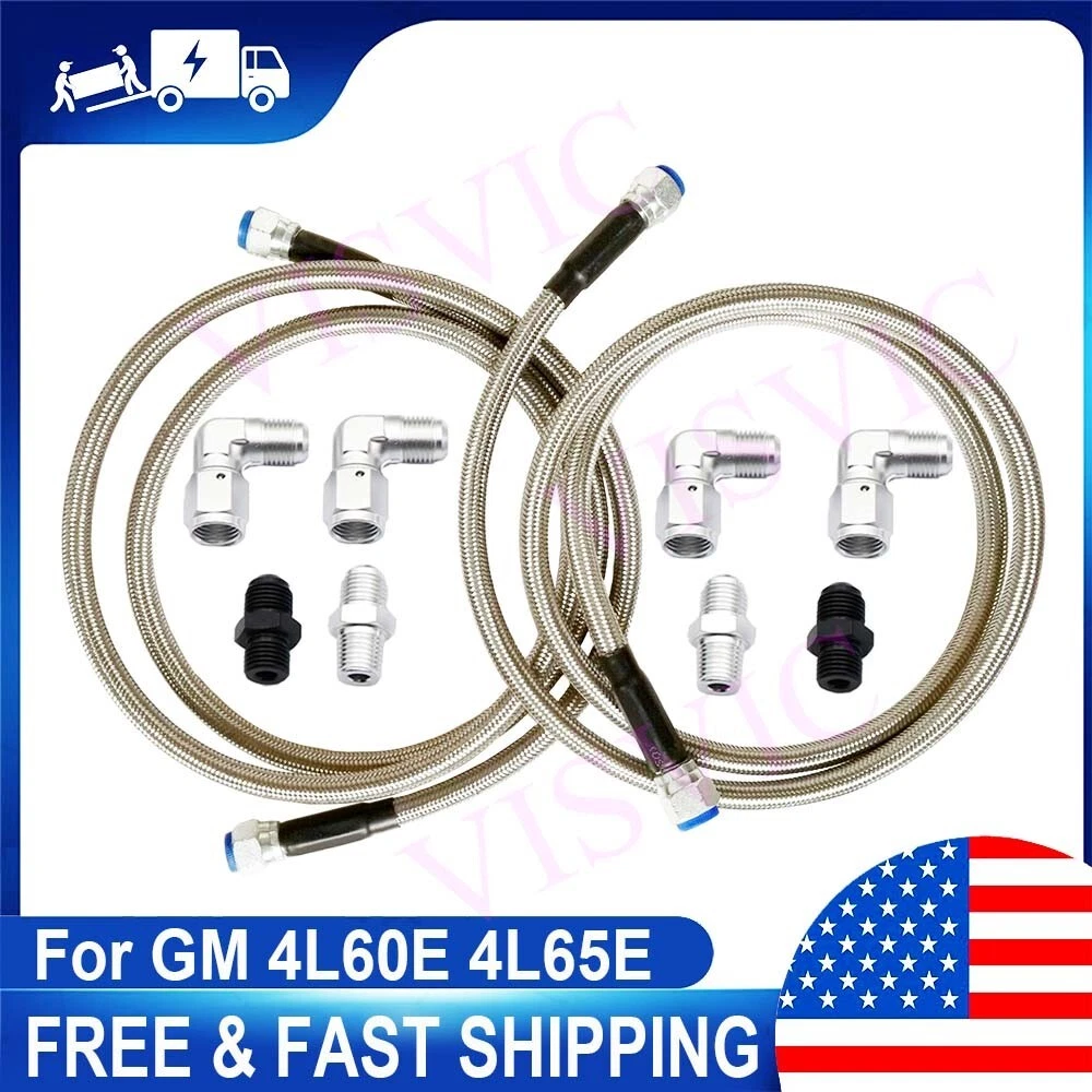 Item Description: Fiber & SS braided transmission hoses/ lines, with Stainless Steel Wire used in Middle Layer; ID 3/8" hoses are about 55" & 58” long respectively with AN-6 inverted flare ends. Package Includes: (2) Inner diameter 3/8” hoses with around 55" & 58” length respectively; (4)90 degree adapters/fittings; (2) 1/4” NPS to -6AN transmission fittings; (2) 1/4” NPT to -6AN radiator fittings. Please check pictures for more details. Please check Radiator fitting sizes prior to ordering since some fittings sizes are differ from above listed ones. Thank you! We'll provide extra fittings if needed.