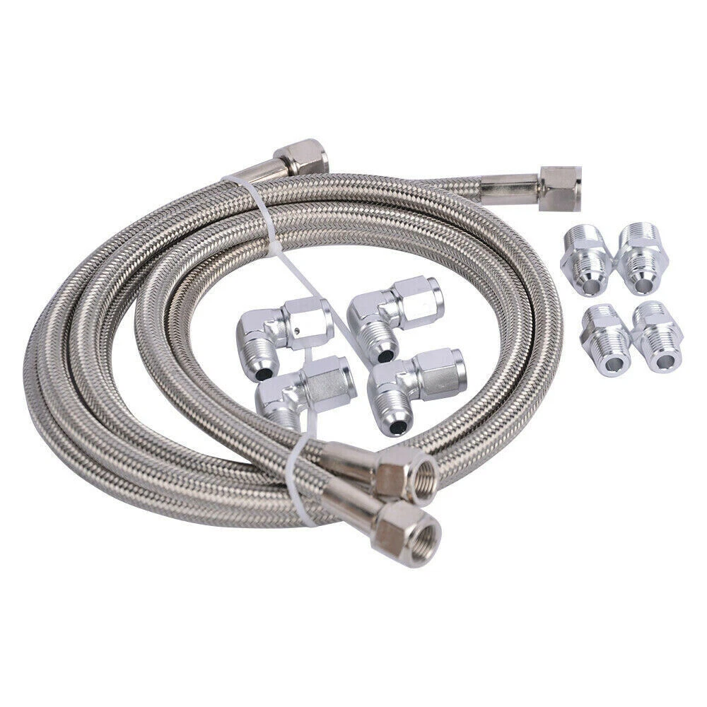 Item Description: Fiber & SS braided transmission hoses/ lines, with Stainless Steel Wire used in Middle Layer; ID 3/8" hoses are about 55" & 58” long respectively with AN-6 inverted flare ends. Package Includes: (2) Inner diameter 3/8” hoses with around 55" & 58” length respectively; (4)90 degree adapters/fittings; (2) 1/4” NPS to -6AN transmission fittings; (2) 1/4” NPT to -6AN radiator fittings. Please check pictures for more details. Please check Radiator fitting sizes prior to ordering since some fittings sizes are differ from above listed ones. Thank you! We'll provide extra fittings if needed.