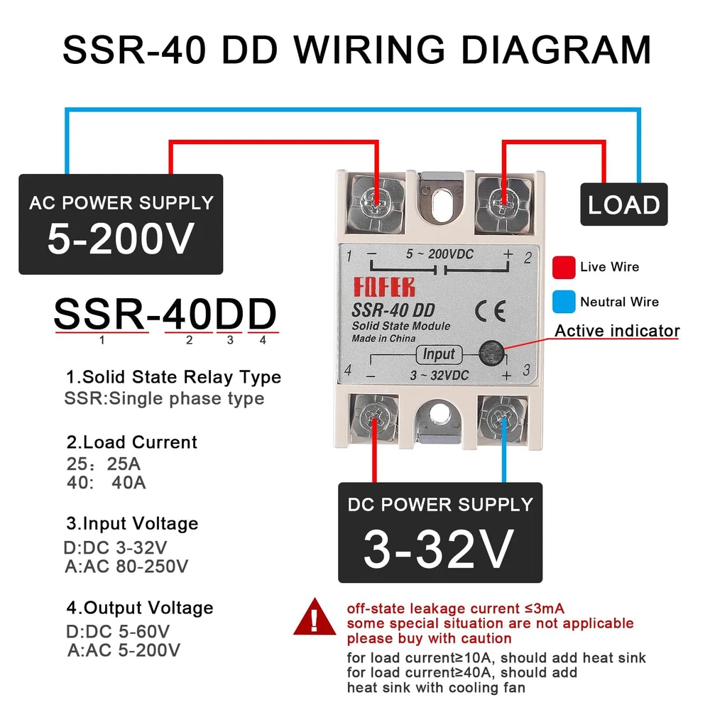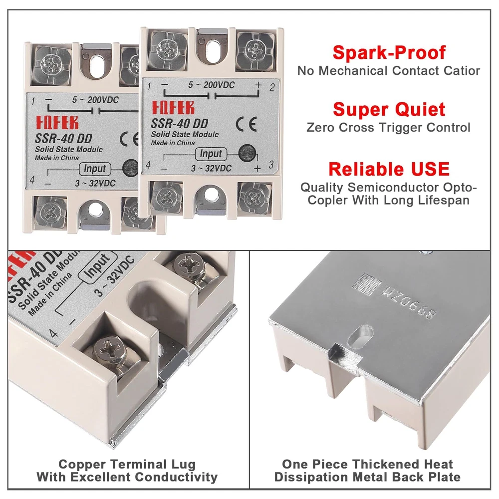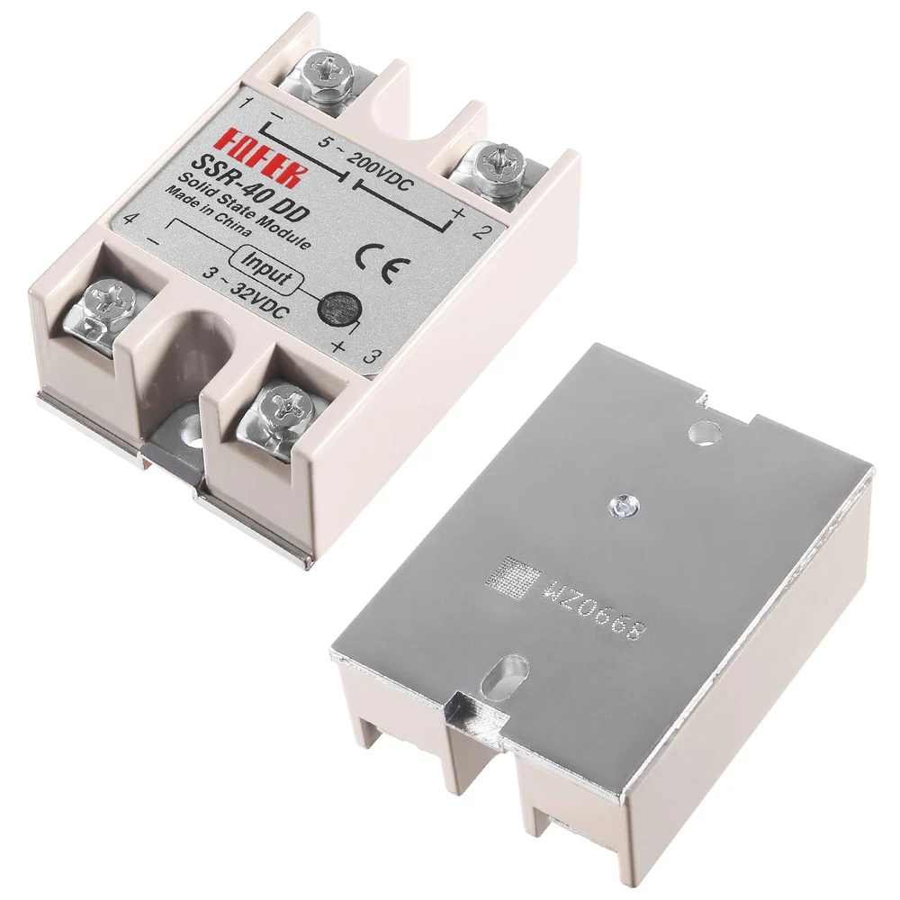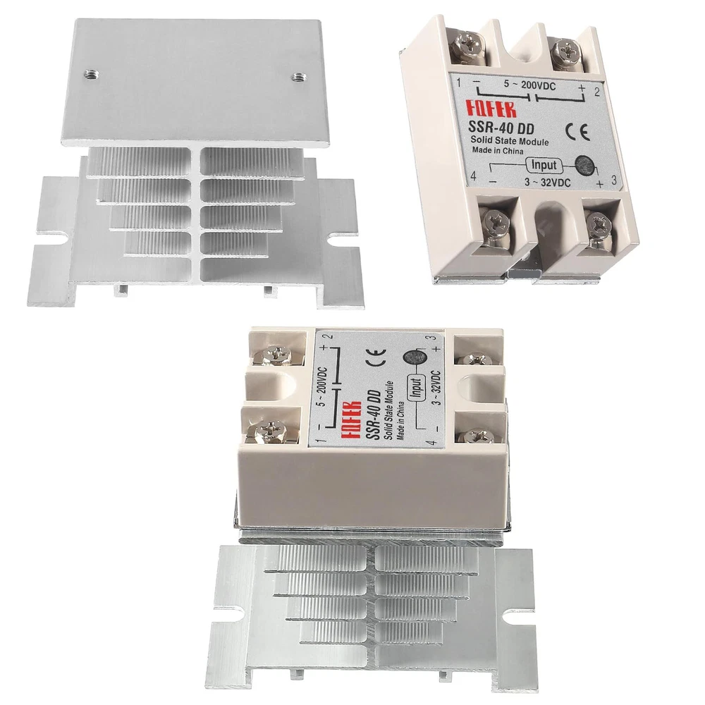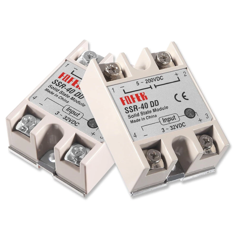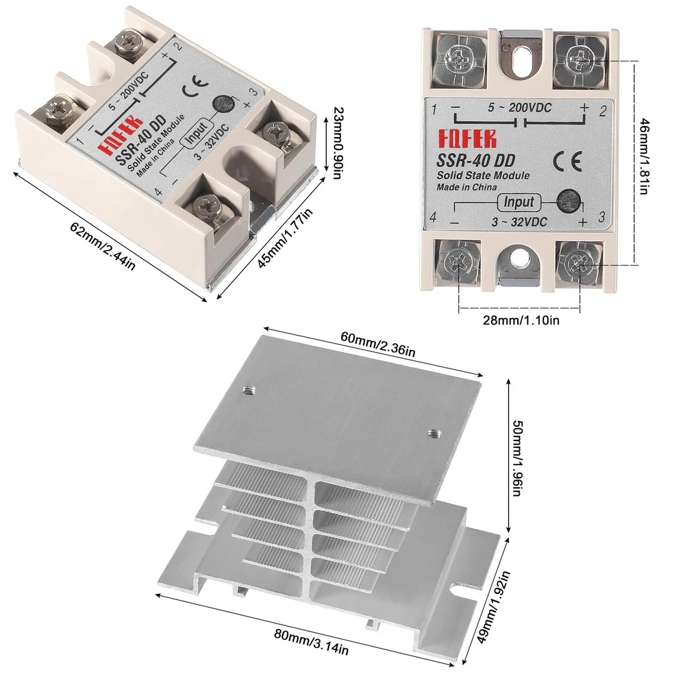 SSR-40DD Solid State Relay 40A DC to DC Input 3-32V Output 5-200V with Heat Sink 【Model】SSR-40DD 40A Solid State Relay Module. 【SSR-40DD Parameter】solid state relay module SSR-40DD, 3-32VDC/5-60VDC ; Current :40A. 【DC to DC 40DD Relay Size】(L*W*H)62×45×24mm/2.48 x 1.73 x 0.94". 【SSR Application】No electric spark, no noise, high switching speed, especially suitable for corrosion, moisture, dust resistant and other harsh environments. Widely used in many automatic control systems. 【Package Content】 1 x SSR-40DD solid state relay module, 1 x heat sink. SSR-40DD solid state relay is ideal for automatic process control application, a must component for temperature controller and other machinery control system. High reliability, high efficiency and long lifespan, a great part for temperature controller and other machinery control system. Specification: Model: SSR-40DD Solid State Relay Control Voltage: 3-32VDC Min Control Current: 5mA Max Control Current: 25mA Load Voltage: 5-60V DC Load Current: 25A Control Method: DC to AC Insulation Resistance: 1000M Ohm/500VDC Off Leakage Current: ≤2mA On Voltage: ≤1.5V On off Time: ≤10ms Ambient Temperature: -20~+75℃ Mouting Method: Screw fixed Relative Humidity: ≤95%(Non-condensing) Relay Size: 6.2×4.5×2.4 cm; Heat Sink Size: 8 x 4.9 x 4.9cm(L*W*H) Package included: 1* SSR-40DD Solid State Relay + 1* Heat Sink Shipping We offer FREE shipping on all orders! We ship within Three business days of payment, usually sooner. We use a selection of shipping services such as UPS, FedEx, USPS etc. We only ship to the lower 48 states, no APO/FPO addresses or PO Boxes allowed. Local pickups and combined shipping options are not provided at this time. Return You can return a product for up to 30 days from the date you purchased it. Any product you return must be in the same condition you received it and in the original packaging. Please keep the receipt. Payment We accept payment by any of the following methods: PayPal Please pay as soon as possible after winning an auction, as that will allow us to post your item to you sooner! Feedback Customer satisfaction is very important to us. If you have any problem with your order, please contact us and we will do our best to make you satisfied. Contact Us If you have any queries, please contact us via ebay. We usually respond within 24 hours on weekdays. Please visit our eBay store to check out other items for sale! Thank you for shopping at our store.