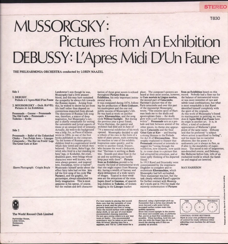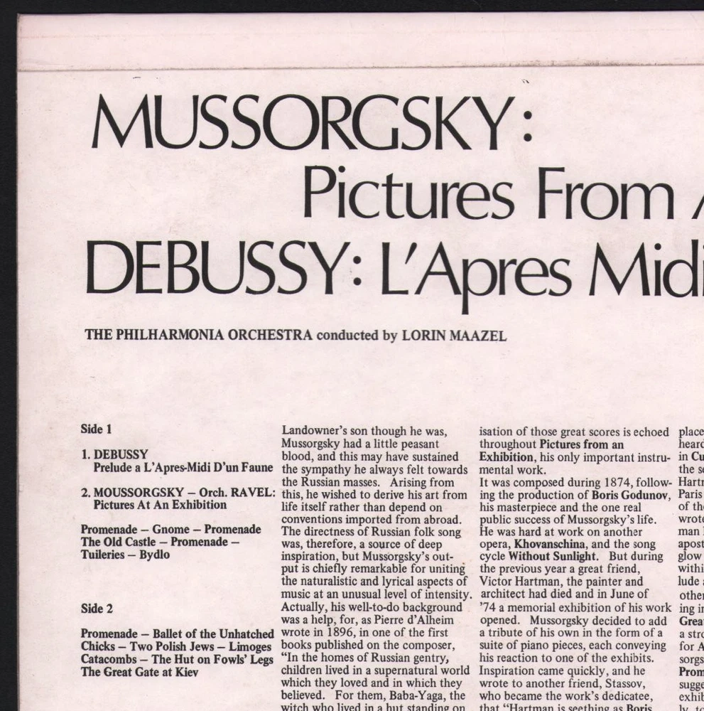 GRADING Our Grading System The table below is an overview of how our grading system works. The first grade is for the sleeve and second grade is for the media/disc, e.g. VG+/EX means that the item's sleeve is in Very Good Plus condition and the media/disc is in Excellent condition. If there is only one condition, e.g. /EX, it means that the item is not in a picture sleeve and that the media/disc is in excellent condition. Records that aren't in picture sleeves will either be in a company sleeve or a generic plain sleeve. If you have any questions, please get in touch. Condition Sleeve Media MINT (10/10) Mint, perfect Mint, perfect EX+ (9/10) Excellent plus, near mint Excellent plus, near perfect EX (8/10) Excellent, well looked after, clean, only slight signs of use Excellent, well looked after, clean, only slight signs of use EX- (7/10) Excellent minus, light wear and signs of use Excellent minus, light wear and signs of use VG+ (6/10) Very good plus, some moderate wear Very good plus, some scuffs, no deep marks VG (5/10) Very good, well used and worn Very good, well used and marked VG- (4/10) Very good minus, very worn Very good minus, very worn and marked GOOD (3/10) Good, some major wear Good, some major wear and scuffing FAIR (2/10) Fair, major wear Fair, major wear and scuffing POOR (1/10) Poor, severe wear Poor, severe wear and scuffing DELIVERY Combined Postage If you add all the items you wish to purchase from us to your shopping basket/cart, and then go to the checkout page from the shopping basket page, the shipping cost will be automatically combined. Packaging All of our items are parcelled using strong specially designed packaging, each vinyl in an order is placed in a clear plastic sleeve and plain paper white sleeve, and is separated from its cover (unless it is advertised as sealed), to prevent any damage during transit. If an item is sealed, and you would prefer the vinyl to be placed outside of its sleeve before dispatch, please let us know. Prices You can see all delivery options and prices for an item on the "Postage and payments" tab. Tracked delivery If you wish to have a tracking number with your order, please select the "Signed" or "Express" delivery option, "Standard" delivery does not include a tracking number. SHOP Click here to view our Ebay shop, with over 200,000 items in stock FAQ What is a "flipback" sleeve? A cover made from two parts: the front part - usually laminated and in colour - with a narrow fold-over on the reverse that is glued to the back part (which is usually not laminated and in black and white). They were often used for records in the 1950s and 60s. Does a used item include the original inner sleeve/insert/poster etc.? We will always include in the description if a used item includes any additional parts, e.g. "with inner" or "includes poster", if you know an item originally came with any additional parts, such as a printed inner sleeve, and it isn't mentioned in the description, then generally the used item won't include it, but please feel free to ask. New items will always be complete, unless otherwise specified. CATEGORIES Shop Home 10" Vinyl Records 12" Vinyl Records 7" Vinyl Records Cassettes (Tape) CDs (Compact Discs) LP Vinyl Records Music Memorabilia Other Artist Lorin Maazel / Philadelphia Orchestra Title Mussorgsky - Pictures At An Exhibition Format LP Vinyl Country UK Label World Music Catalogue Number ST830 Description 3 track stereo - flipback sleeve has 1" split middle of bottom seam and stereo sticker on back Condition (Sleeve/Disc) VG+/EX DELIVERY INFORMATION If you wish to have a tracking number with your order, please choose the Signed or Express delivery option, the Standard delivery option does not include a tracking number. Please note, the Express option for delivery outside of the UK includes a tracking number, but has the same delivery time as the Standard option. ABOUT US Vinyl Tap has been in the business of selling music for over 30 years, and in that period we have supplied many thousands of collectors and music fans around the globe with vinyl, CDs and music memorabilia. You can check out the over 200,000 items that we have in stock on our Ebay shop, here . Artist: Lorin Maazel / Philadelphia Orchestra - Title: Mussorgsky - Pictures At An Exhibition - Format: LP Vinyl - Country: UK - Label: World Music - Catalogue Number: ST830 - Year: - Description: 3 track stereo - flipback sleeve has 1" split middle of bottom seam and stereo sticker on back