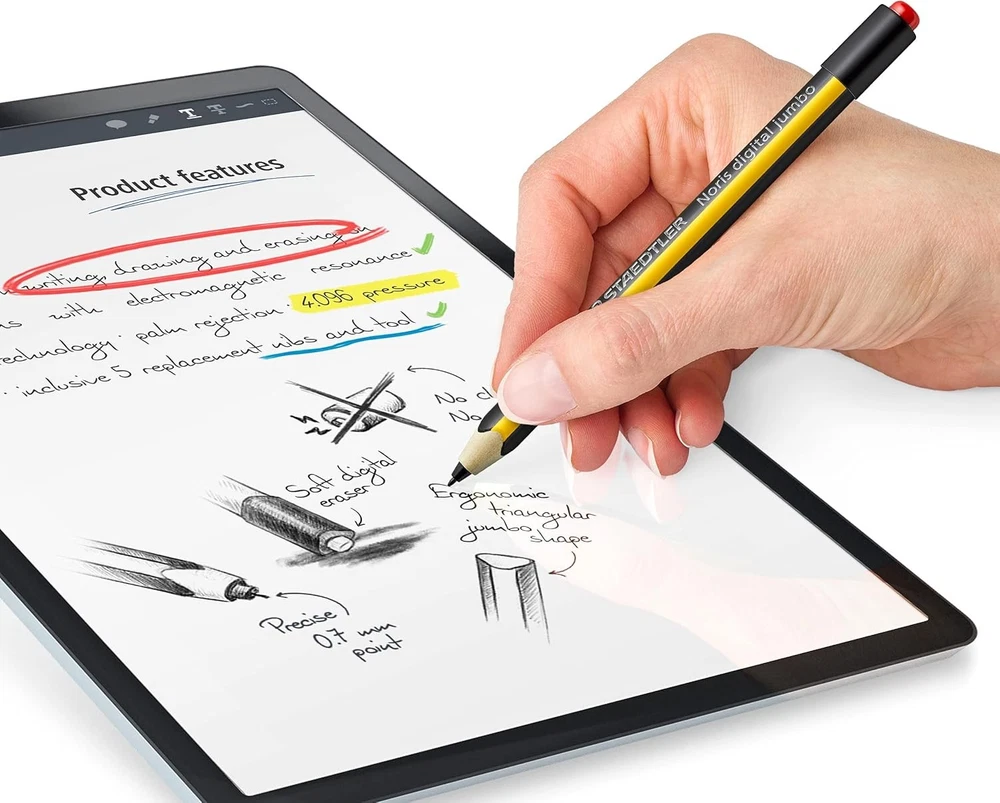 STAEDTLER Noris jumbo 180J 22. EMR Stylus with soft eraser. For yellow-black Product Details Brand: STAEDTLER Series: Staedtler Noris digital jumbo 180J 22 Item model number: STAEDTLER Noris Digital Jumbo 180J Item Weight: 0.353 ounces Product Dimensions: 5.51 x 0.36 x 0.36 inches Item Dimensions LxWxH: 5.51 x 0.36 x 0.36 inches Color: yellow-black Battery Type: Alkaline Manufacturer: STAEDTLER Language: English, English, English, English, English Color: yellow-black Brand: STAEDTLER Material: Wood Item Weight: 10 Grams Battery Average Life Standby: 50 Hours Compatible Devices: Please check the compatible devices listed in the "Compatibility Guide (PDF)" Item dimensions L x W x H: 5.51 x 0.36 x 0.36 inches Are Batteries Included: No Batteries Required?: No Battery Description: Alkaline Stylus in an ergonomic triangular jumbo pencil shape which provides a very natural writing and drawing experience on all compatible devices with EMR Technology No empty batteries or annoying cables: The stylus does not need a battery and so never needs to be charged; it does not need to be paired with your device or require a driver to be installed IMPORTANT: Please check the compatible devices listed in the PDF "Application Guide" which you can find under the product guides and documents; Noris digital is not compatible with Apple devices Palm Rejection: Thanks to the enhanced EMR technology just the tip of the pencil is recognized and the palm of your hand will be ignored 4,096 pressure levels: The line width is adjustable depending on the pressure when writing/drawing STAEDTLER Noris digital jumbo 180J 22 - Stylus for digital writing, drawing and erasing on EMR equipped displays The Noris digital jumbo allows you to write, draw and erase straight onto your touchscreen tablets, smartphones and notebooks if they are equipped with EMR technology. The stylus combines the look and feel of a traditional pencil with the technology of WACOM, offering you the advantages of both. The Noris digital is compatible with a variety of smartphones, tablets and notebooks with EMR technology. Please refer to the PDF "Application Guide (PDF)" which you can find under "Product guides and documents". Product features: EMR technology of WACOM (electromagnetic resonance) Comfortable thick triangular shape which is particularly suitable for children's hands and is also comfortable for adults, and allows you to write without your hand getting tired Non-slip soft surface 4,096 pressure levels Palm Rejection Adjustable line width depending on the pressure when writing/drawing Precise, replaceable 0.7 mm pencil point No batteries needed No pairing or driver installation Dimensions: Approximately 140 x 9.1 mm Weight: Approximately 10 g WOPEX wood-based material Made In Germany Scope of delivery: One STAEDTLER Noris digital jumbo Stylus with a soft digital eraser, five spare nibs and a replacement tool; Noris digital is not compatible with Apple devices; Note:-It is important to check if the end device has an EMR digitizer in the display before purchasing to make sure the Noris digital will work on the end device. Compatibility list:
