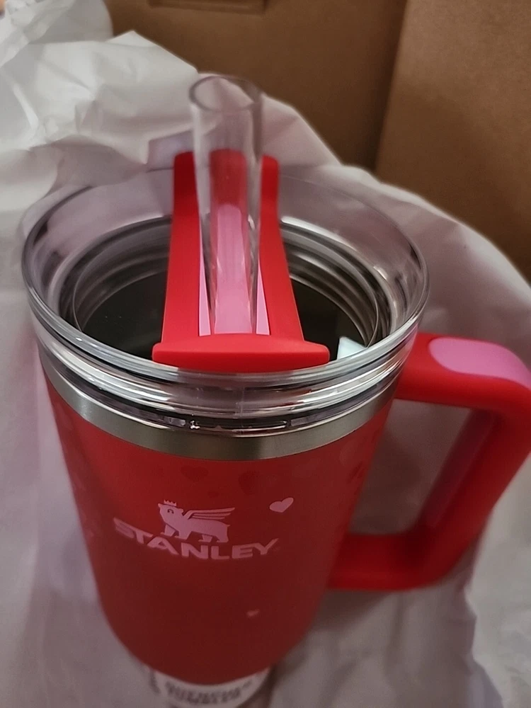TARGET LIMITED EDITION Valentine's Day with the Stanley 40oz H2.0 Flowstate Quencher Tumbler in a beautiful Ruby Hearts pattern. RED TUMBLER HARD TO FIND 40 OZ This tumbler is perfect for enjoying your favorite hot or cold beverages on the go. Made with high-quality stainless steel, plastic, and BPA-Free Plastic, this tumbler is break and chip-resistant, freezer safe, and suitable for hot beverages. The tumbler comes with a drink-through lid, a straw, and a handle for easy sipping and carrying.