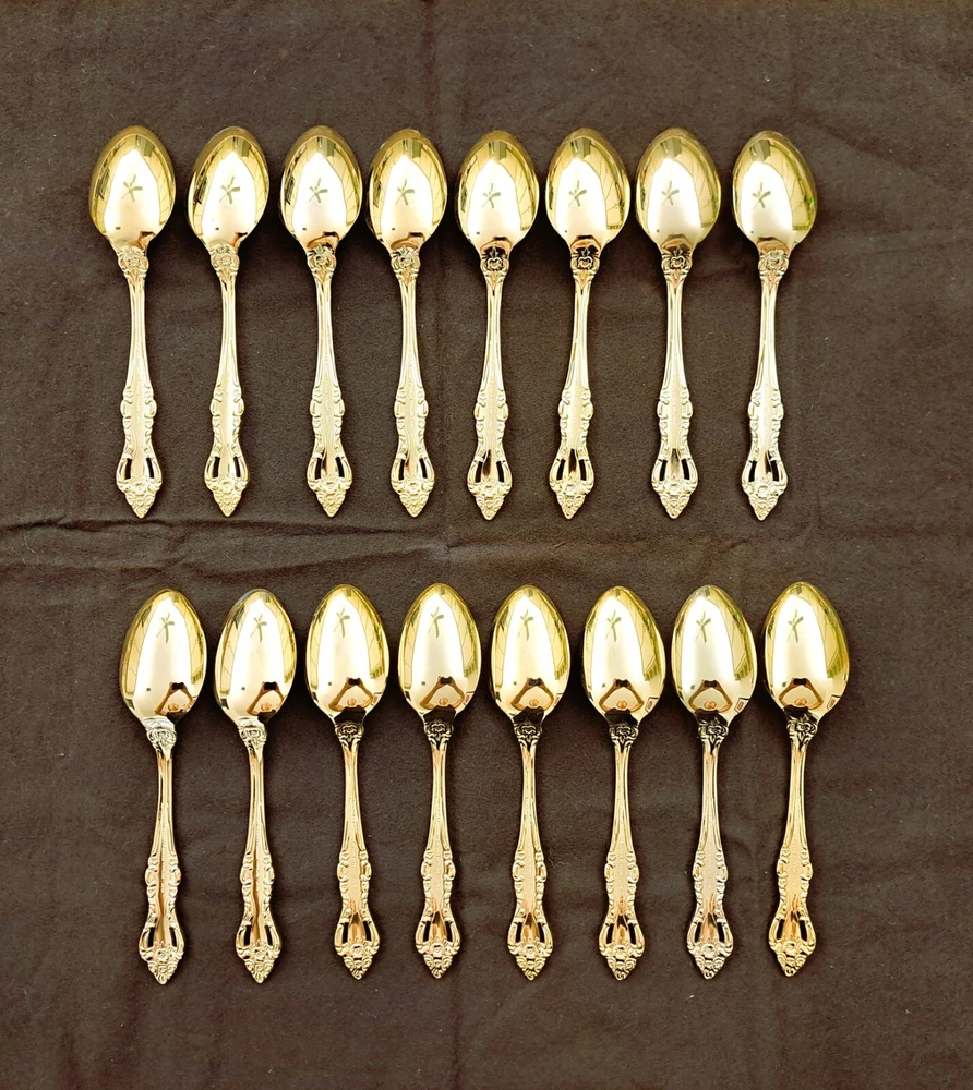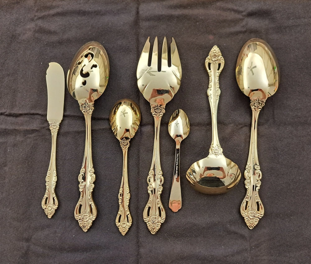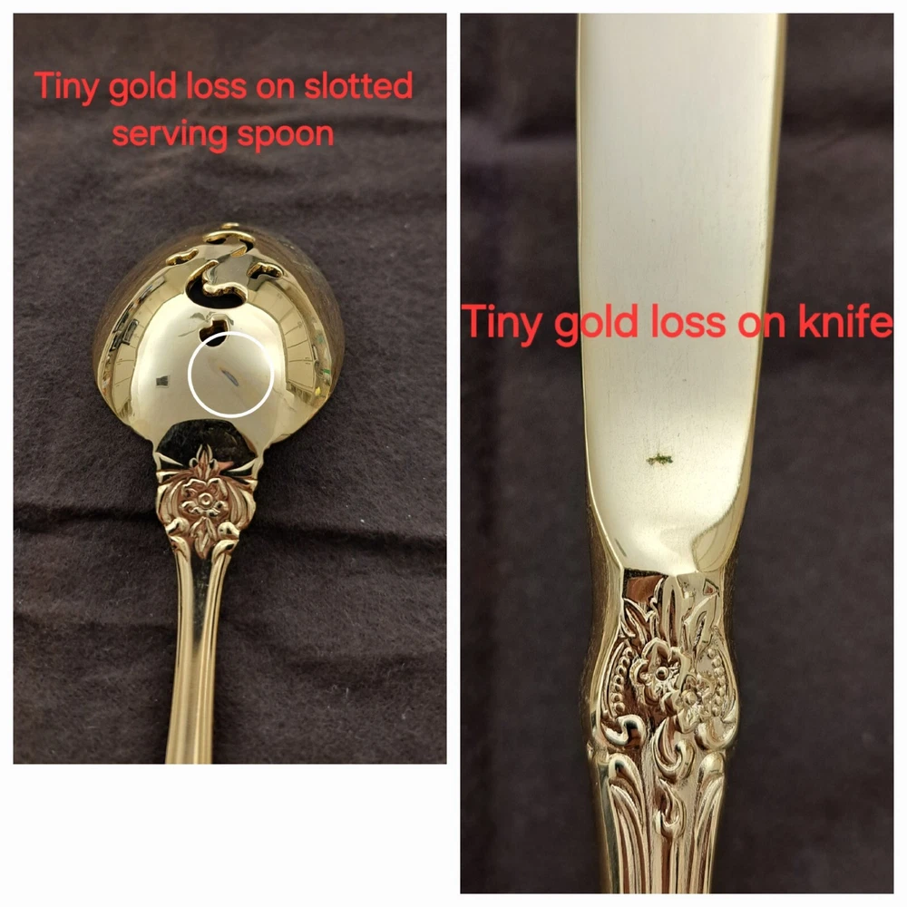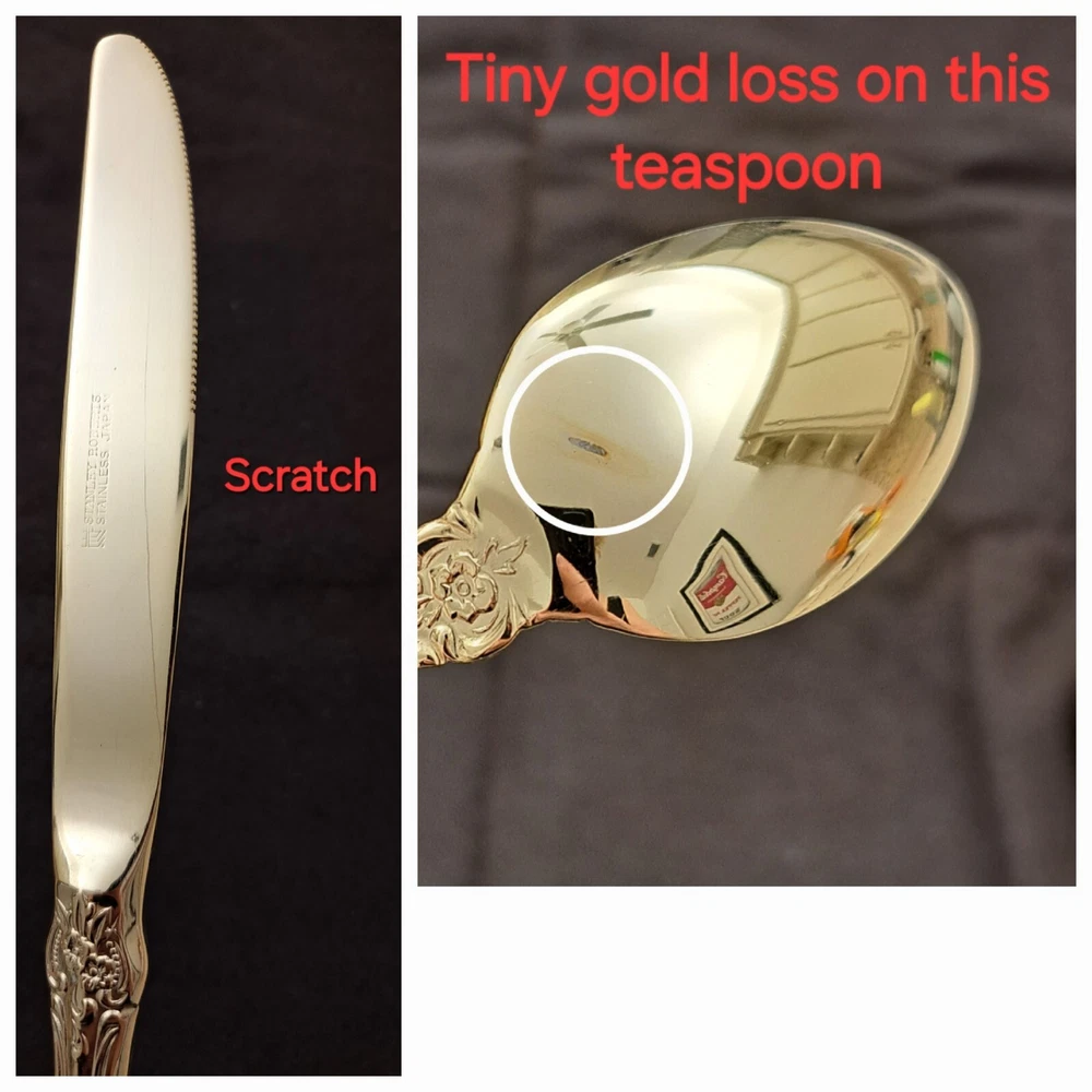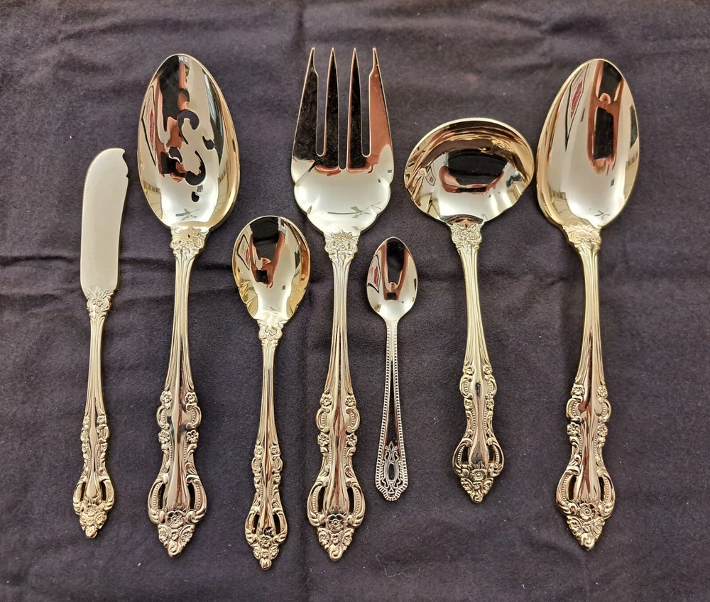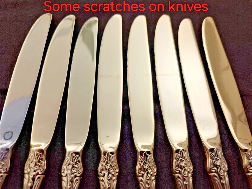 STANLEY ROBERTS ALEXIS GOLD PLATED STAINLESS FLATWARE 71 PIECES W/STORAGE CHEST One owner All of the pieces in this set are gold electroplated These have never been used There are 71 pieces of flatware and service ware and a storage chest This is a flatware set for 8 people The chest is a Tarnish Proof storage chest There are some tiny scratches on the outside of the chest On the back of the flatware and service ware it says - Stanley Roberts Alexis Stainless Japan There is a tiny bit of surface scratches on the flatware from stacking and storage Included in the 71 pieces there is a demitasse spoon by Truly Tasteful Stainless Steel Also included in the 71 pieces are 16 Iced Tea Spoons by Oneida Community Silver Gold Beethoven Gold Electroplate. On the back of the Iced Tea Spoons it says Oneida Community Please see the photos for gold loss and scratches A list of flatware and service ware in the storage chest and their approx. length: 8 Forks - 7 5/8" 16 Teaspoons - 6 1/4" 8 Salad Forks - 7" 8 Knives - 9 1/8" 8 Oval Soup Spoons - 7 1/8" 1 Butter Knife - 7 1/8" 1 Slotted/Pierced Serving Spoon - 8 3/4" 1 Sugar Spoon - 6 1/8" 1 Meat Serving Fork - 9" 1 Demitasse Spoon - 4 3/4" - by Truly Tasteful - Stainless Steel 1 Gravy Ladle - 6 5/8" 1 Serving Spoon - 8 1/2" 16 Iced Tea Spoons - 7 1/2" - by Oneida Silver - Gold Beethoven - Gold Electroplate Please see pictures, they are part of the description This item has always been in a smoke free air conditioned environment Payment is due at time of sale I do not offer refunds Please ask any questions that you may have before buying, I will be happy to answer them THANK YOU FOR LOOKING! HAVE A GREAT DAY! #443