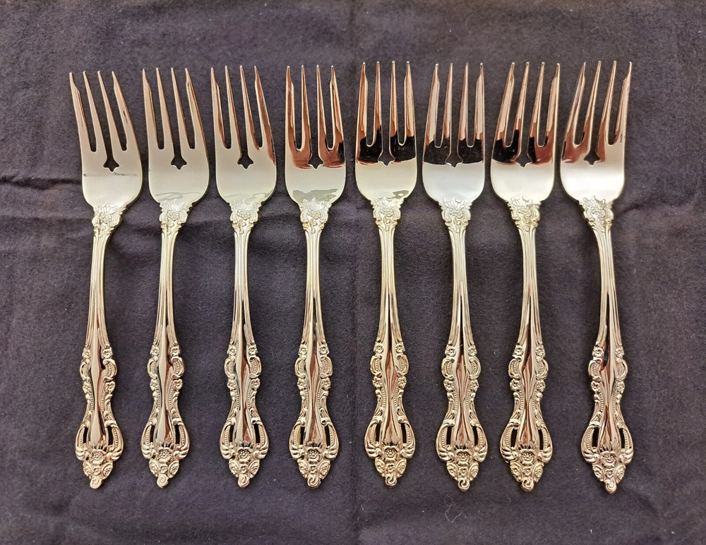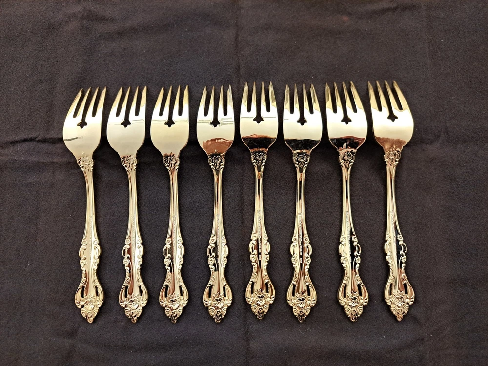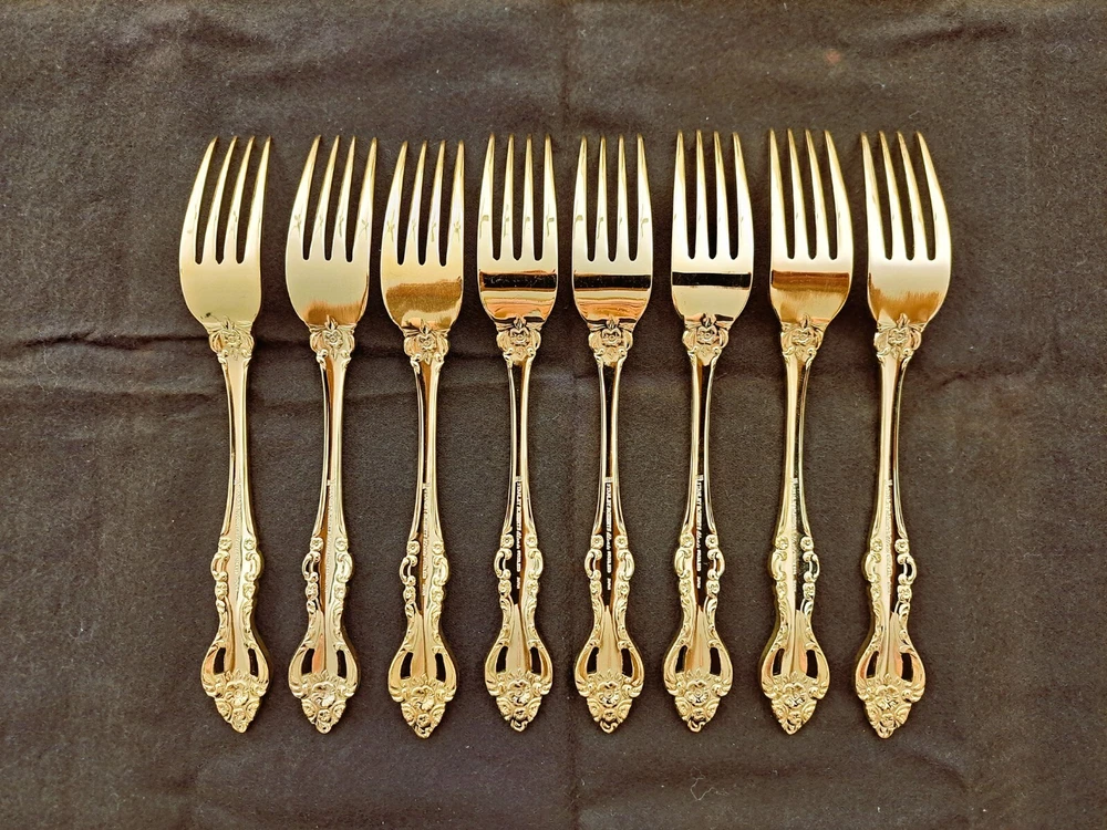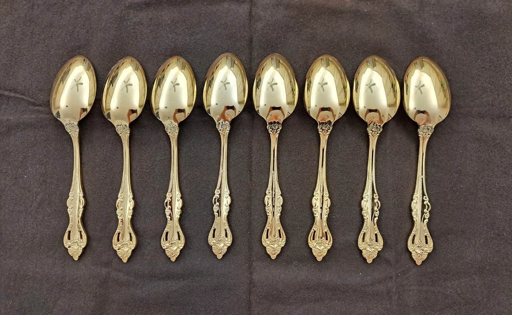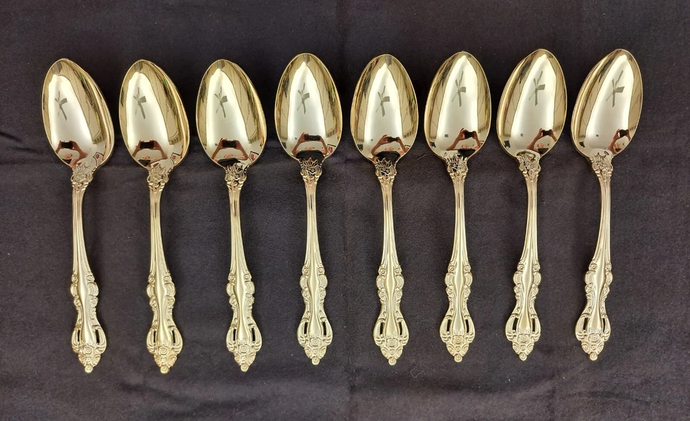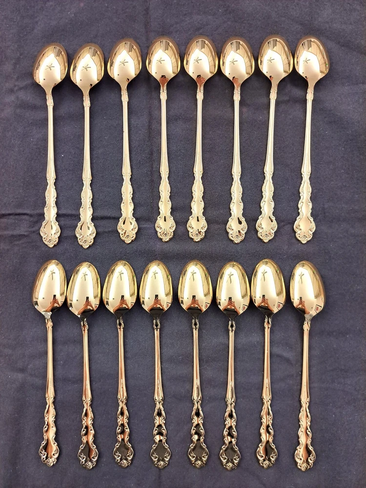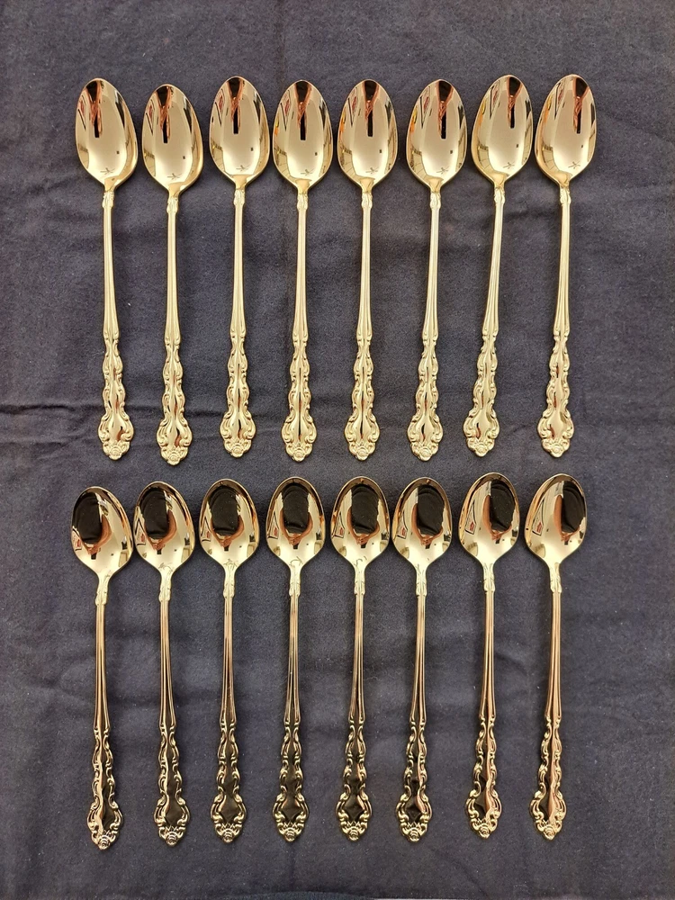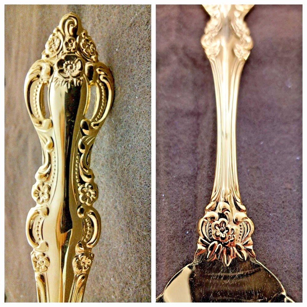 STANLEY ROBERTS ALEXIS GOLD PLATED STAINLESS FLATWARE 71 PIECES W/STORAGE CHEST One owner All of the pieces in this set are gold electroplated These have never been used There are 71 pieces of flatware and service ware and a storage chest This is a flatware set for 8 people The chest is a Tarnish Proof storage chest There are some tiny scratches on the outside of the chest On the back of the flatware and service ware it says - Stanley Roberts Alexis Stainless Japan There is a tiny bit of surface scratches on the flatware from stacking and storage Included in the 71 pieces there is a demitasse spoon by Truly Tasteful Stainless Steel Also included in the 71 pieces are 16 Iced Tea Spoons by Oneida Community Silver Gold Beethoven Gold Electroplate. On the back of the Iced Tea Spoons it says Oneida Community Please see the photos for gold loss and scratches A list of flatware and service ware in the storage chest and their approx. length: 8 Forks - 7 5/8" 16 Teaspoons - 6 1/4" 8 Salad Forks - 7" 8 Knives - 9 1/8" 8 Oval Soup Spoons - 7 1/8" 1 Butter Knife - 7 1/8" 1 Slotted/Pierced Serving Spoon - 8 3/4" 1 Sugar Spoon - 6 1/8" 1 Meat Serving Fork - 9" 1 Demitasse Spoon - 4 3/4" - by Truly Tasteful - Stainless Steel 1 Gravy Ladle - 6 5/8" 1 Serving Spoon - 8 1/2" 16 Iced Tea Spoons - 7 1/2" - by Oneida Silver - Gold Beethoven - Gold Electroplate Please see pictures, they are part of the description This item has always been in a smoke free air conditioned environment Payment is due at time of sale I do not offer refunds Please ask any questions that you may have before buying, I will be happy to answer them THANK YOU FOR LOOKING! HAVE A GREAT DAY! #443