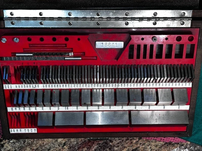 STARRETT CARBIDE GAGE BLOCKS SET NOT COMPLETE.MISSING BLOCKS ARE;.100, ,050, .100025, ,1001, .1002, .1003. STEEL BLOCKS ARE; .500, .1004, .1006, .1008, .1009. 2 blocks have a small chip.