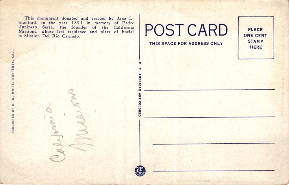 MAKE AN OFFER. THE MORE YOU BUY THE BETTER DEAL I WILL ACCEPT The postcard features a statue of Father Junipero Serra in Monterey, California, who was the founder of the California Missions.