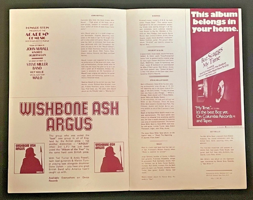 ORIGINAL PROGRAM / HAND-OUT FROM NEW YORK'S ACADEMY OF MUSIC (HOME OF GREAT MUSIC ONCE THE FILLMORE EAST SHUT DOWN) JOHN MAYALL, STEVE MILLER BAND, WET WILLIE AND OTHERS IN OCTOBER 1972 PROGRAM IS IN EXCELLENT CONDITION - MEASURES 6 X 9 1/4 INCHES GUARANTEED AUTHENTIC - ITEM GUARANTEED AS DESCRIBED - (PLEASE SEE MY FEEDBACK PROFILE - MUCHO POSITIVE SATISFACTION RATING !!!) - -BUYER PAYS SHIPPING CHARGES (I use USPS --- SHIPPING IS $ 5.00 )- SHIPPING OCCURS WITHIN TWO DAYS OF YOUR PAYMENT - - PLEASE FEEL FREE TO E-MAIL ME WITH ANY QUESTIONS PRIOR TO BUYING - - - - - BUYER AGREES TO PAY FOR ITEM WITHIN 7 DAYS OF SALE- PLEASE CHECK MY "ME" PAGE PLEASE SEE MY OTHER AUCTIONS FOR MORE ORIGINAL 1960'S - 90'S ROCK AND ROLL MEMORABILIA............................ THANKS AND STAY IN TOUCH