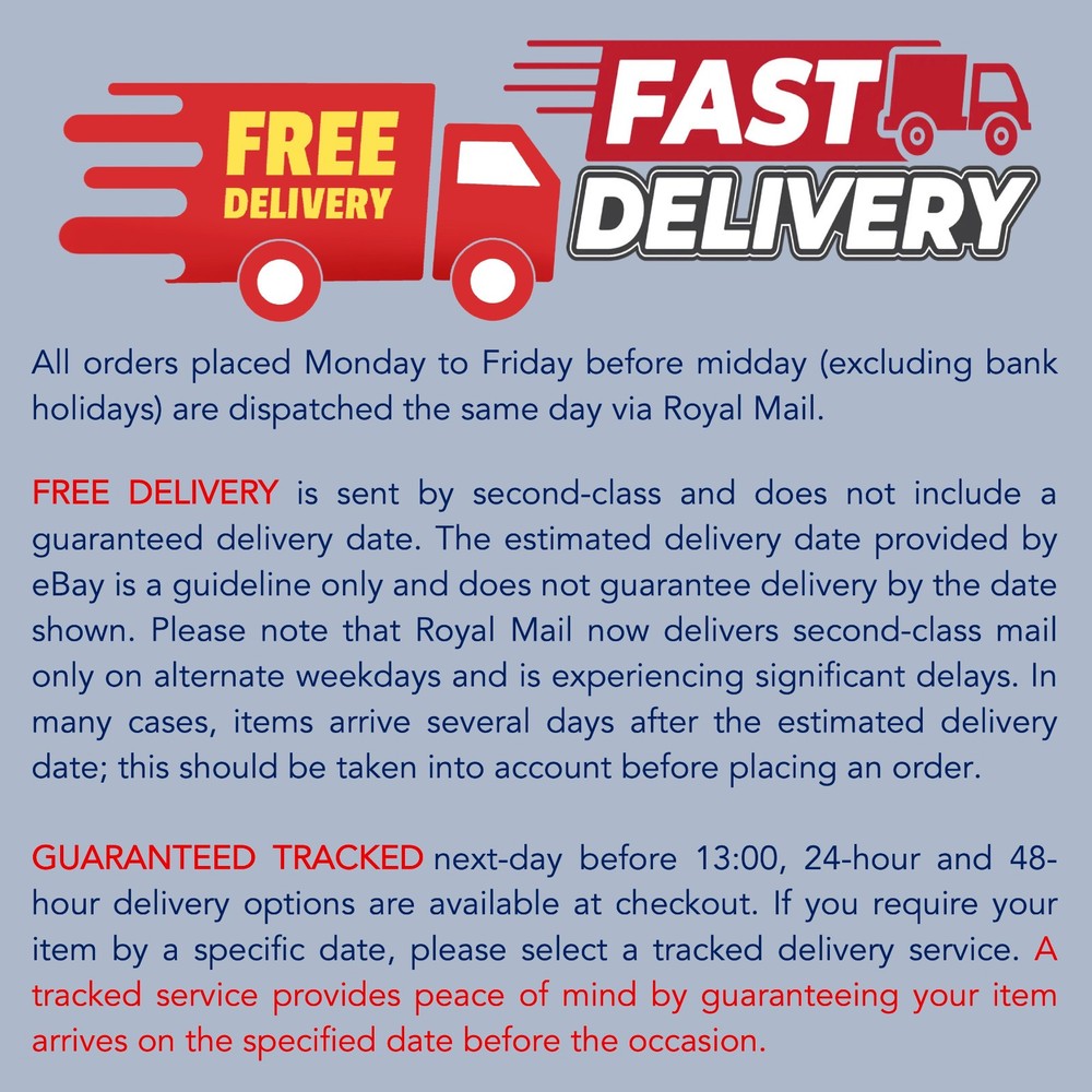 PRODUCT DETAILS: This greeting card measures 148mm x 148mm. It is printed on high-quality white 300gsm cardstock with a smooth matt finish and supplied with a white envelope. Due to varying screen resolutions, the colours you see on your screen may differ slightly from those in the finished product. PERSONALISATION: This greeting card can be personalised for any occasion, age, date, relationship and name. Please confirm your details in the personalisation box and double-check that they are correct before submitting. If required, specific details (e.g., name) can be omitted. If no details are added, it will simply read as shown in the listing, without personalisation. The inside is blank for you to handwrite a personal message. Sorry, we are unable to print or handwrite a message on the inside of the card. DELIVERY POLICY: All orders placed Monday to Friday before midday (excluding bank holidays) are dispatched the same day via Royal Mail directly to the buyer, with proof of postage. * FREE DELIVERY is sent second-class and does not include a guaranteed delivery date. The estimated delivery date provided by eBay is a guideline only and does not guarantee delivery by the date shown. Please note that Royal Mail now delivers second-class mail only on alternate weekdays and is experiencing significant delays. In many cases, items arrive several days after the estimated delivery date; this should be taken into account before placing an order. To avoid disappointment, please do not rely on eBay's estimated delivery dates, as they are unreliable, and we cannot change them or control delivery once the order has been shipped. Free delivery is offered as standard. By not selecting a tracked delivery service, you acknowledge that your order may arrive after the estimated delivery date and agree to accept the associated risks. We cannot accept responsibility for any delays outside of our control caused by Royal Mail. The tracking number provided for second-class deliveries is a proof-of-shipping number and will not be recognised by the Royal Mail online tracking service. * GUARANTEED TRACKED next-day before 13:00, 24-hour and 48-hour delivery options are available at checkout. If you need your item by a specific date, please select a tracked delivery service. A tracked service provides peace of mind by guaranteeing your item arrives on the specified date before the occasion. RETURNS AND REFUNDS POLICY: Upon receipt of payment, all items are custom-made to order. Therefore, we are unable to accept requests to cancel, change, or return items, except in cases of our error. We hold ourselves to a high standard and strive to meet buyer expectations. If, for any reason, you are not satisfied with your order due to our error, please message us within 24 hours of receipt with a photo clearly showing the defect, and we will provide a replacement. Items lost in transit are non-refundable, but replacements will be dispatched 5 business days after the estimated delivery date. CUSTOMER SERVICE: If you have any questions or are looking for a design with a particular character or theme that isn't listed, please don't hesitate to contact me. Our friendly and reliable design team will be happy to work with you to create something special just for you! We reply to messages via our administration office, which is open Monday-Friday (excluding bank holidays) from 10:00 to 14:00.