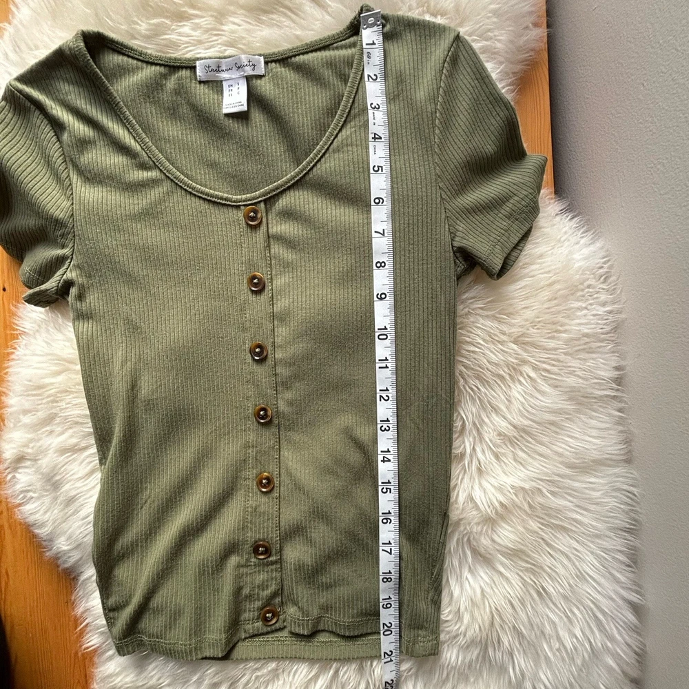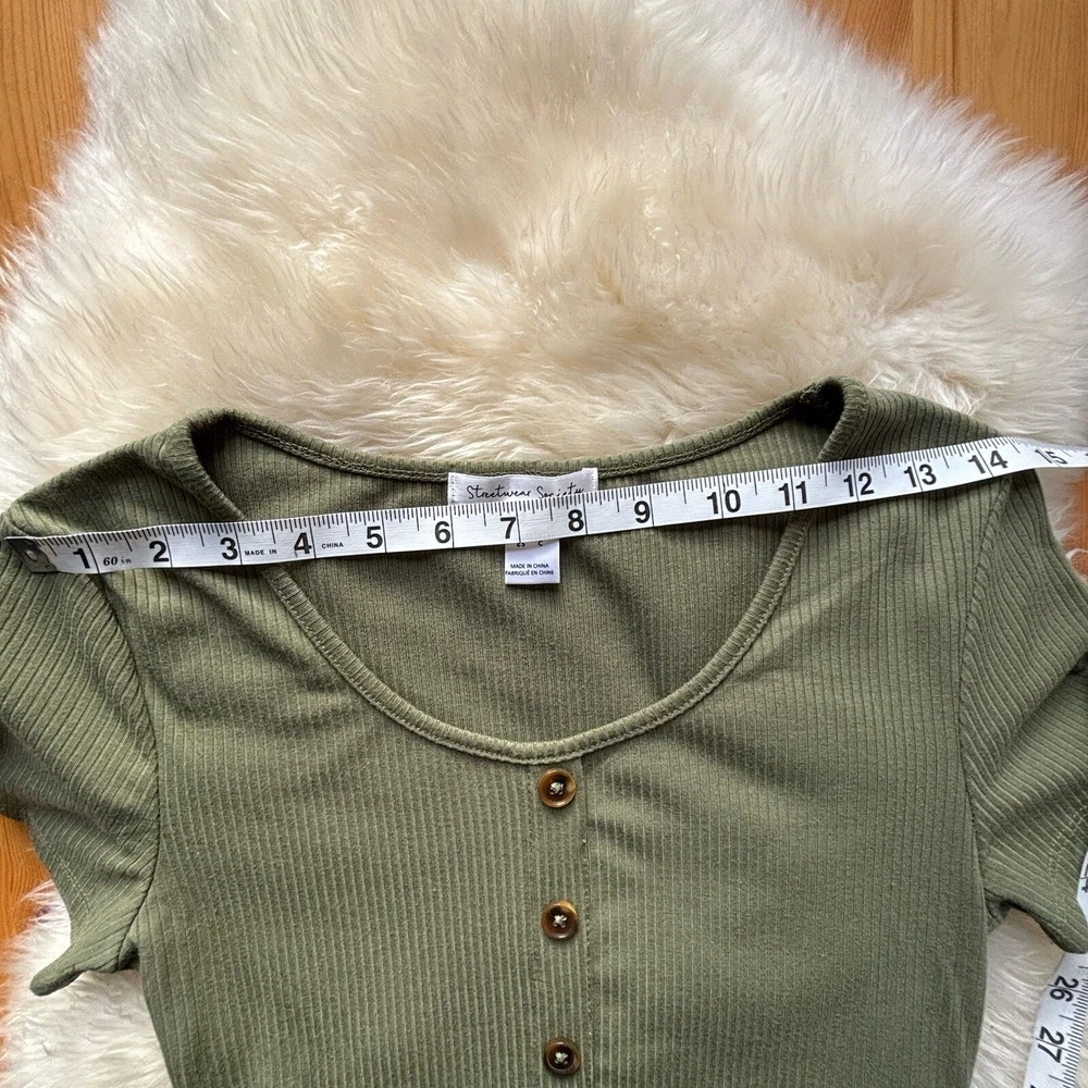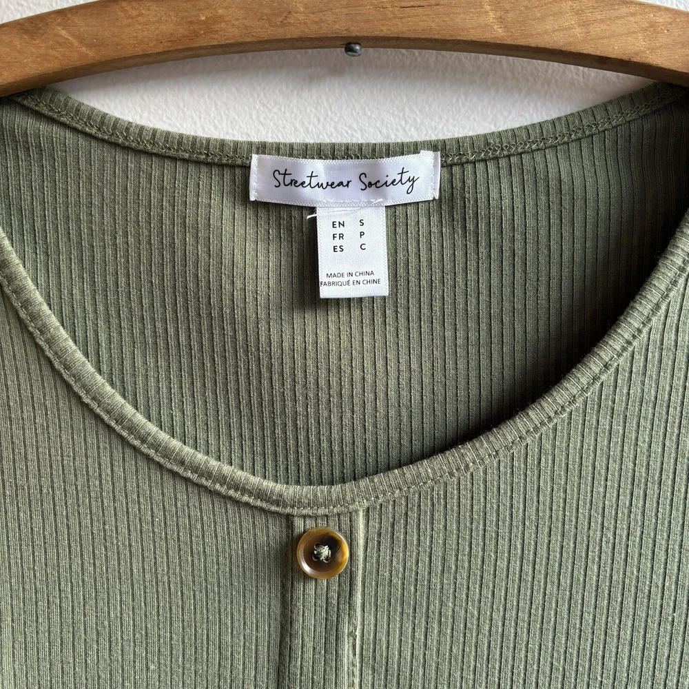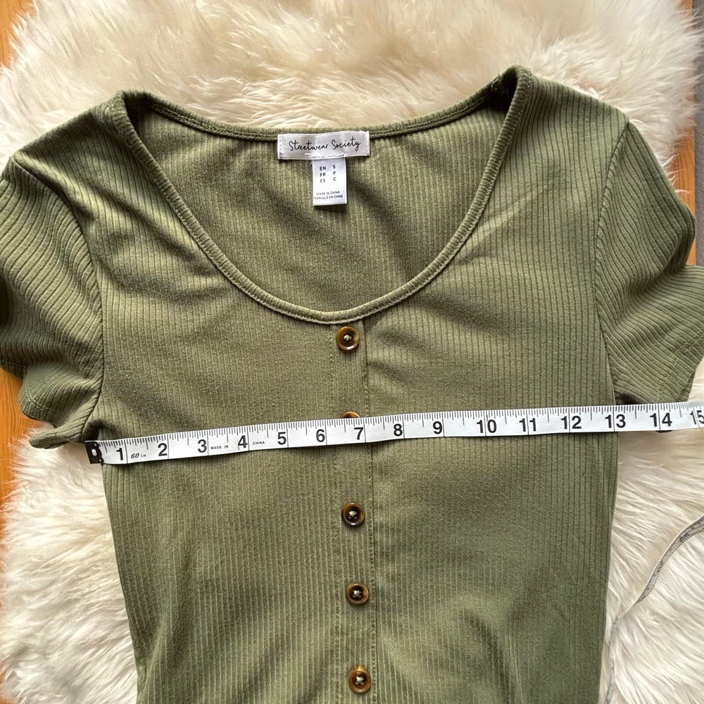 Stay on-trend with this STREETWEAR SOCIETY Women's or Juniors SMALL Army Green Ribbed Crop Top. Featuring a classic scoop neck with button accents, short sleeves, and a slim fit, this top is perfect for adding a touch of punk or bohemian style to your wardrobe. Made from a blend of polyester and cotton, this lightweight and easy-care top is ideal for all seasons, whether you're hitting the city streets or rocking out at a music festival. Pair it with high-waisted jeans or a flowy skirt for a versatile look that's sure to turn heads.