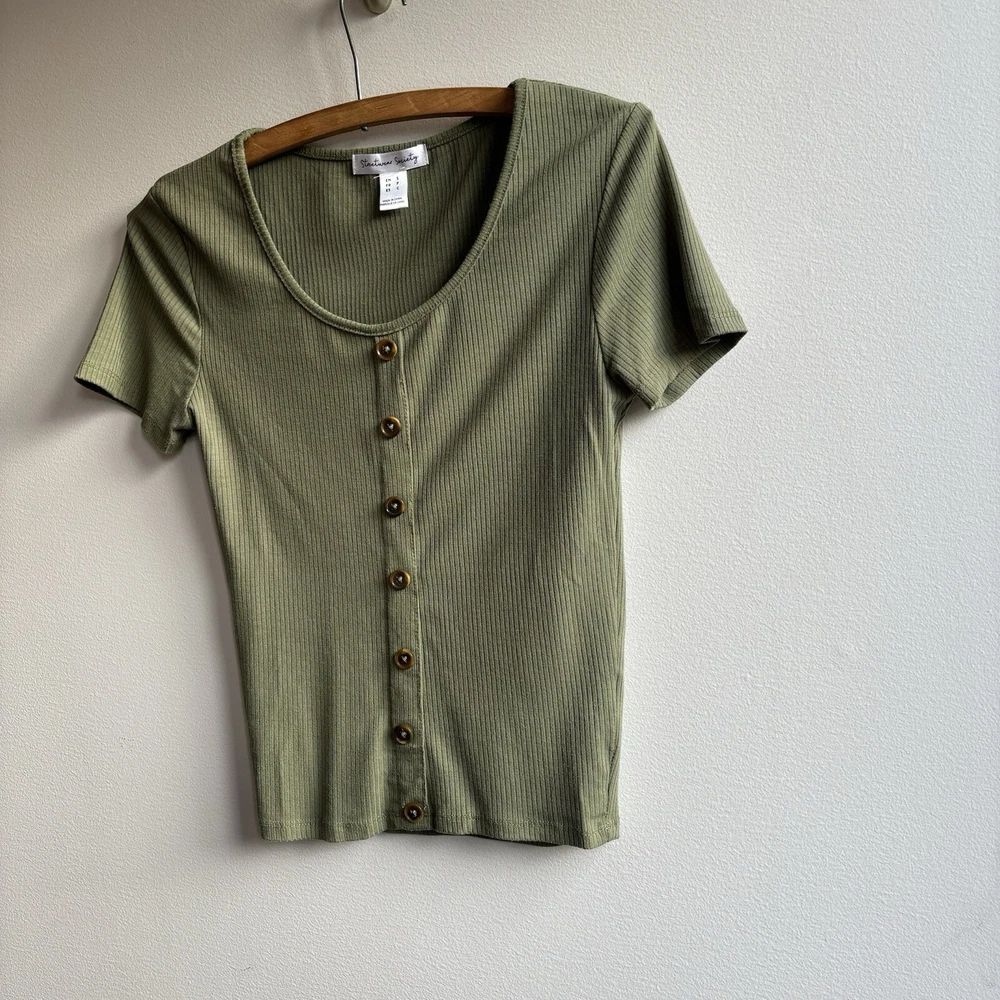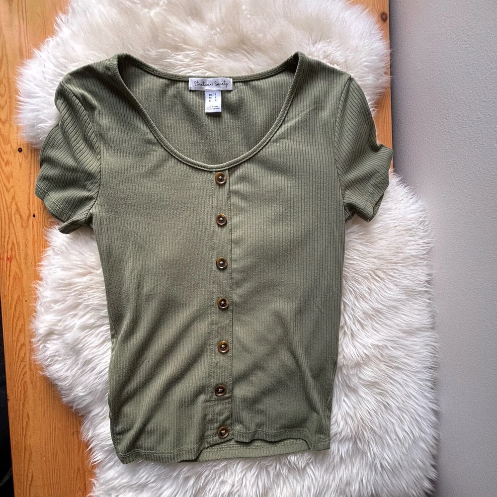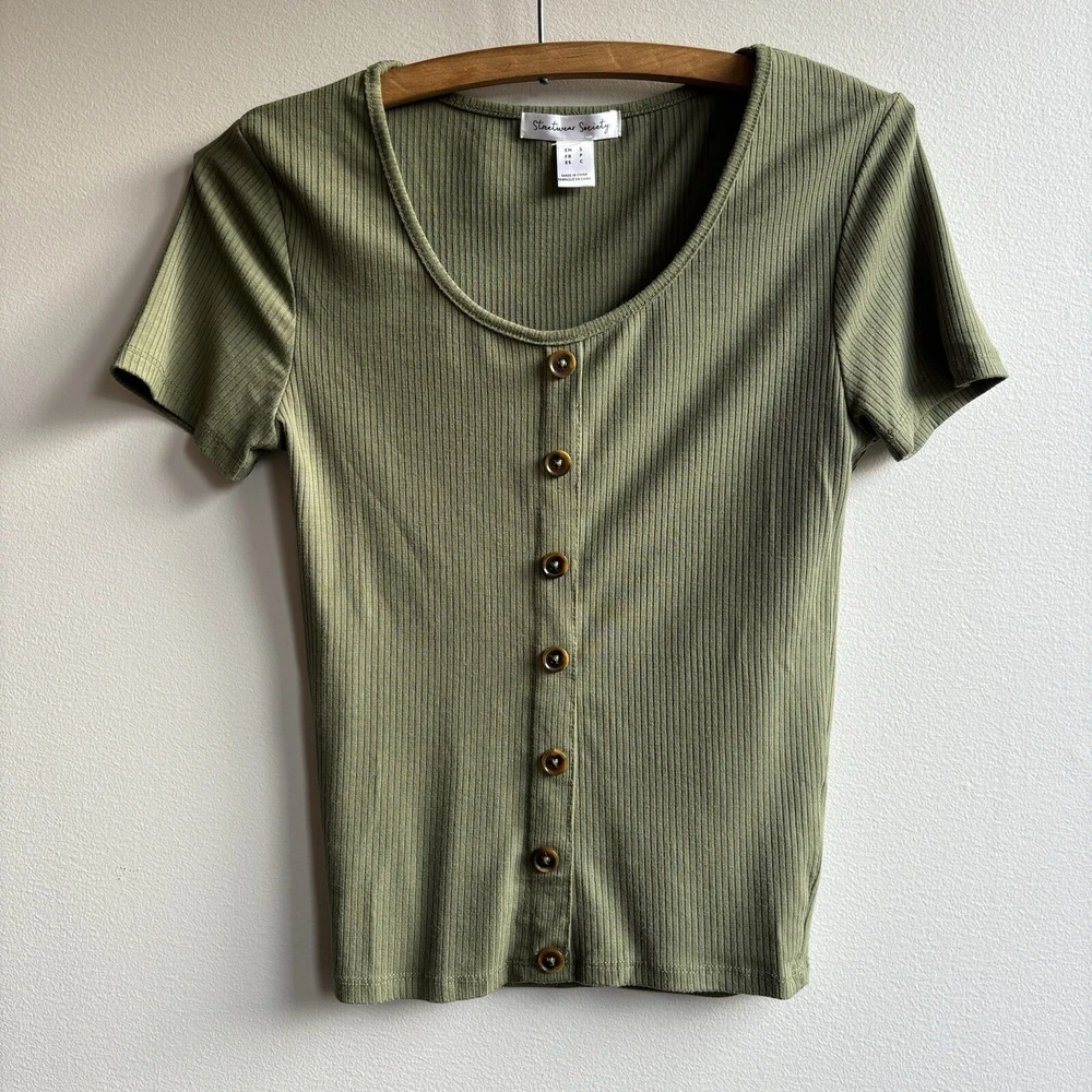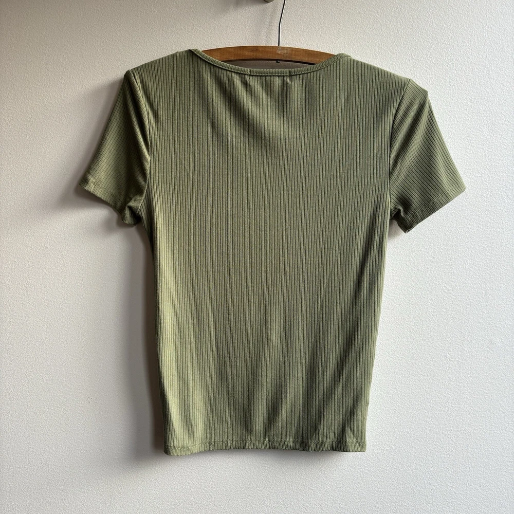Stay on-trend with this STREETWEAR SOCIETY Women's or Juniors SMALL Army Green Ribbed Crop Top. Featuring a classic scoop neck with button accents, short sleeves, and a slim fit, this top is perfect for adding a touch of punk or bohemian style to your wardrobe. Made from a blend of polyester and cotton, this lightweight and easy-care top is ideal for all seasons, whether you're hitting the city streets or rocking out at a music festival. Pair it with high-waisted jeans or a flowy skirt for a versatile look that's sure to turn heads.