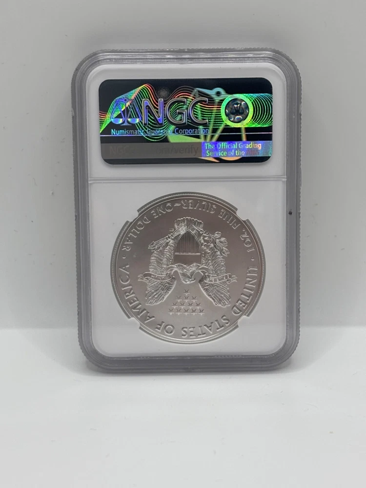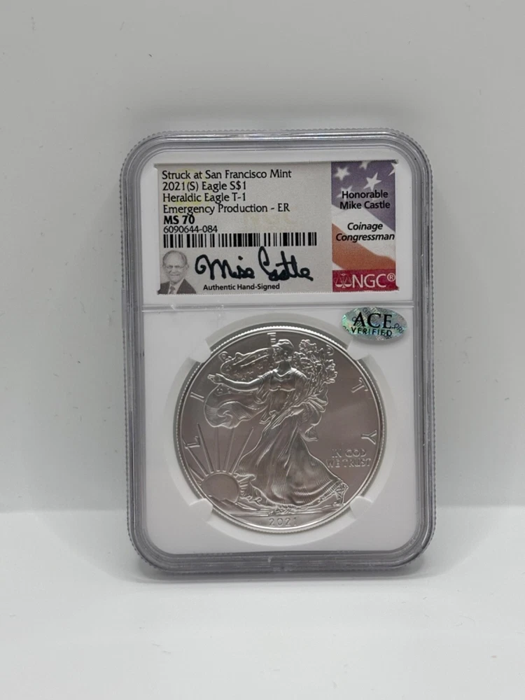 The product is a 2021 American Silver Eagle coin, struck at the San Francisco Mint, with a fineness of 0.999 silver. It has a grade of MS 70, weighs 1 oz, and features a Heraldic Eagle design. This coin is part of an emergency production and has been certified by NGC. It is minted by the U.S. Mint.