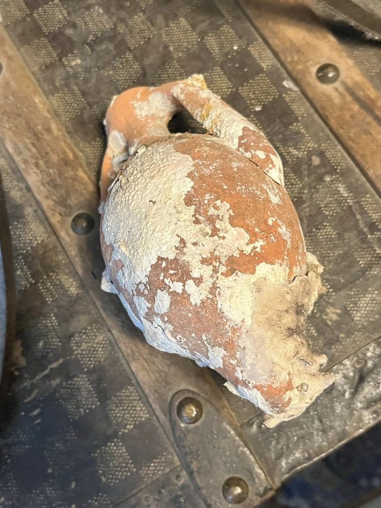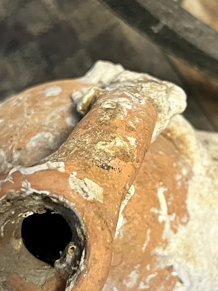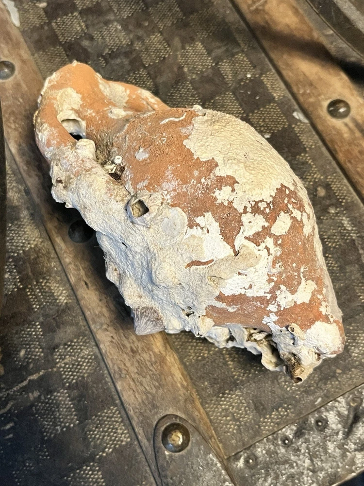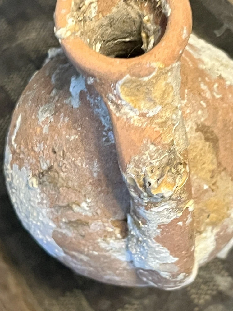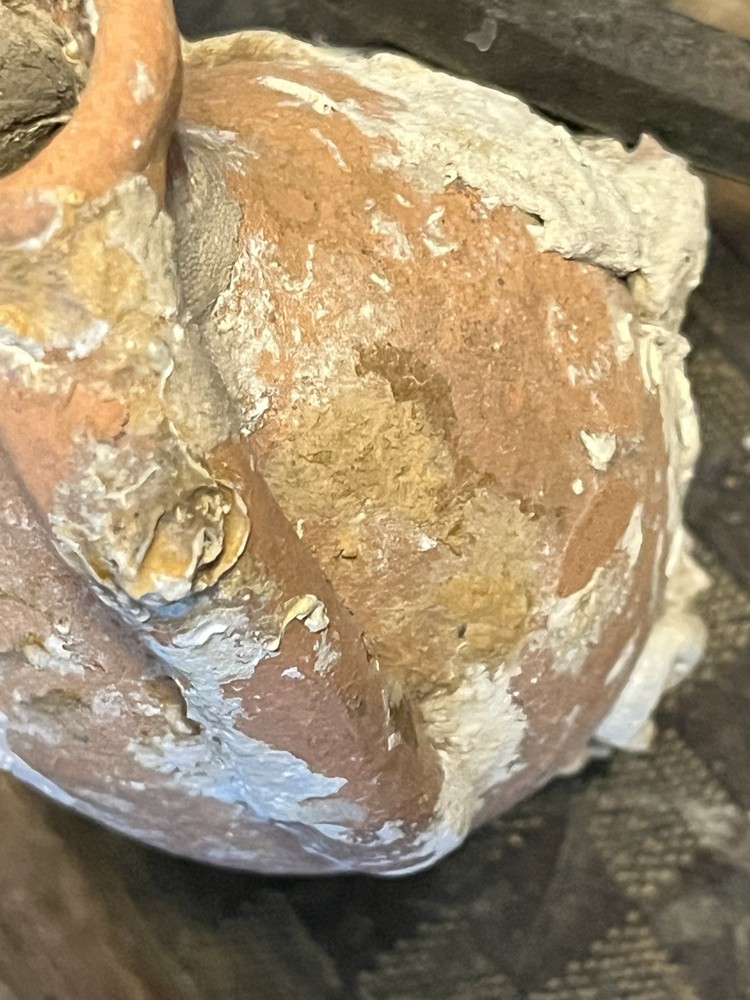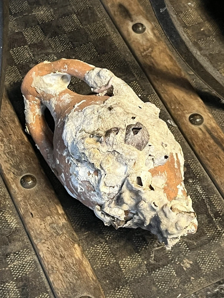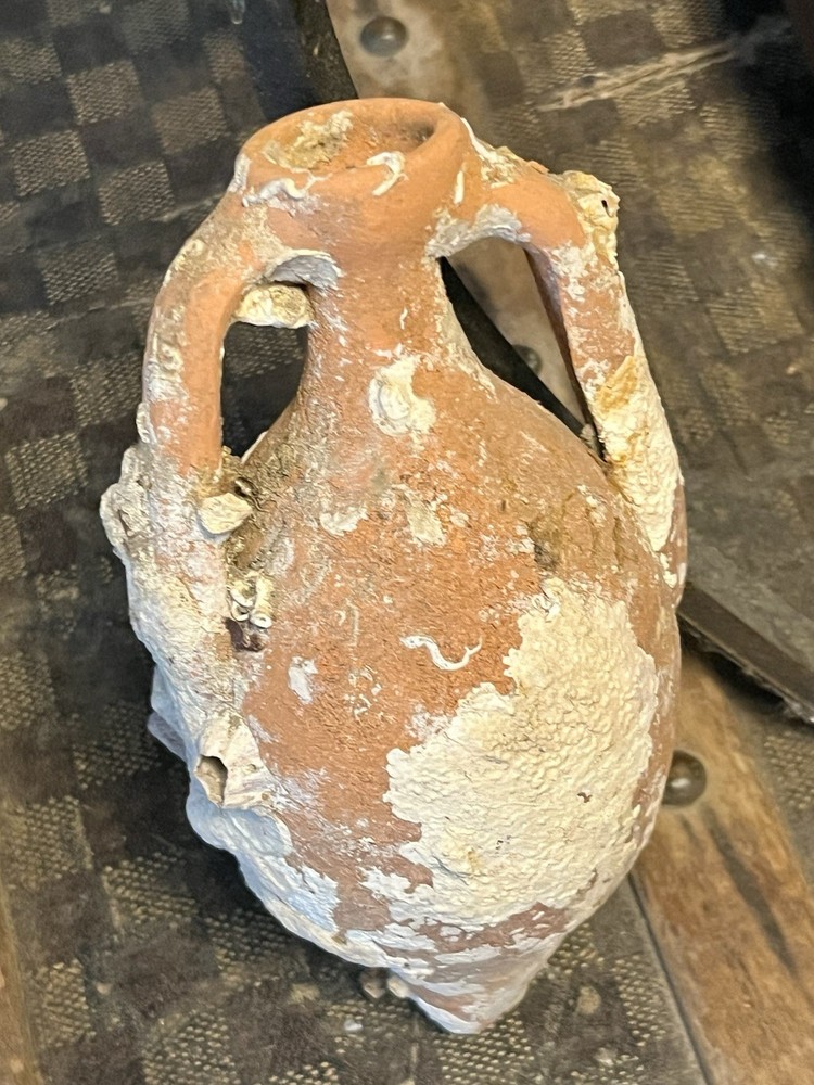 ancient terracotta amphora vessel washed up on shore and shows heavy surface encrustation, mineral buildup, and underwater patina consistent with long-term submersion. double handle pointed bottom It measures approximately 7 inches long 3.5” wide. acquired from a private collection and appears consistent with amphora or trade containers from Mediterranean shipwrecks. Amphorae are of great use to maritime archaeologists, as they often indicate the age of a shipwreck and the geographic origin of the cargo. They are occasionally so well preserved that the original content is still present, providing information on foodstuffs and mercantile systems. Ceramics for common uses such as shipping containers (amphorae) and water, wine and oil jugs were so ubiquitous that- Amphorae were too cheap and plentiful to return to their origin-point and so, when empty, they were broken up at their destination or thrown overboard into the sea or At a breakage site in Rome, Testaccio, close to the Tiber, the fragments, later wetted with Calcium hydroxide (Calce viva), remained to create a hill now named Monte Testaccio, 148 ft high. It will be shipped very well-packed Sold as-is with no formal authentication what you see in photos is what it is A RARE FIND just washed up at sea ANCIENT