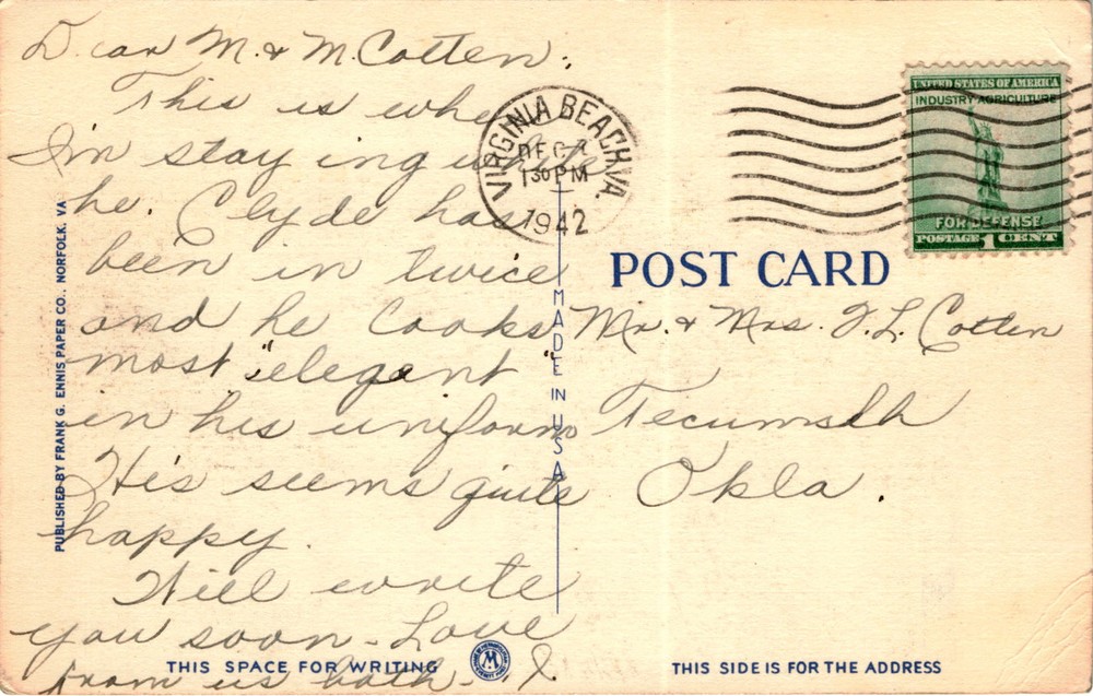 MAKE AN OFFER. THE MORE YOU BUY THE BETTER DEAL I WILL ACCEPT The postcard features an image of the Sunken Gardens at the Cavalier Hotel in Virginia Beach, Virginia. The sender mentions staying at the Cavalier Hotel with someone named Clyde in 1942. The postcard is addressed to Mr. & Mrs. J.L. Cotten in Tecumah, Oklahoma.