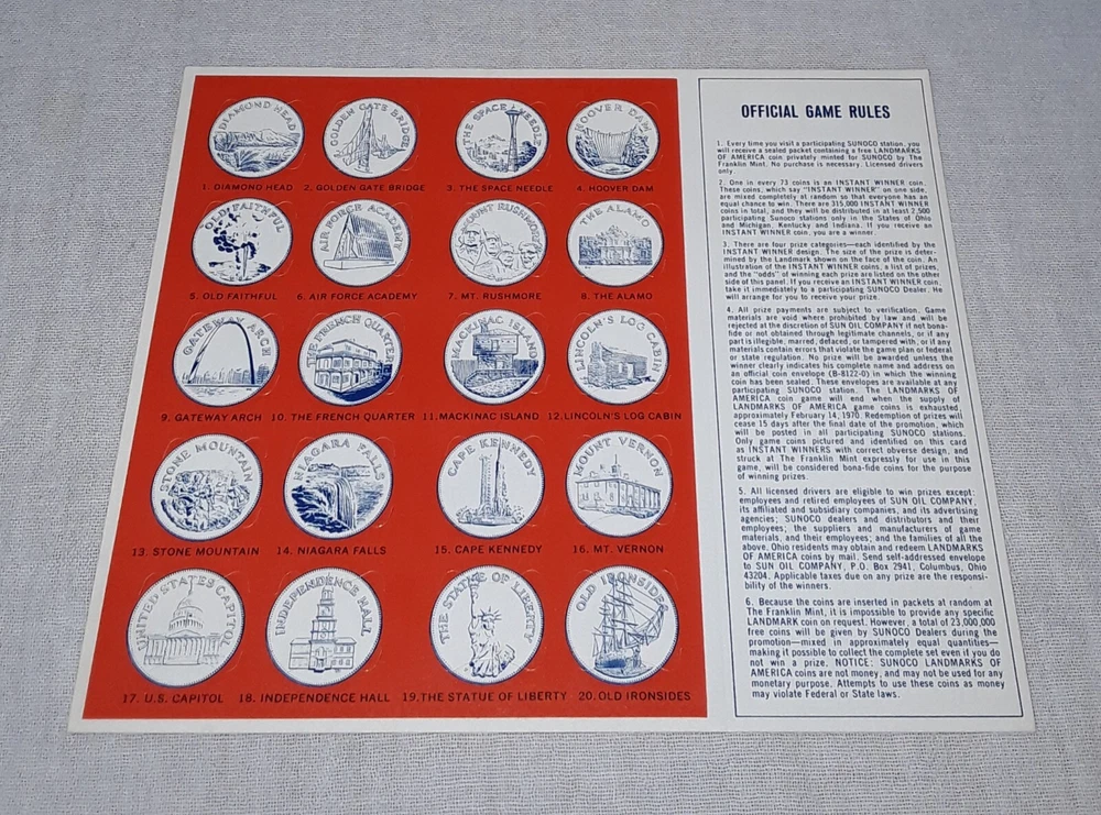 Here is a vintage, Sunoco Landmarks of America Coin Game card. The card is unused and new old stock. This is the card only, no coins. Please email me with any questions.
