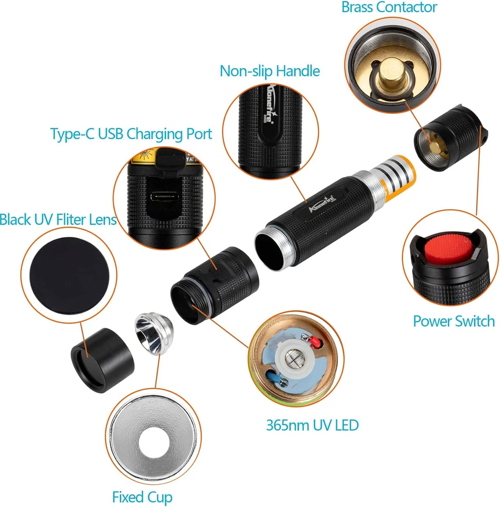 Neighborhood service SV005 10W LED 365Nm UV Flashlight Blacklight Portable USB Rechargeable Black Light Full Metal Case Pet Urine Detector with UV Protective Glasses, Battery Included for Resin Curing ENJOY THE FEATURES 【Powerful 365NM UV LED】Uses high-quality 365NM UV LED as light source, up to 10W power consumption and 2400mW luminous power, which make it become professional ultraviolet flashlight for professional use 【Black Filter Lens】Equipped with hard toughened black filter optical lens that can filter out foreign light from the environment, very little visible light, which makes the ultraviolet light purer 【Full Metal Body Case】The body case uses high-quality aluminum alloy, which greatly enhanced its heat dissipation performance, this makes flashlights more reliable and durable 【USB Rechargeable】Compared with the SV003, the SV005 supports USB direct charging, you can charge it from computer, power bank, car or power adapter, no additional charger required, it's very easy and convenient. high-capacity rechargeable battery included 【UV Protective Glasses】Our UV flashlight is very powerful, please do not shine into your eyes when using it. We have prepared UV protective glasses for you, and it is recommended to use UV flashlight with this Product Description Specifications: Light bulb: 365NM UV LED Purple light wavelength: 365NM Purple light power consumption: 10W Purple light luminous power: 2400mW Mode: 1 mode (off - on) (Charging Requirement: 5V-1A) Quality 365nm UV LED Uses high-quality 365NM UV LED source rather than the diode lamp, up to 10W power consumption and 2400mW luminous power, which make it become professional ultraviolet flashlight for some professional use. Hard Toughened Black Filter Optical Lens Equipped with hard toughened black filter optical lens that can filter out foreign light from the environment, which makes the ultraviolet light purer Pet Urine Detector: The UV can reveal the stains or fluids which are invisible to the naked eyes on the floor or even grass. such as detecting counterfeit documents, money verification, amber and jewelry detection, pet urine and stain detection In the dark environment UV lamp detection effect is more obvious and easy to distinguish. Tips: the included battery only can make the flashlight work at 6.6W, you can use more powerful power for it to get it works at 10W. To achieve the full 10W, use a higher 3.7v Rechargeable Battery to achieve better UV lighting results. Full metal body case enhance heat dissipation The case uses high-quality aluminum alloy, which greatly enhanced its heat dissipation performance, this makes flashlights more reliable and durable Tips: 10W power is so powerful, so it will produce more heat than common UV flashlight, this is a normal phenomenon. Important: As time goes on, the heat will become very serious. In order to protect the lamp bead, the flashlight is designed to reduce its power to 60%~70% of the rated power after 3 minutes of use. USB Rechargeable Compared with the SV003 UV flashlight, the biggest highlight of the SV005 is the addition of USB charging. Battery Polarity : The positive (+) ends of the battery goes at the front (nearest to the bulb), and the negative (-) ends at the back of the torch. The charging port is Type-C USB, compare with the micro USB, the Type-C port is reversible, any way you plug in is the right way. It's convenient for daily use and not easy to damage the port. There is a charging indicator that tells you when the battery will be fully charged. Charging Indicator (Charging Requirement: 5V-1A) Red: Charging Blue: Fully charged Tips : When the flashlight battery is too low (the light is dim), it is recommended that you charge it in time to avoid damage to the battery caused by over-discharge. Features: Dimension: Portable and compact body, it's very easy to carry and use Weight: 69g(2.4 OZ) Dimensions: 122 x 24 x 24 mm (4.8x0.9x0.9 inches) USB Charging You can charge the uv light from computer, power bank, car or power adapter, it's very easy and convenient, but please keep in mind that the package doesn't include power adapter. Package Content: 1 x 365NM UV Flashlight 1 x UV Protective Glasses 1 x USB Cable 1 x Rechargeable Battery 1 x Hand Strap ( Tips : Please remove the Transparent insulating film (if any) on the surface of the battery before first use.) Application Item model number SV005_10W Light Source Type LED Power Source Battery Powered Battery Cell Composition Lithium Ion Batteries Included? Yes Battery Description Lithium-Ion Batteries Required? Yes Material Aluminum Number of Batteries 1 Lithium Ion batteries required. (included) Package Dimensions 6.81 x 3.15 x 1.69 inches Included Components Battery Light Source Wattage 10 Watts Brightness 2400 millicandela Item Weight 5.9 ounces Special Features High Power, Rechargeable Special Feature High Power, Rechargeable Part Number SV005_10W Color Black Wattage 10 Watts Batteries 1 Lithium Ion batteries required. (included) Recommended Uses For Product Pet urine detection, resin curing 3.15 inches x 6.81 inches x 1.69 inches. Weight: 5.9 oz PAYMENT We accept all payments via Ebay using Credit Cards , PAYPAL , Apple Pay and many others SHIPPING We are always working hard to ensure your package arrives as soon as possible. Please understand that some factors like weather, high postal traffic, and the performance of shipping companies are outside of our control. We offer free shipping to the lower 48 states and ship within 3-5 business days of payment, usually sooner. We do not accept P.O. Boxes. Please provide a physical address. We do not ship internationally at this time. DELIVERY & RETURN POLICY We do not offer returns unless the item violates eBay policies. Please be aware these polices only make sellers accept returns if the item violates eBay's Buyer Guarantee. If you would like to learn more about this please visit eBay's Help Page. Thank you for your business
