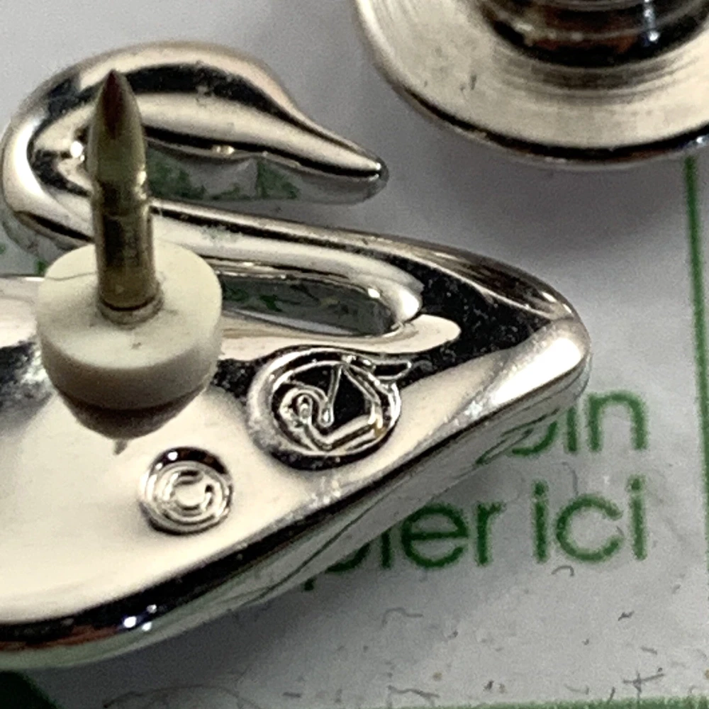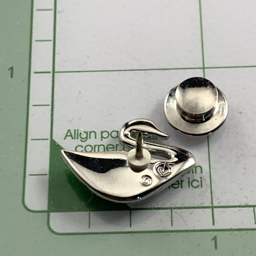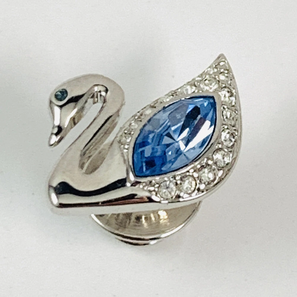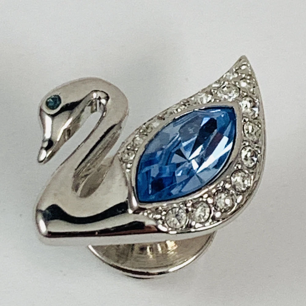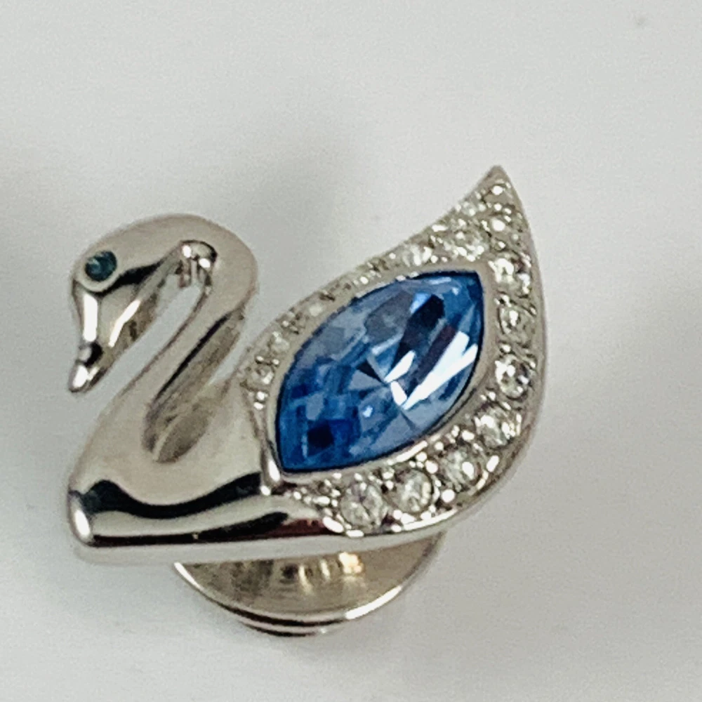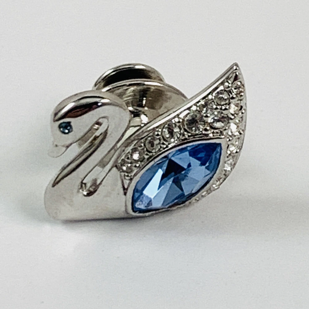 SWAROVSKI Blue Crystal Silver Tone SWAN LOGO Small Lapel Tac Pin Signed. Pre-Owned Estate Jewelry in Very Good Condition. Ready to wear, give as gift or add to a collection. Our Vintage items are mostly from estate sales and vary in age from 100+ years old to more modern pieces. Please use your judgement. Items are photographed on a measuring matte with one-inch squares to give you an idea of size. Any photography props / holders you see are not included.