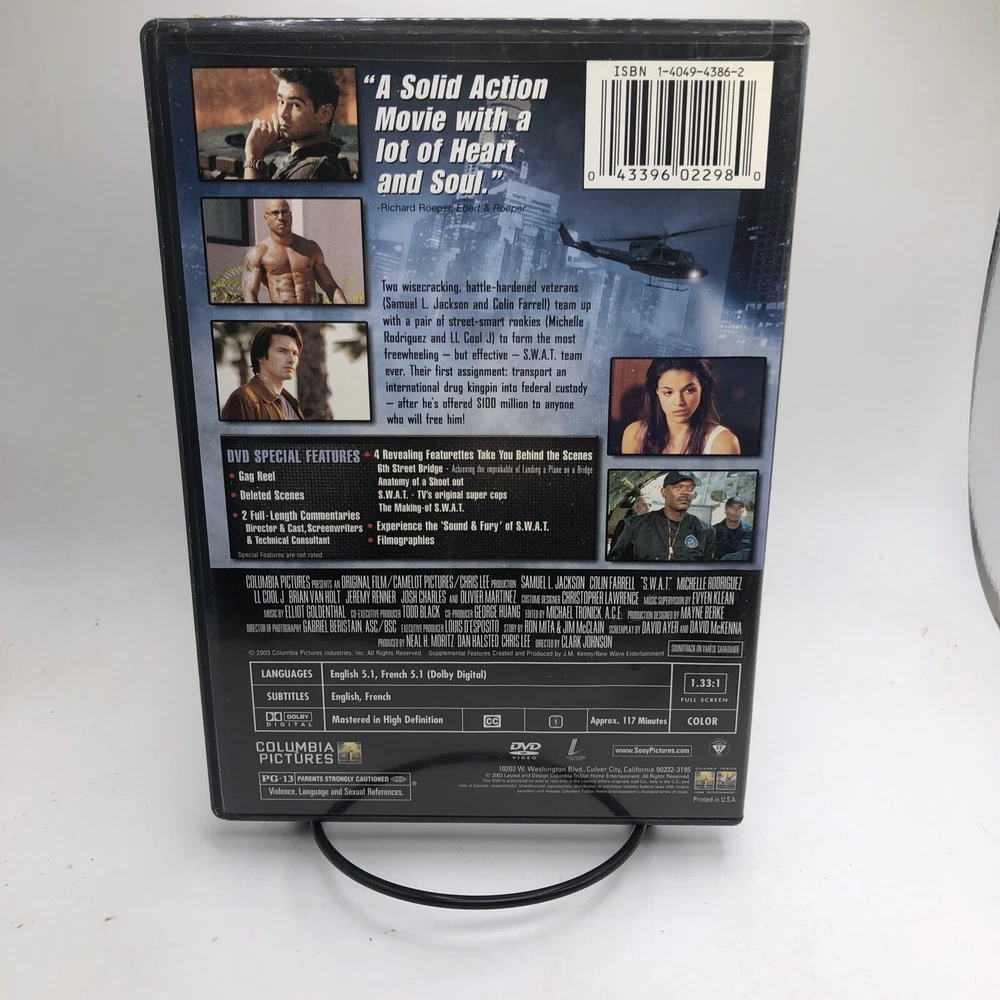 Country/Region of Manufacture: United States Release Year: 2003 Features: Full Screen Region Code: DVD: 1 (US, Canada...) Director: Clark Johnson Rating: PG-13 Case Type: Tall/DVD Case Genre: Action & Adventure Format: DVD Actor: Colin Farrell, Samuel L. Jackson Seller Notes: “Please see photos. All USED Movies will have some minor scratches and blemishes on cases.” Type: Movie UPC: 0043396022980 Edition: Full Screen Special Edition Language: English gtin13: 0043396022980 Movie/TV Title: S.W.A.T.