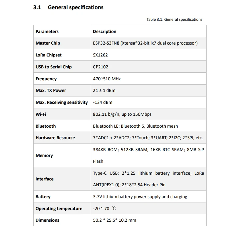 Detail 1. Description 1.1 Overview WiFi LoRa 32 is a classic IoT dev-board designed & produced by Heltec Automation. Since its launch in 2017, it has been loved by developers and makers. The newly launched V3 version has the same pin sequence as the V2 version, and retains Wi-Fi, BLE, LoRa, OLED display and other functions. On this basis, the V3 version has been 1.2 Product features ➢ Microprocessor: ESP32-S3FN8 (Xtensa® 32-bit LX7 dual core processor, five stage pipeline rack Structure, main frequency up to 240 MHz). ➢ SX1262 LoRa node chip. ➢ Type-C USB interface with a complete voltage regulator, ESD protection, short circuit protection, RF shielding, and other protection measures. ➢ Onboard SH1.25-2 battery interface, integrated lithium battery management system (charge and discharge management, overcharge protection, battery power detection, USB / battery power automatic switching). ➢ Integrated WiFi, LoRa, Bluetooth three network connections, onboard Wi-Fi, Bluetooth dedicated 2.4GHz metal spring antenna, reserved IPEX (U.FL) interface for LoRa use. ➢ Onboard 0.96-inch 128*64 dot matrix OLED display, which can be used to display debugging information, battery power, and other information. ➢ Integrated CP2102 USB to serial port chip, convenient for program downloading, debugging information printing. ➢ Support the Arduino development environment. ➢ We provide ESP32 + LoRaWAN protocol Arduino® library, this is a standard Feedback Payment Shipment About us Feedback We appreciate positive feedback . we always try our best to service our customers . so if you have ant question ,PLEASE DON’T HESITATE TO TELL US, we are always here to offer help . Payment We prefer PayPal .For purchasing multiple items , please contact us for a combined invoice . generally we would like to receive payment thin 48 hours if . Shipment We provide airmail service with good package . The items will be shipped within the nest 2 business days after we received the payment . when you buy multiple items ,your shipping cost will be combined with discount . SHIPPING TIME (weekends/holidays excluded) Country Name Shipping Time Country Name Shipping Time USA/Canada 10 -15d Spanish/Portugue 10-25d East/South Asia 10 -15d France/West Asia 10-25d United Kingdom 10 -20d Italy 10-30d Australia/New Zealand 10 -15d West Asia/Middle East 15-25d Most Country of West/North Europe 10-20d South America and Africa 15-30d East /Middle Europe/Russia 10-25d About us NEW, GOOD QUALITY, ORIGINAL PACKAGE LARGE STORE AND THE LOWEST PRICE NO-QUESTION-REFUND, FOR LARGE QUANTITY ,OFFER BETTER PRICE, ORIGINAL PACKING(TAPE REEL/TUBE/TRAY) We specialize in electronic components . ICs, Capacitors, Diodes, Resistors, LEDs, Transistors, and so on. Especially in Hard To Find Parts . we only sell NEW , ORIGINAL parts . please buy with confidence .We offer NO-QUESTION-REFUND go to my store On May 24, 2023 at 20:48:42 PDT, seller added the following information: On May 24, 2023 at 23:01:48 PDT, seller added the following information: On Apr 7, 2024 at 22:14:45 PDT, seller added the following information: