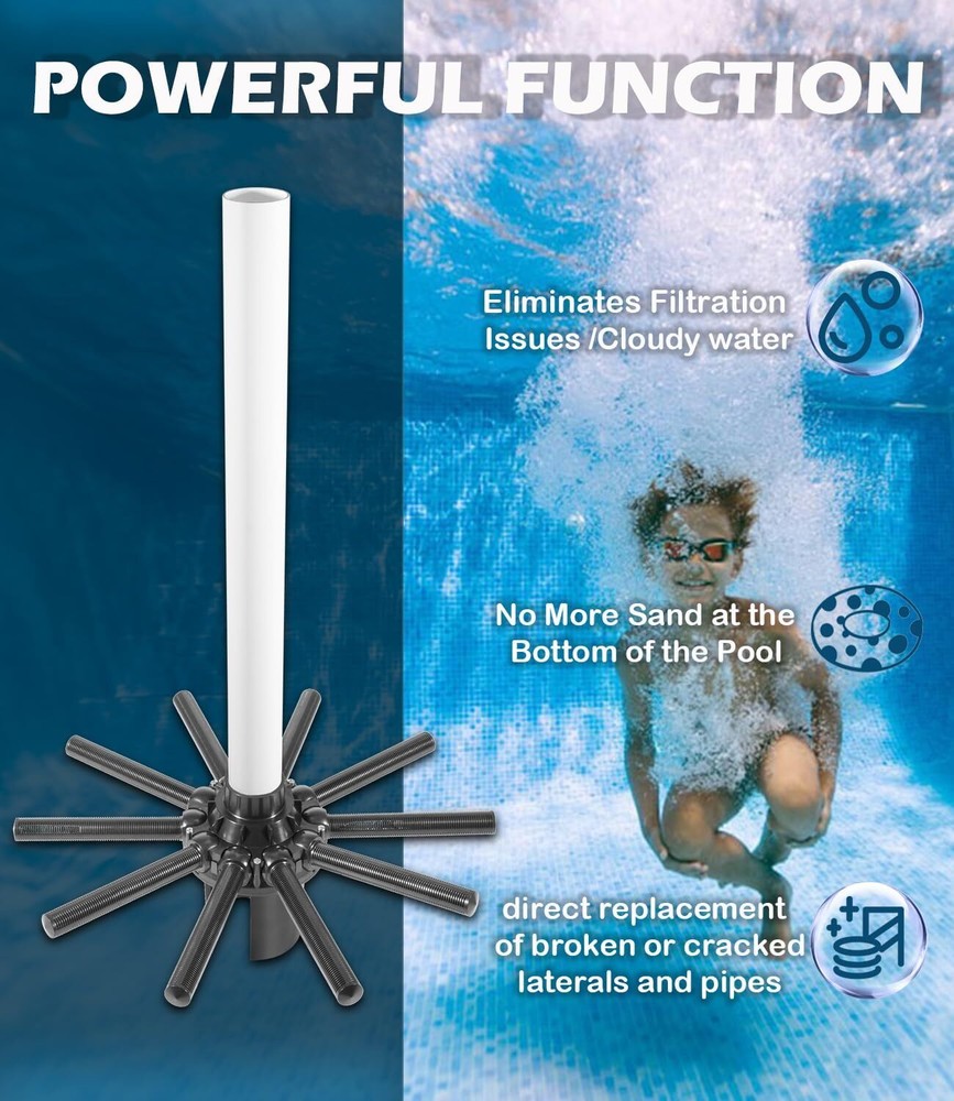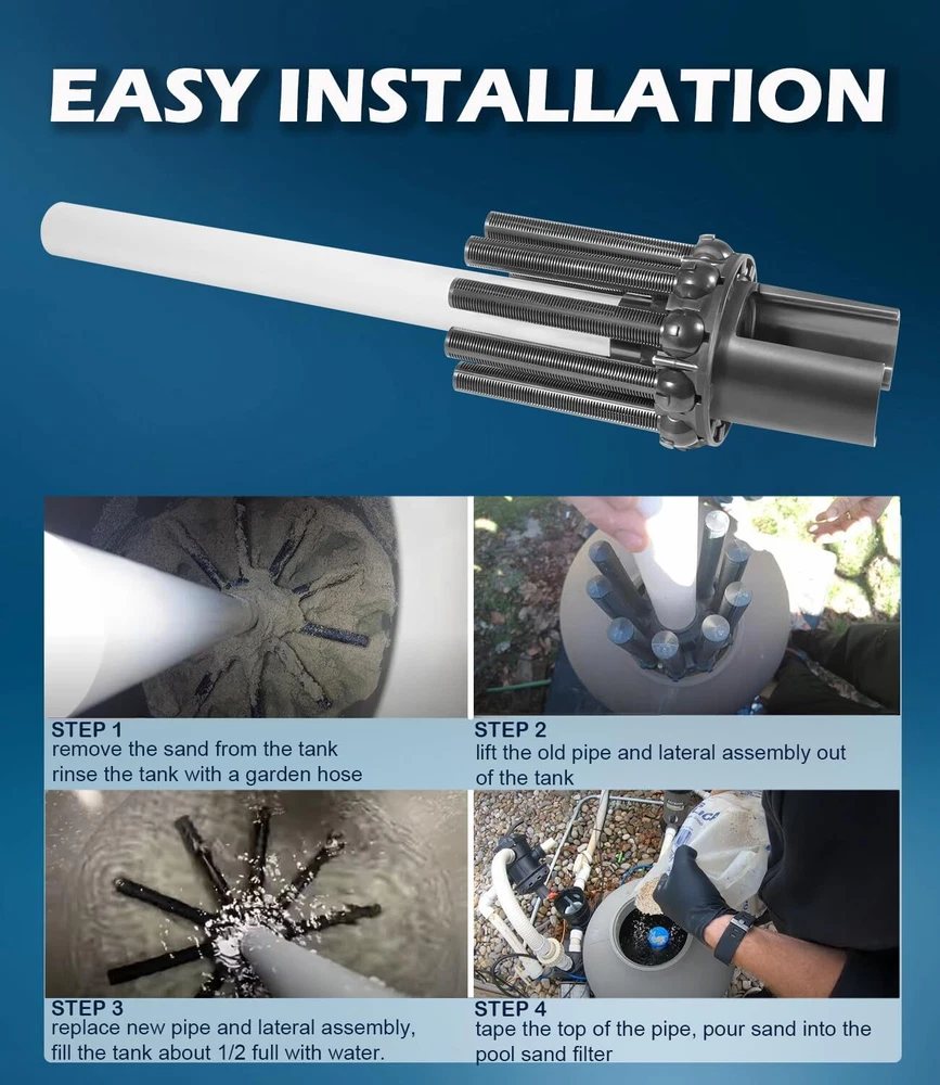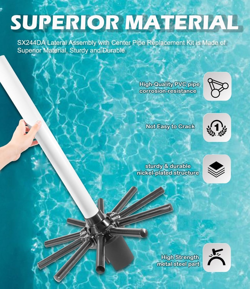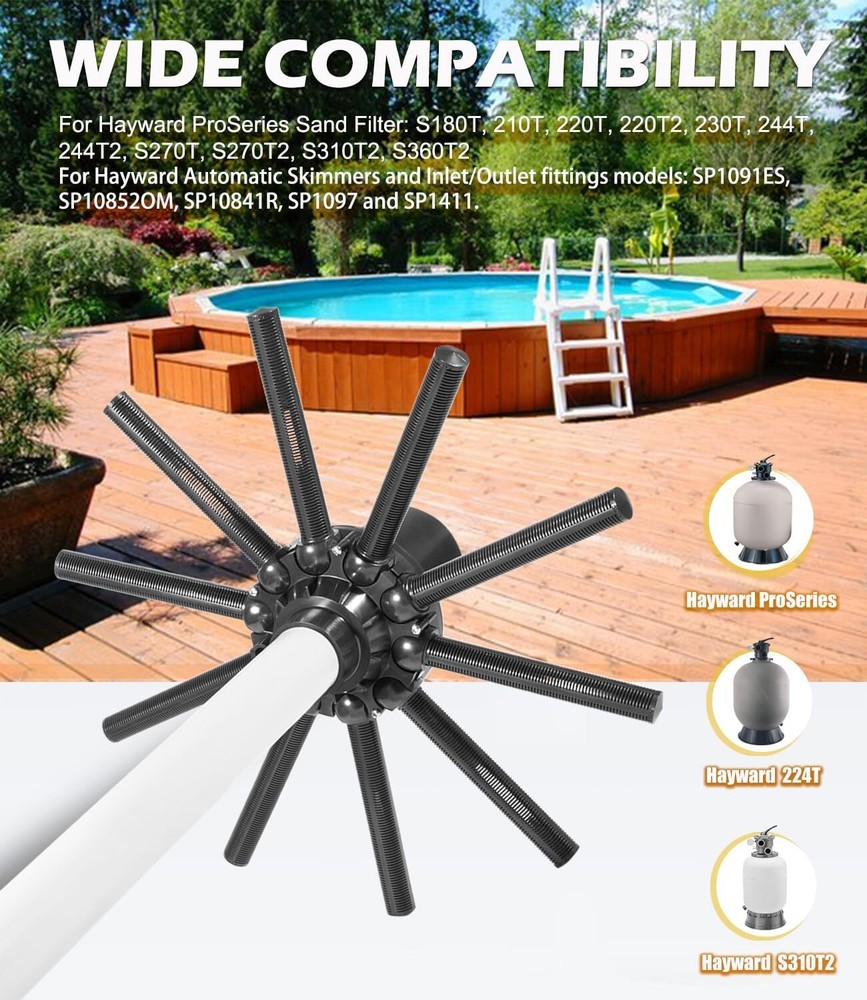 Great Compatibility SX244DA lateral assembly with center pipe is specifically designed for Hayward Automatic Skimmers and Inlet/Outlet fittings models SP1091ES, SP10852OM, SP10841R, SP1097 and SP1411. Also compatible with Hayward pro series sand filter model S270T2, S244T, S244TC, S270T. Practical Function This sand filter accessory is used to directly replace the worn, cracked or broken laterals. Improves the clarity and quality of pool water by separating particles and impurities. It plays an essential role in maximizing the operational performance for swimming pool filtration system, which is suitable for people looking for nature-friendly, easy to install and low maintenance cost replacement parts in keeping the pools clean. Easy Installation It takes a breeze to finish installation without special tools required. Simply remove the broken or old center pipe and take it out. And then install the new one in original position to get job done. Come with installation manual for reference. (Attention please: Before adding sand to the filter, you must cover the opening of the tube to prevent sand from entering.) Superior Construction Made of premium corrosion-resistant materials, anti-impact and anti-deformation for long-lasting reliable use. A must-have item to keep your pool clean and healthy. Package List 1 x SX244DA Lateral Assembly with Center Pipe