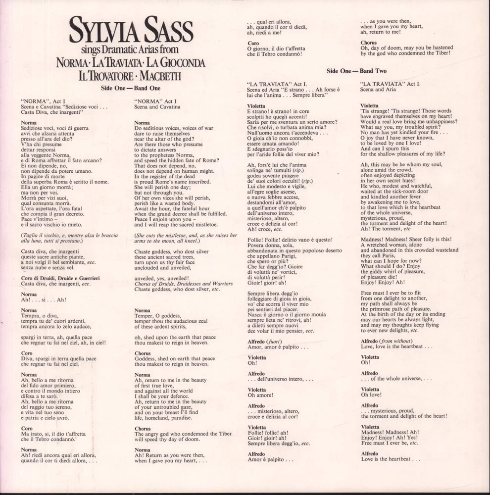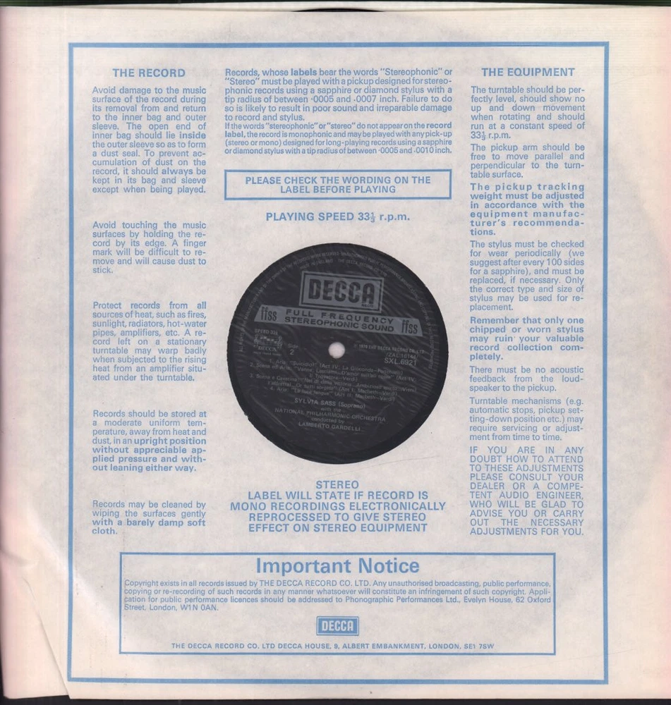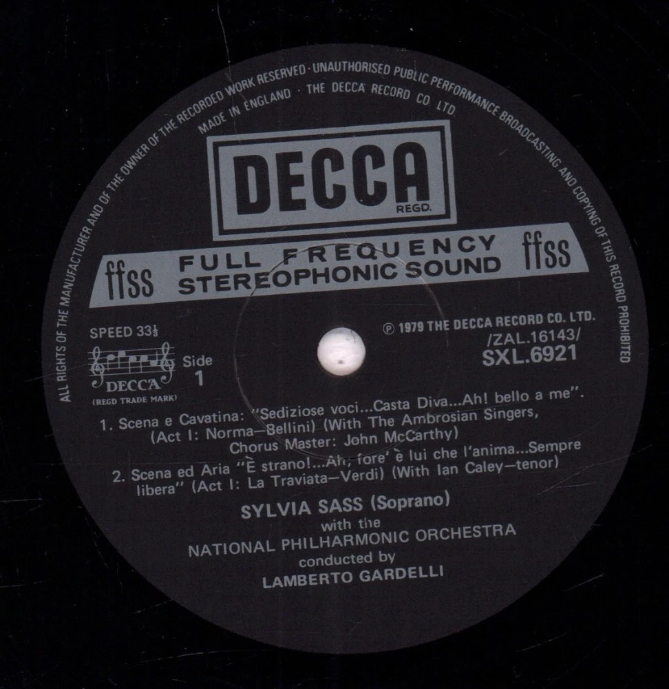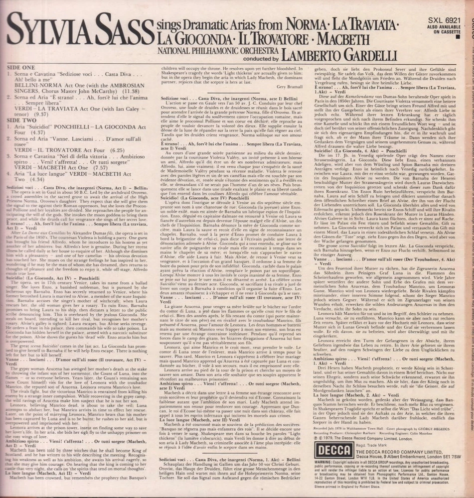 GRADING Our Grading System The table below is an overview of how our grading system works. The first grade is for the sleeve and second grade is for the media/disc, e.g. VG+/EX means that the item's sleeve is in Very Good Plus condition and the media/disc is in Excellent condition. If there is only one condition, e.g. /EX, it means that the item is not in a picture sleeve and that the media/disc is in excellent condition. Records that aren't in picture sleeves will either be in a company sleeve or a generic plain sleeve. If you have any questions, please get in touch. Condition Sleeve Media MINT (10/10) Mint, perfect Mint, perfect EX+ (9/10) Excellent plus, near mint Excellent plus, near perfect EX (8/10) Excellent, well looked after, clean, only slight signs of use Excellent, well looked after, clean, only slight signs of use EX- (7/10) Excellent minus, light wear and signs of use Excellent minus, light wear and signs of use VG+ (6/10) Very good plus, some moderate wear Very good plus, some scuffs, no deep marks VG (5/10) Very good, well used and worn Very good, well used and marked VG- (4/10) Very good minus, very worn Very good minus, very worn and marked GOOD (3/10) Good, some major wear Good, some major wear and scuffing FAIR (2/10) Fair, major wear Fair, major wear and scuffing POOR (1/10) Poor, severe wear Poor, severe wear and scuffing DELIVERY Combined Postage If you add all the items you wish to purchase from us to your shopping basket/cart, and then go to the checkout page from the shopping basket page, the shipping cost will be automatically combined. Packaging All of our items are parcelled using strong specially designed packaging, each vinyl in an order is placed in a clear plastic sleeve and plain paper white sleeve, and is separated from its cover (unless it is advertised as sealed), to prevent any damage during transit. If an item is sealed, and you would prefer the vinyl to be placed outside of its sleeve before dispatch, please let us know. Prices You can see all delivery options and prices for an item on the "Postage and payments" tab. Tracked delivery If you wish to have a tracking number with your order, please select the "Signed" or "Express" delivery option, "Standard" delivery does not include a tracking number. SHOP Click here to view our Ebay shop, with over 200,000 items in stock FAQ Does a used item include the original inner sleeve/insert/poster etc.? We will always include in the description if a used item includes any additional parts, e.g. "with inner" or "includes poster", if you know an item originally came with any additional parts, such as a printed inner sleeve, and it isn't mentioned in the description, then generally the used item won't include it, but please feel free to ask. New items will always be complete, unless otherwise specified. CATEGORIES Shop Home 10" Vinyl Records 12" Vinyl Records 7" Vinyl Records Cassettes (Tape) CDs (Compact Discs) LP Vinyl Records Music Memorabilia Other Artist Sylvia Sass / Lamberto Gardelli / National Philharmonic Orchestra Title Sings Dramatic Arias Format LP Vinyl Country UK Label Decca Catalogue Number SXL6921 Year 1979 Description 6 track vinyl lp stereo pressing with insert Condition (Sleeve/Disc) EX-/EX- Track List A1. Scena E Cavatina "Sediziose Voci...Casta Diva...Ah! Bello A Me" (Norma Act One) - 11:38 A2. Scena Ed Aria "E Strano!...Ah, Fors'è Lui Che L'Anima...Sempre Libera" (La Traviata Act One) - 9:37 B1. Aria "Suicidio!" (La Gioconda Act Four) - 4:37 B2. Scena Ed Aria "Vanne Lasciami...D'Amor Sull'ali Rosee" (Il Trovatore Act Four) - 6:25 B3. Scena E Cavatina "Nel Dì Delle Vittoria...Ambizioso Spirto...Vieni! T'Affretta!...Or Tutti Sorgete" (Macbeth Act One) - 7:57 B4. Aria "La Luce Langue" (Macbeth Act Two) - 4:34 DELIVERY INFORMATION If you wish to have a tracking number with your order, please choose the Signed or Express delivery option, the Standard delivery option does not include a tracking number. Please note, the Express option for delivery outside of the UK includes a tracking number, but has the same delivery time as the Standard option. ABOUT US Vinyl Tap has been in the business of selling music for over 30 years, and in that period we have supplied many thousands of collectors and music fans around the globe with vinyl, CDs and music memorabilia. You can check out the over 200,000 items that we have in stock on our Ebay shop, here . Artist: Sylvia Sass / Lamberto Gardelli / National Philharmonic Orchestra - Title: Sings Dramatic Arias - Format: LP Vinyl - Country: UK - Label: Decca - Catalogue Number: SXL6921 - Year: 1979 - Description: 6 track vinyl lp stereo pressing with insert