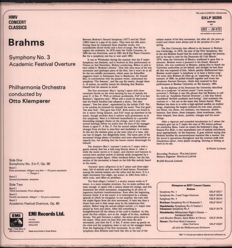 GRADING Our Grading System The table below is an overview of how our grading system works. The first grade is for the sleeve and second grade is for the media/disc, e.g. VG+/EX means that the item's sleeve is in Very Good Plus condition and the media/disc is in Excellent condition. If there is only one condition, e.g. /EX, it means that the item is not in a picture sleeve and that the media/disc is in excellent condition. Records that aren't in picture sleeves will either be in a company sleeve or a generic plain sleeve. If you have any questions, please get in touch. Condition Sleeve Media MINT (10/10) Mint, perfect Mint, perfect EX+ (9/10) Excellent plus, near mint Excellent plus, near perfect EX (8/10) Excellent, well looked after, clean, only slight signs of use Excellent, well looked after, clean, only slight signs of use EX- (7/10) Excellent minus, light wear and signs of use Excellent minus, light wear and signs of use VG+ (6/10) Very good plus, some moderate wear Very good plus, some scuffs, no deep marks VG (5/10) Very good, well used and worn Very good, well used and marked VG- (4/10) Very good minus, very worn Very good minus, very worn and marked GOOD (3/10) Good, some major wear Good, some major wear and scuffing FAIR (2/10) Fair, major wear Fair, major wear and scuffing POOR (1/10) Poor, severe wear Poor, severe wear and scuffing DELIVERY Combined Postage If you add all the items you wish to purchase from us to your shopping basket/cart, and then go to the checkout page from the shopping basket page, the shipping cost will be automatically combined. Packaging All of our items are parcelled using strong specially designed packaging, each vinyl in an order is placed in a clear plastic sleeve and plain paper white sleeve, and is separated from its cover (unless it is advertised as sealed), to prevent any damage during transit. If an item is sealed, and you would prefer the vinyl to be placed outside of its sleeve before dispatch, please let us know. Prices You can see all delivery options and prices for an item on the "Postage and payments" tab. Tracked delivery If you wish to have a tracking number with your order, please select the "Signed" or "Express" delivery option, "Standard" delivery does not include a tracking number. SHOP Click here to view our Ebay shop, with over 200,000 items in stock FAQ Does a used item include the original inner sleeve/insert/poster etc.? We will always include in the description if a used item includes any additional parts, e.g. "with inner" or "includes poster", if you know an item originally came with any additional parts, such as a printed inner sleeve, and it isn't mentioned in the description, then generally the used item won't include it, but please feel free to ask. New items will always be complete, unless otherwise specified. CATEGORIES Shop Home 10" Vinyl Records 12" Vinyl Records 7" Vinyl Records Cassettes (Tape) CDs (Compact Discs) LP Vinyl Records Music Memorabilia Other Artist Otto Klemperer / Philharmonia Orchestra Title Klemperer Conducts Brahms - Symphony No. 3 Format LP Vinyl Country UK Label Hmv Concert Classics Catalogue Number SXLP30255 Year 1976 Description 3 track stereo - sleeve has creases, vinyl has light marks Condition (Sleeve/Disc) VG+/VG+ Track List Symphony No. 3 In F, Op. 90 - A1.1. Allegro Con Brio - UN Poco Sostenuto - Tempo 1 - A1.2. Andante - B1.3. Poco Allegretto - B1.4. Allegro - Un Poco Sostenuto B2. Academic Festival Overture, Op. 80 DELIVERY INFORMATION If you wish to have a tracking number with your order, please choose the Signed or Express delivery option, the Standard delivery option does not include a tracking number. Please note, the Express option for delivery outside of the UK includes a tracking number, but has the same delivery time as the Standard option. WE HAVE MORE OTTO KLEMPERER / PHILHARMONIA ORCHESTRA ITEMS IN STOCK We have more items in stock by this artist, click here to see them. ABOUT US Vinyl Tap has been in the business of selling music for over 30 years, and in that period we have supplied many thousands of collectors and music fans around the globe with vinyl, CDs and music memorabilia. You can check out the over 200,000 items that we have in stock on our Ebay shop, here . Artist: Otto Klemperer / Philharmonia Orchestra - Title: Klemperer Conducts Brahms - Symphony No. 3 - Format: LP Vinyl - Country: UK - Label: Hmv Concert Classics - Catalogue Number: SXLP30255 - Year: 1976 - Description: 3 track stereo - sleeve has creases, vinyl has light marks