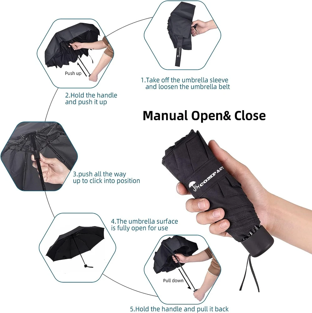 SY COMPACT Travel Umbrella: Lightweight and Portable Mini Umbrella Product Overview Introducing the SY COMPACT Travel Umbrella , your ultimate companion for rainy days. This lightweight and portable mini umbrella is designed to fit perfectly in your bag, ensuring you are always prepared for unexpected showers. Manufactured by a factory outlet shop , it combines durability, style, and functionality, making it an essential accessory for both men and women. Key Features 1. Lightweight and Portable Design The SY COMPACT Travel Umbrella is incredibly lightweight, making it easy to carry around without adding extra weight to your bag. Its compact size ensures it fits conveniently into purses, backpacks, or even coat pockets. 2. Durable Construction Constructed with high-quality materials, this umbrella is built to withstand harsh weather conditions. The sturdy frame and reinforced ribs provide excellent wind resistance, ensuring that the umbrella maintains its shape even in strong gusts. 3. Easy to Open and Close The umbrella features an automatic open and close mechanism , allowing you to open or close it with just the push of a button. This feature is particularly useful when you need to quickly shield yourself from the rain or pack the umbrella away when entering a dry area. 4. Water-Repellent Canopy The canopy of the SY COMPACT Travel Umbrella is made from water-repellent fabric , ensuring that raindrops slide off effortlessly. This helps keep you dry and also makes the umbrella quick to dry after use. 5. UV Protection In addition to keeping you dry, this umbrella also offers UV protection , making it a versatile accessory for both rainy and sunny days. The canopy is coated with a special UV-resistant layer that blocks harmful sun rays, protecting your skin from sunburn. 6. Stylish and Elegant The SY COMPACT Travel Umbrella comes in a variety of colors and patterns, allowing you to choose one that suits your style. Whether you prefer classic black or a vibrant print, there is an option for everyone. Product Specifications Canopy Diameter : 37 inches Length When Closed : 10.8 inches Weight : 0.9 pounds Rib Material : Aluminum and fiberglass Canopy Fabric : 210T pongee fabric Opening Mechanism : Automatic UV Protection : UPF 50+ Benefits of Using the SY COMPACT Travel Umbrella 1. Always Be Prepared With its compact and portable design, the SY COMPACT Travel Umbrella ensures you are always prepared for sudden changes in weather. Its small size allows you to carry it with you wherever you go, so you never have to worry about getting caught in the rain unprepared. 2. Protection from the Elements Whether it's a rainy day or a sunny afternoon, this umbrella has you covered. The water-repellent canopy keeps you dry during rainstorms, while the UV protection shields you from harmful sun rays. 3. Easy to Use The automatic open and close mechanism makes this umbrella incredibly user-friendly. You can operate it with one hand, making it convenient when you're carrying bags or other items. 4. Durable and Long-Lasting Built with high-quality materials, the SY COMPACT Travel Umbrella is designed to last. The durable frame and reinforced ribs ensure it can withstand wind and rain, providing reliable protection for years to come. 5. Stylish Accessory In addition to its practical benefits, this umbrella also serves as a stylish accessory. With a range of colors and designs to choose from, you can find one that complements your outfit and personal style. Customer Testimonials 1. Emily R. "I love my SY COMPACT Travel Umbrella! It's so lightweight and easy to carry in my bag. The automatic open and close feature is a game-changer, especially when I'm juggling groceries and my toddler. Plus, the design is super cute!" 2. Michael T. "This umbrella is incredibly durable. I've used it in several windstorms, and it hasn't flipped inside out once. The water-repellent fabric really works, and it dries quickly after use. I highly recommend it to anyone looking for a reliable travel umbrella." 3. Sarah L. "The SY COMPACT Travel Umbrella is the best umbrella I've ever owned. It's compact, stylish, and very effective at keeping me dry. I also love that it provides UV protection, so I use it on sunny days as well. Great product!" How to Use Step-by-Step Instructions Open the Umbrella : Press the button on the handle to automatically open the umbrella. The canopy will fully extend and lock into place. Close the Umbrella : Press the same button again to automatically collapse the canopy. Once collapsed, manually push the umbrella shaft down to its compact size. Store the Umbrella : Place the closed umbrella in its protective sleeve and store it in your bag or pocket for easy access. Maintenance and Care 1. Drying the Umbrella After using the umbrella in the rain, allow it to air dry fully before folding it back into its compact size. This helps prevent mold and mildew from forming on the canopy. 2. Cleaning the Canopy To clean the canopy, use a damp cloth and mild soap to gently wipe away any dirt or stains. Avoid using harsh chemicals or abrasive materials, as they can damage the fabric. 3. Storing the Umbrella Store the umbrella in a cool, dry place when not in use. Avoid leaving it in direct sunlight for extended periods, as this can cause the fabric to fade and weaken. Frequently Asked Questions (FAQs) 1. Is the umbrella windproof? Yes, the SY COMPACT Travel Umbrella is designed to withstand wind. The reinforced ribs and sturdy frame provide excellent wind resistance, preventing the umbrella from flipping inside out. 2. Can I use this umbrella for sun protection? Yes, the umbrella offers UV protection with a UPF 50+ rating. The canopy is coated with a UV-resistant layer that blocks harmful sun rays, making it suitable for use on sunny days. 3. How do I know when to replace the umbrella? If you notice any significant damage to the canopy, frame, or ribs, it may be time to replace the umbrella. Regular maintenance and car