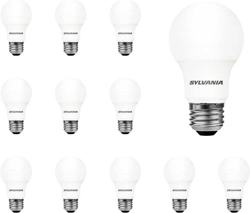 SYLVANIA LED A19 Light Bulb, 40W Equivalent, Efficient 6W, Medium Base, Frosted 5000K Daylight, 12 Pack GREAT VALUE - 12 LED bulbs with 450 lumens of light output at only 6 watts. Replace your old incandescent bulbs for a brighter and more energy-friendly home LONG-LASTING – These bulbs are a great energy-saving for old incandescent bulbs because they have a total lifespan of up to 11,000 hours. You won't need to constantly change your light bulbs anymore ENERGY-SAVING – These LED light bulbs require less energy and can save you up to 85% on your energy bill. Each daylight bulb works as a great for old 40W incandescent bulb NO WARM-UP TIME – These A19 bulbs have no warm-up time. When you flip the switch, it lights up instantly with a full 450 lumens of brightness and a stable daylight color SAFE FOR HOME USE – These non-toxic bulbs are mercury and lead free. They also produce no harmful ultraviolet or infrared radiation Brighten your home with SYLVANIA 6W LED A19 light bulbs! This 12 pack of LED lamps are a great for your 40W incandescent lamps. With just 6 watts, they will brighten your house with 450 lumens of light. Ideal for use in ceiling lights or floor lamps, the SYLVANIA LED bulbs illuminate the house in quality and welcoming light. Additionally, it will help you save up to 85 percent on your energy costs because it requires less energy and lasts longer than incandescent lamps. In fact, it has a lifespan of 11,000 hours. Unlike other light bulbs, SYLVANIA LED lights do not overheat. Our LED lights are UV, IR, and mercury free. You can also safely install them in ceiling light fixtures or floor lamps (not for use in fully enclosed fixtures). With these bulbs, you can be sure that what’s inside your house is safe to use. Keep your home bright and your electricity bill low with the SYLVANIA 6W LED A19 Bulbs; See the clear difference it makes.