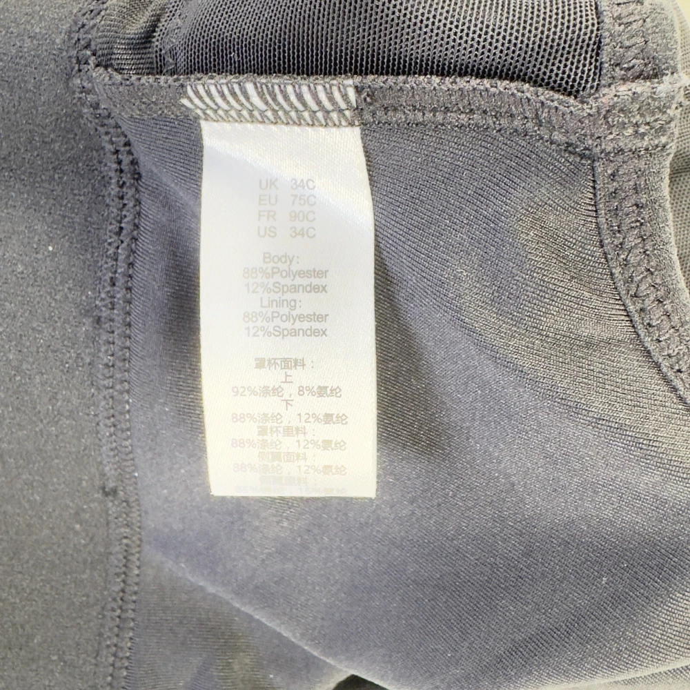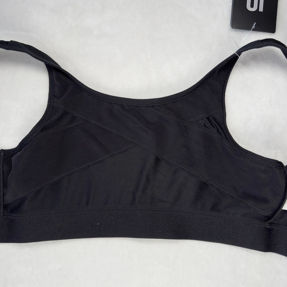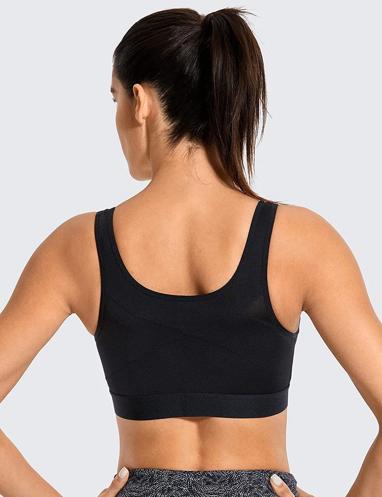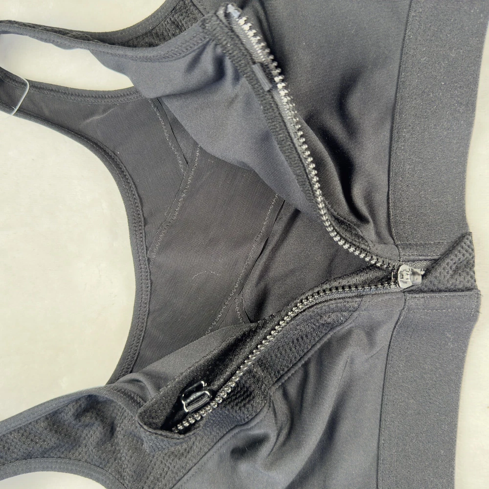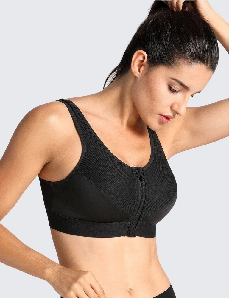 Women's Zip Front Sports Bra, perfect for any performance or activity. This bra features a racerback strap, zip front closure with accent zipper, and high support level for all types of workouts. The bra is made of a blended fabric consisting of 88% polyester and 12% spandex, making it perfect for moisture-wicking during any activewear occasion. The solid black color adds a touch of style to the sports theme of the bra, and the wireless underwire type with cup size A ensures comfort and support for size 34C.