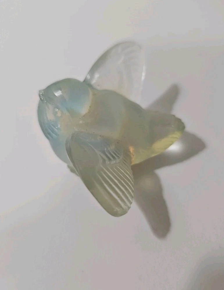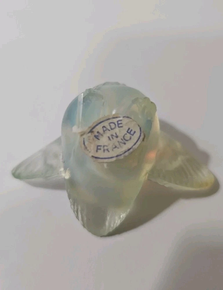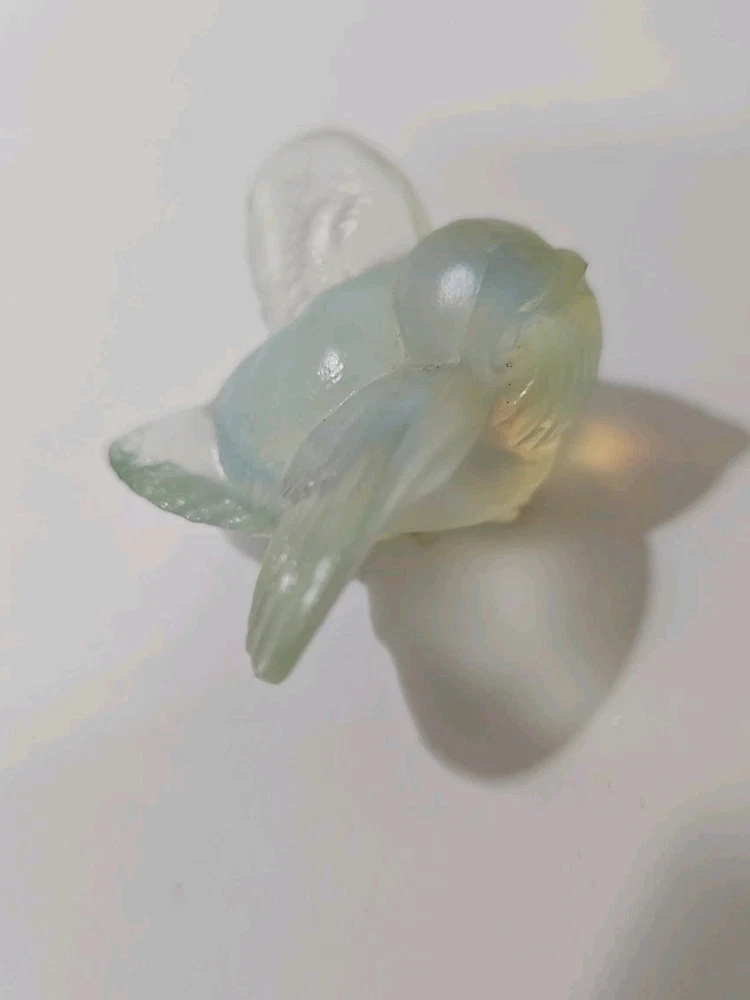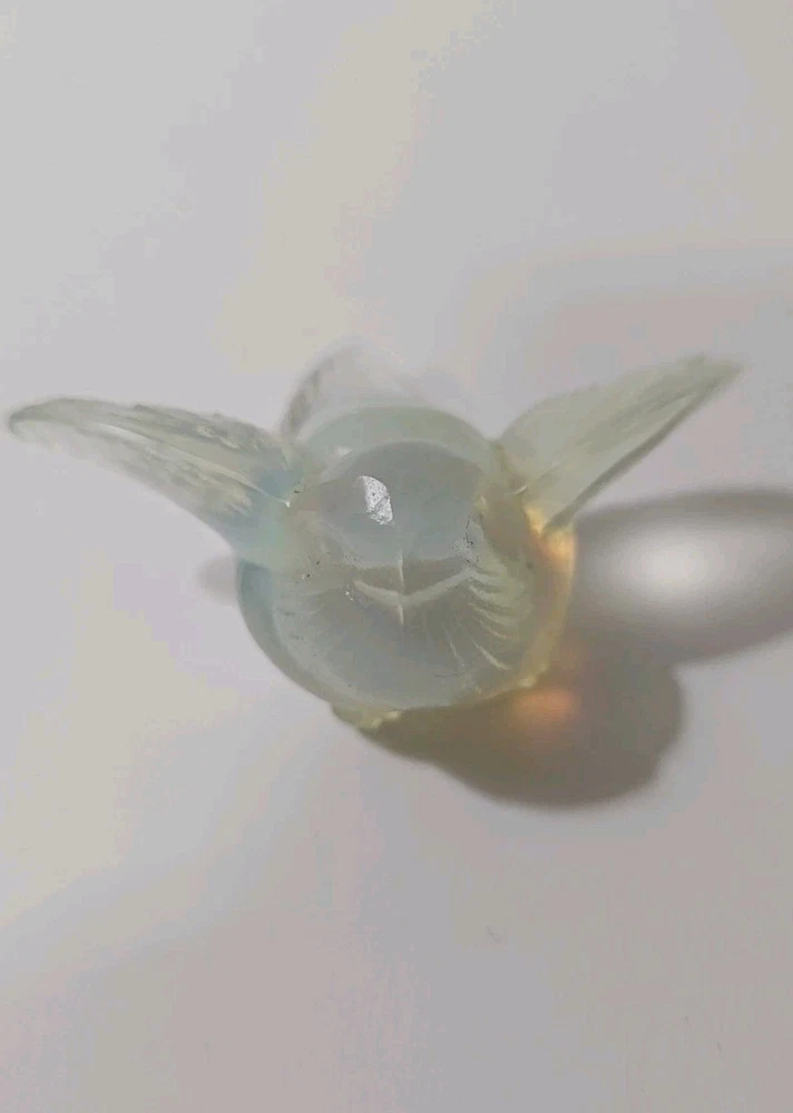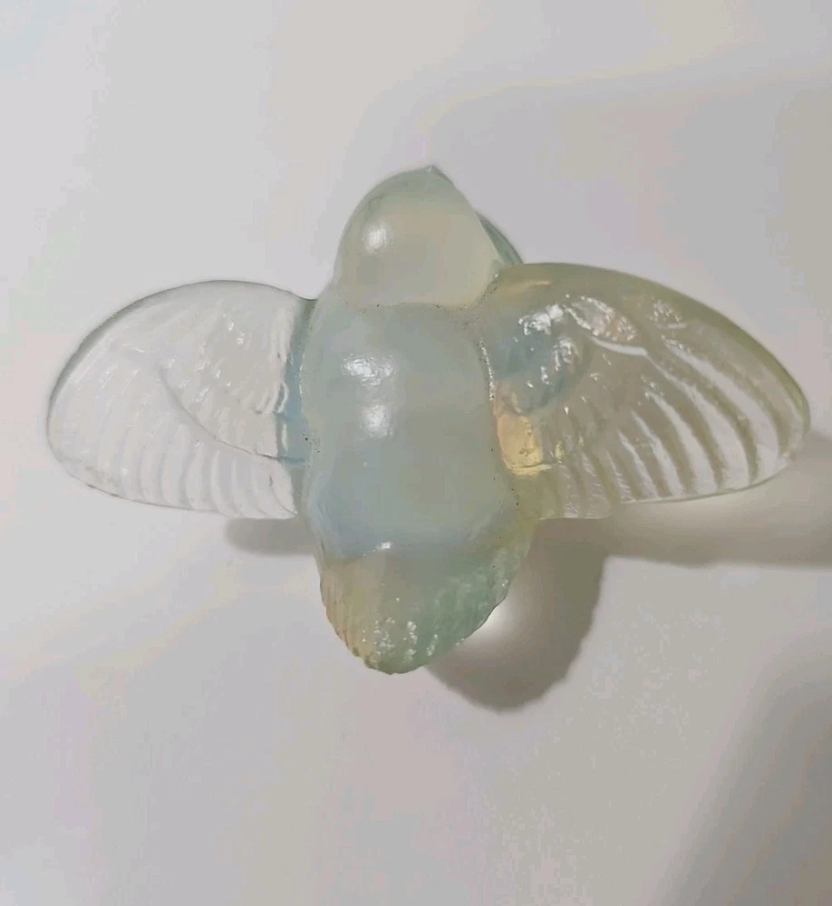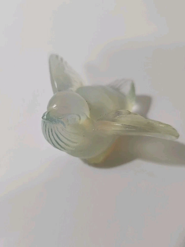 This is a vintage Sabino opalescent glass figurine of a bird, specifically a sparrow, with its wings out as if ready for flight. The piece is clear in color and has a 3D effect, featuring decorative details. It is signed by the artist and was made in France. The figurine showcases the brand's production style of opalescent glass. Good condition no chips