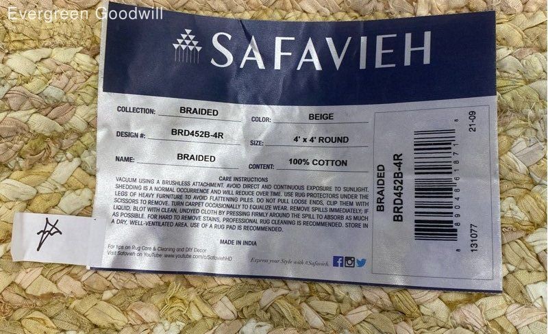 Braided Safavieh Beige Cotton Circular Rug Brand: Safavieh Style: Braided Type: Circular Rug Color: Beige Material: Cotton Condition: Good - shows some sign of wear Evergreen Goodwill helps people get jobs across Northwest Washington by offering high-quality free job training, education and job placement. We empower individuals to overcome barriers to working by providing comprehensive support and connecting them with life-changing job opportunities, ensuring they are career-ready and can support themselves and their families. ***Disclaimer*** All items were donated to Evergreen Goodwill of Northwest Washington with no history or provenance. The auction is for all items pictured. Items may need servicing and/or benefit from a cleaning upon arrival. Please see photos for additional details and feel free to ask questions. PAYMENTS Please note that your entire order will be canceled by eBay if the oldest item exceeds 4 days without payment. Once an order is canceled, we are unable to re-invoice and the item will be relisted. For a combined shipping invoice, please send us one request within 3 days of winning the first item to avoid cancelation of your entire order. Once a combined invoice has been sent, we are unable to add additional items to the invoice. SHIPPING Local pickup is not available at this time. International shipping is not available at this time. We offer combined shipping as long as items will ship safely together. Auctions must end within 3 days of each other to be eligible for combined shipping. Please hold off on payment until all auctions have ended then proceed to checkout. Please do not pay for any items individually if you wish to have them combined - they must be paid at the same time. Items listed for flat-rate shipping are not eligible for combined shipping. PO Box addresses will require USPS shipments as FedEx Ground will not deliver. If FedEx is selected we may need to invoice for additional shipping costs.