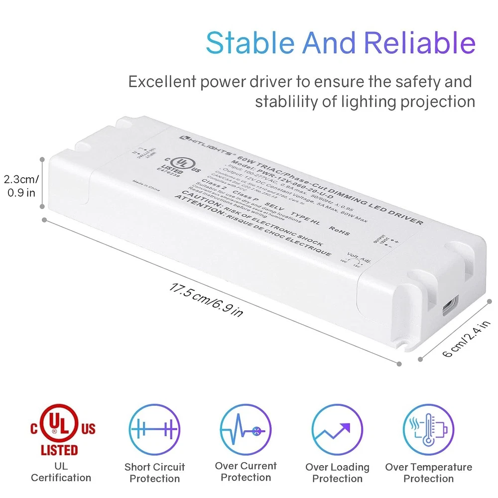 Safety Certified 60W Low Voltage Transformer with Dimming Capability for LEDs ‹ › ‹ › ‹ › ‹ › ‹ › ‹ › ‹ › ‹ › ‹ › Safety Certified 60W Low Voltage Transformer with Dimming Capability for LEDs Features: Constant Voltage Dimmable Driver: Converts 120V AC to 12V DC, compatible with most dimmer switches including those from Lutron and Leviton. Universal Compatibility: Works seamlessly with Forward Phase, Reverse Phase, Triac, MLV, and ELV dimmers. Easy Installation: Comes with a removable AC power cord and screw terminals to ensure compliance with electrical codes. Benefits: Smooth and Reliable Dimming: Easily adjust brightness levels from 0 to 100% without any flicker, creating the perfect ambiance for any occasion. Enhanced Safety: Features short circuit, overload, and over-temperature protection, ensuring safety for both the transformer and your lighting project. Specifications: Input: 100-277V AC, 0.9A max. 50/60Hz; Output: 12V DC, 5A max, 60W max. IP20 rated for indoor use only. Peace of Mind: UL Listed, Class 2 certified, providing superior confidence in your lighting solutions. Why choose our Low Voltage Transformer? Transform your lighting experience with our 60W Low Voltage Transformer, designed for versatility and reliability. With its dimming capabilities and universal compatibility, this transformer gives you control over the ambiance of your space, whether it’s a cozy evening at home or hosting a vibrant gathering. Safety is our top priority, and with built-in protection features, you can trust that your projects are in safe hands. Shop with confidence knowing you are backed by a 2-year warranty and a dedicated US-based customer service team ready to assist you. Elevate your lighting projects today with our Safety Certified Low Voltage Transformer. Shipping Free & Fast Shipping - We offer free shipping to most of the USA with a normal delivery time of 3-7 days. However, due to the current situation, additional delivery time (up to 3 weeks) may be required for some items. Alternative Carriers - We may use alternative carriers (e.g. USPS, FedEx, UPS, etc.) to ensure your package arrives safely and on time. Due to the use of multiple carriers, we are unable to provide a tracking number automatically. Handling Time - Orders are processed and shipped within 1-2 business days of receiving cleared payment. Shipping Restrictions - Shipping to Alaska, Hawaii, Puerto Rico, Guam, and other US territories may incur shipping charges or delivery restrictions. Please contact us before ordering, or your order can be refunded/cancelled. State Restrictions - There may be restrictions based on your state of purchase. For example, certain items may not be shipped to California due to state regulations. Contact for Tracking Updates - If you require tracking updates or have any concerns about the delivery of your order, please feel free to contact us, and we will be happy to assist you. Return 30-Day Hassle-Free Returns - We want you to be completely satisfied with your purchase. If you are not, you can return the item within 30 days of receiving it for a full refund or exchange. Easy Return Process - To start a return, simply contact us and we will provide you with a prepaid return shipping label and detailed instructions. Restocking Fee - There are no restocking fees for returns. However, the buyer is responsible for return shipping costs if the return is not due to a seller's error. Refund Processing Time - Refunds will be processed within 5 business days of receiving the returned item in its original condition. Payment We accept all major credit cards, PayPal, and Apple Pay for your convenience. Your payment information is secure and encrypted to ensure a safe and seamless transaction. Please complete your payment within 3 days of purchase to avoid any delays in shipping. Feedback Your feedback is extremely important to us. We strive to provide the best products and customer service possible. If you are satisfied with your purchase, please take a moment to leave us a positive review. If you have any concerns or issues with your order, please contact us before leaving negative feedback. We are committed to resolving any problems and ensuring your satisfaction. Contact Us If you have any questions or concerns, please feel free to reach out to our customer support team. You can contact us through the eBay messaging system. We are available Monday to Friday, 9:00 am to 5:00 pm EST, and we will do our best to respond to your inquiry within 24 hours. Buy it now and enjoy a pleasant shopping experience! UPC: Not Set Item Diameter: 9.33 x 2.99 x 2.64 inches Item Height: Not Set Item Length: Not Set Item Weight: 1.21 pounds Item Width: Not Set Product Line: Not Set Unit Quantity: 1 Features: Dimmable,Low Voltage,Short Circuit Protection,Overload Protection,Over Temperature Protection,Easy Installation,Smooth Dimming Material: Plastic,Metal Department: Adults Smart Home Protocol: Not Set Smart Home Compatibility: Lutron,Leviton Labels & Certifications: Not Set Brand: Unbranded Type: Transformer Lighting Technology: LED Number in Pack: 1 Current Type: AC Connectors: Screw Terminals Voltage: 120 V Output Voltage: 12 V Amperage: 5 A Bulb Shape Code: Not Set Power: 60 W Color: Black Power Source: Corded Compatible Product: Not Set MPN: Not Set Model: Not Set Bulb Wattage: Not Set Power Consumption: 60 W Installation Area: Indoor IP Rating: IP20 Style: Not Set LED Chip Code: Not Set Pattern: Not Set Year Manufactured: Not Set Country/Region of Manufacture: Not Set LED String/Strip Type: Not Set Manufacturer Warranty: Not Set Compatible Brand: Not Set Compatible Model: Not Set Unit Type: Not Set Personalized: Not Set
