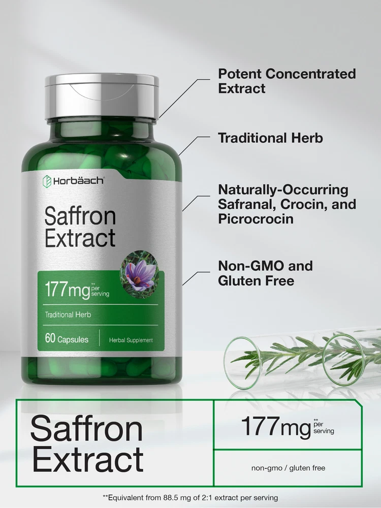 What is Saffron Extract? Saffron is a famous spice derived from the flower of the Crocus Sativus plant that has been used since ancient times. Commonly known as the "Golden Spice" since it is said to be worth its weight in gold, Saffron has gained popularity in modern times for its naturally-occurring nutrients. How to get Saffron Extract: This delicacy can be found in a variety of forms. The most common Dietary Supplements include Pills, Liquid, Tablets and Capsules. However, not all products and brands are created equally. Searching for the best source of this incredible Superfood backed by years of expertise and experience? Horbaach's Pure Saffron Extract: Horbaach's Saffron formula is expertly-crafted for maximum herbal support. Each serving delivers the equivalent of 177 mg of Saffron Extract in Non-GMO and Gluten-Free Quick-Release capsules. Our herbs are put to the test, to ensure supreme purity, potency and excellence. Reap the benefits of this beloved "Golden Spice" today with Horbaach!