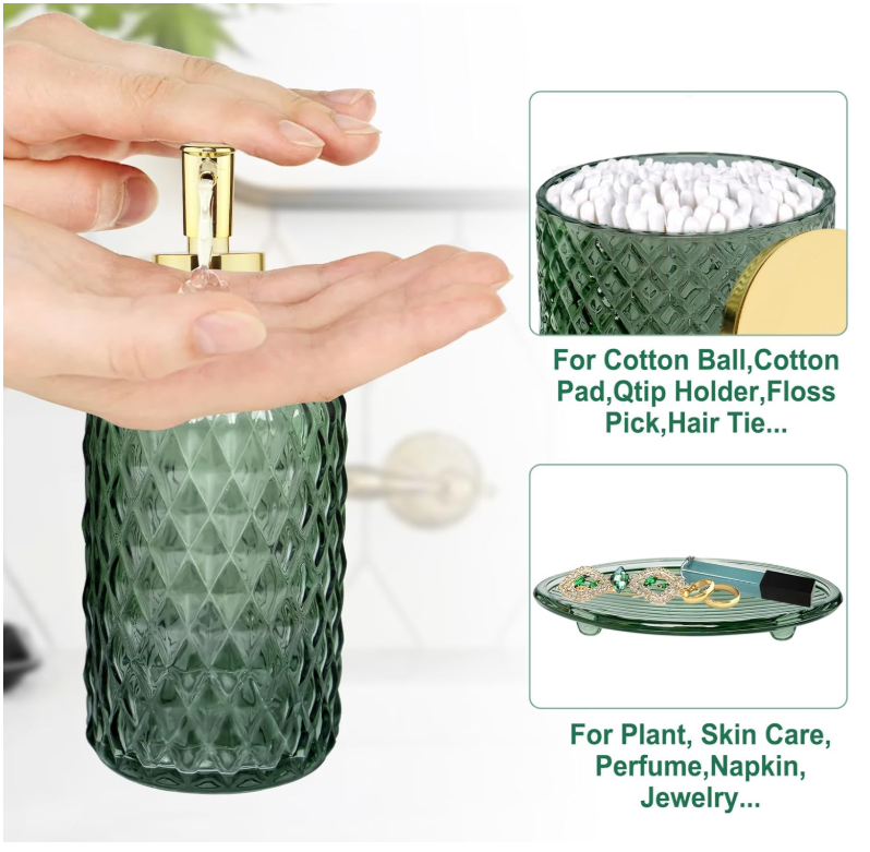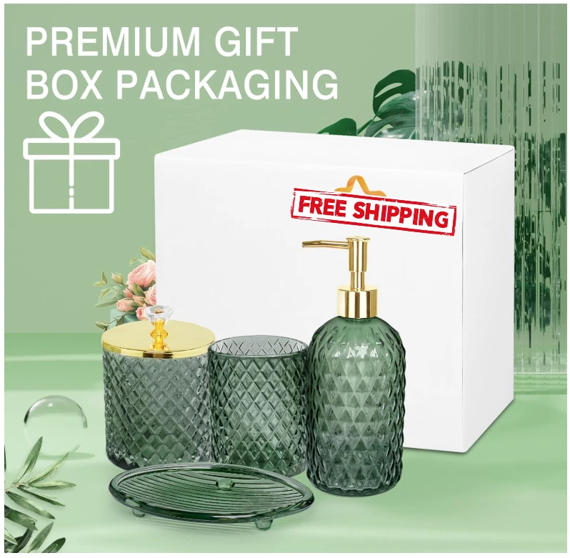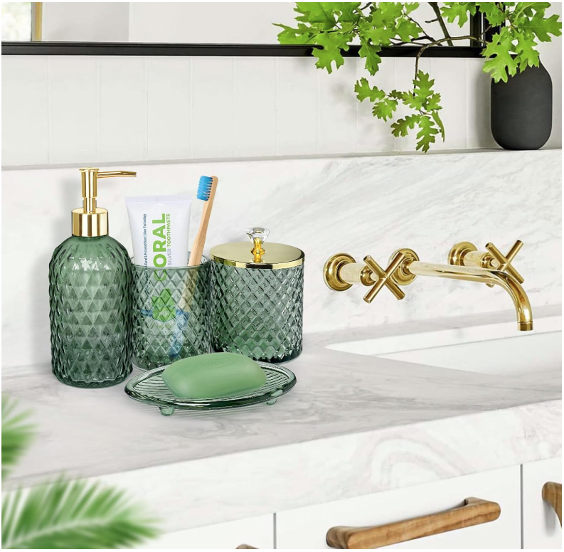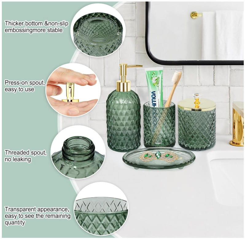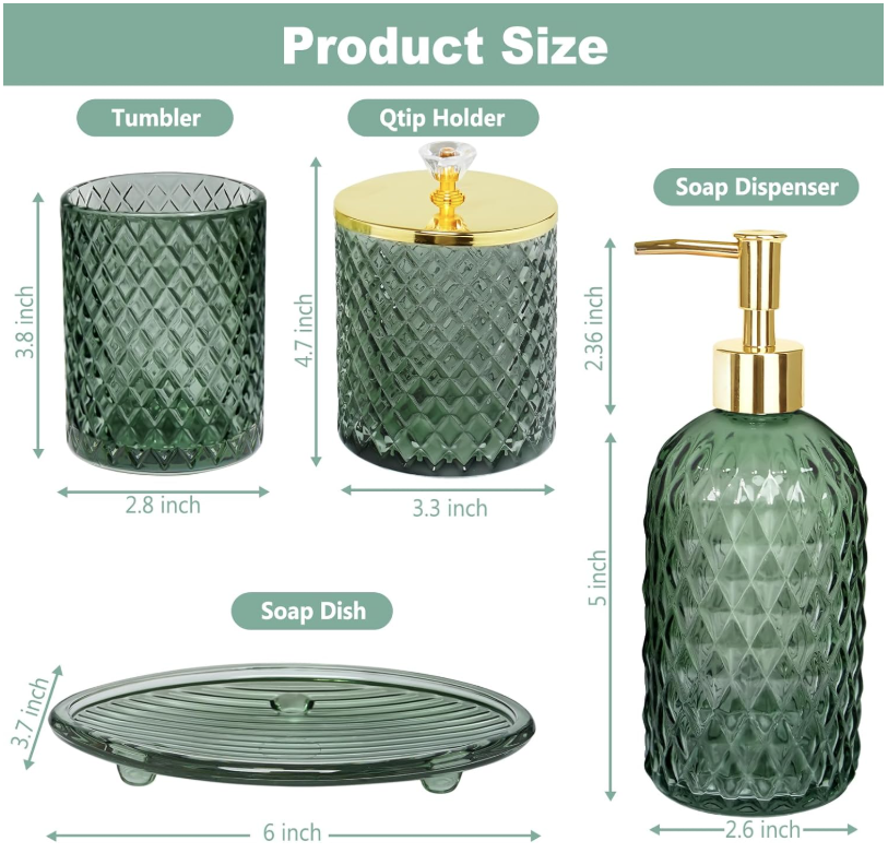Bathroom Accessories Set, 4Pcs Sage Green Glass Bathroom Accessory Set Complete w/Lotion Soap Dispenser, Toothbrush Holder, Qtip Holder, Soap Dish, Gold Bathroom Decor Sets, Gift for Home Apartment Galss MULTIFUNCTION SAGE GREEN GLASS BATHROOM ACCESSORIES SET -- 4 pieces bathroom set includes a Lotion Soap Dispenser, a Soap Dish, a Qtip Holder, and a Toothbrush Holder, Perfect for storing your toiletries or your cosmetics, the green tray can also hold your jewelry and keeping your bathroom counter fully organized and neatly DECORATIONS FOR HOME APARTMENT / BATHROOM -- The sage glass bathroom set is ideal decoration fits various styles: bathroom decor, industrial style, western decor, modern style, contemporary decor, and country decor. Ideal bathroom accessories set for home decor, bathroom decor, and farmhouse decor. Great for the kitchen and bath, for countertop organize, vanity top, makeup table, and craft GREAT GIFTS IDEA -- A perfect gift for family, friends, and coworkers; perfect as a housewarming present, wedding gift, and perfect for remodelers looking to upgrade the bathroom in their home or apartment; bathroom essentials for a new home; guest bathroom decor PREMIUM STURDY MATERIAL & PACKAGING PROTECTION -- All pieces of bathroom accessory set are made of high-quality pressed heavy glass, with a nice weight, non-cheap plastic, and Easy to clean. We have good packaging protection to ensure that your goods are intact when you receive them 100% CUSTOMER SERVICE -- We are committed to presenting the best quality materials and satisfaction services to our customers. If you have any issue with the contemporary bathroom accessories set, please contact us, we will be happy to help you SHIPPING: We offer FREE shipping on all orders! We ship within Three business days of payment, usually sooner. We use a selection of shipping services such as UPS, FedEx, USPS etc. We only ship to the lower 48 states, no APO/FPO addresses or PO Boxes allowed. Local pickups and combined shipping options are not provided at this time. PAYMENT: We accept payment by any of the following methods: PayPal Please pay as soon as possible after winning an auction, as that will allow us to post your item to you sooner! FEEDBACK: Customer satisfaction is very important to us. If you have any problem with your order, please contact us and we will do our best to make you satisfied. Thank you for shopping with us!