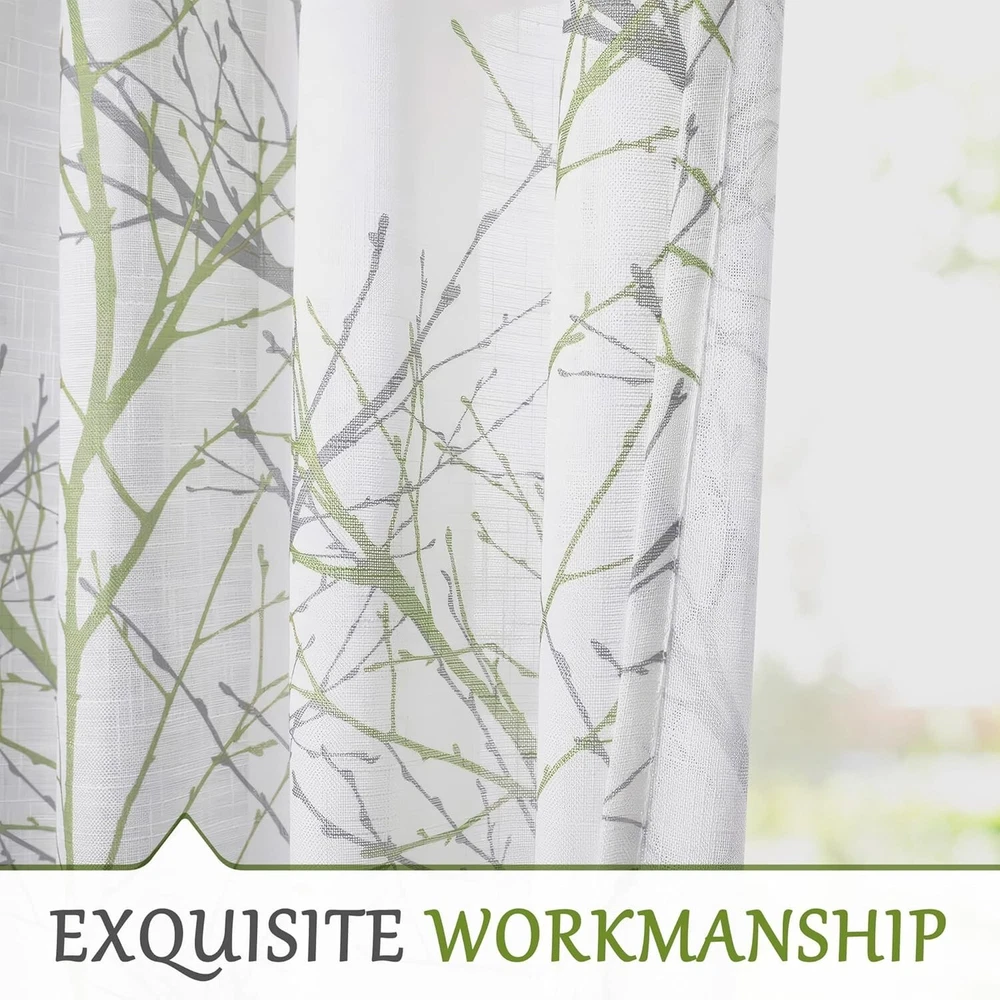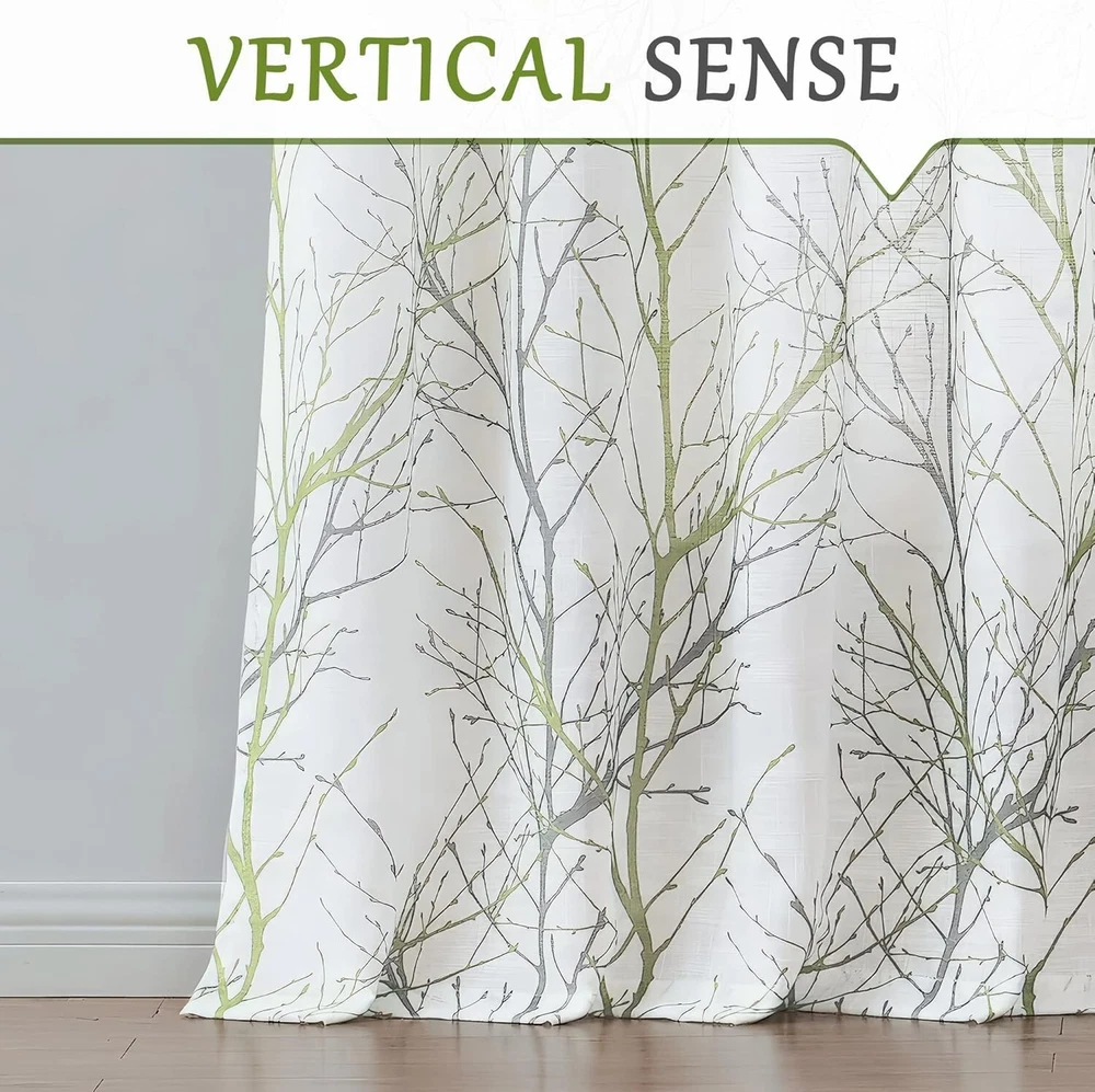 Linen Semi Sheer Curtains for Bedroom, Sage Green White Curtains 54 Inches Long for Living Room, Grey Tree Branch Print Curtain Light Filtering Kitchen Window Drapes, Grommet Top 2 Panels Ready Made Curtains: Sold in pair, 50" w x 54" /panel, 100" w x 54" /pair, Green grey branch on white curtains. Recommend ordering 2 to 3 times rod width for proper look and fullness Naturas Inspired Pattern: Green and grey tree branch print on white background open weave linen Semi Sheer inspires a modern aesthetic twist with the bold and dramatic natural painting pattern Light Filtering & Privacy: Featuring a lovely tree branch design, these curtains strike a perfect balance between functionality and aesthetics. They provide sufficient privacy while allowing ample light to enter, keeping the indoors bright and airy Grommet Top Curtains: 8 silver grey grommets fit any standard or decorative curtain rods up to " in diameter. Easy and convenient to hang. These printing window curtains are perfect for living room, bedroom, kitchen, porch Easy Care: The curtains offer great durability. Machine washable in cold water. Tumble dry low. Quick iron or steam clean at low temperature settings. Feel free to contact me for any product problem, we will certainly respond within 12 hours