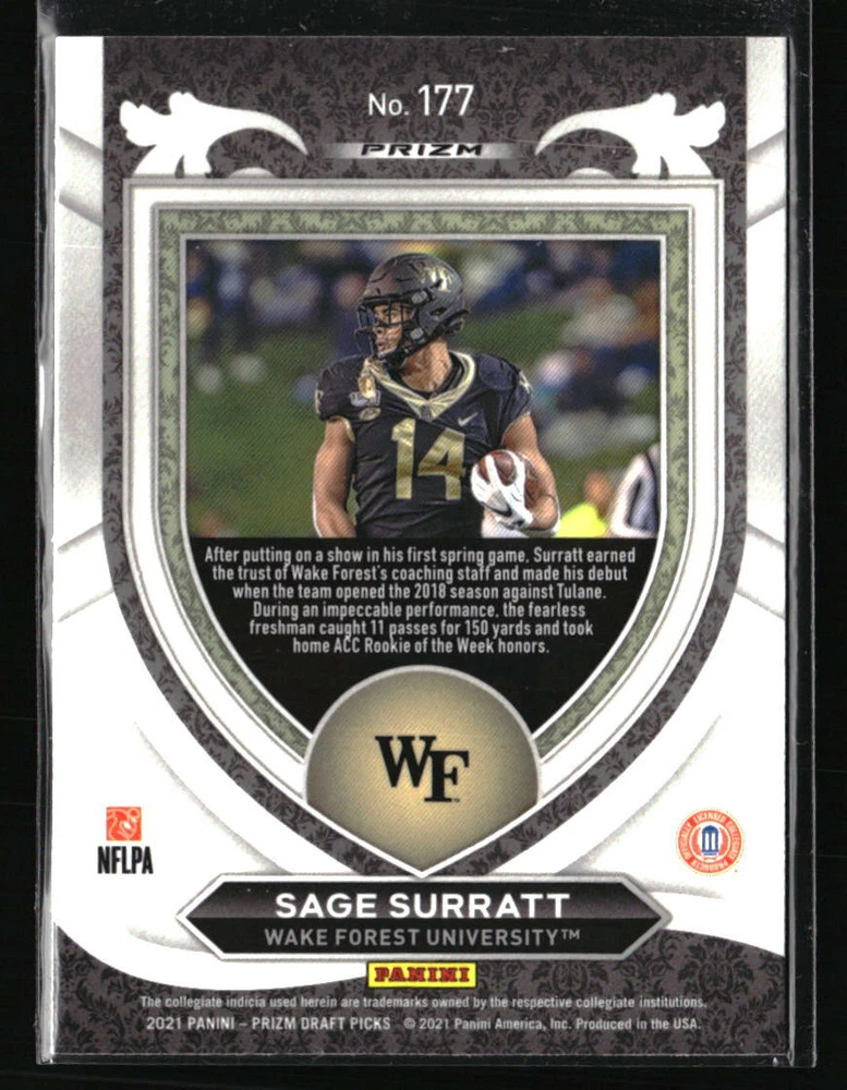 Manufacturer: Panini Prizm Draft Picks Collegiate Autographed: No Sport: Football Player/Athlete: Sage Surratt Parallel/Variety: Gold Ice Year Manufactured: 2021 League: NFL Graded: No Type: Sports Trading Card Set: Panini Prizm Draft Picks Collegiate Season: 2021 Card Number: 177 Features: CRU