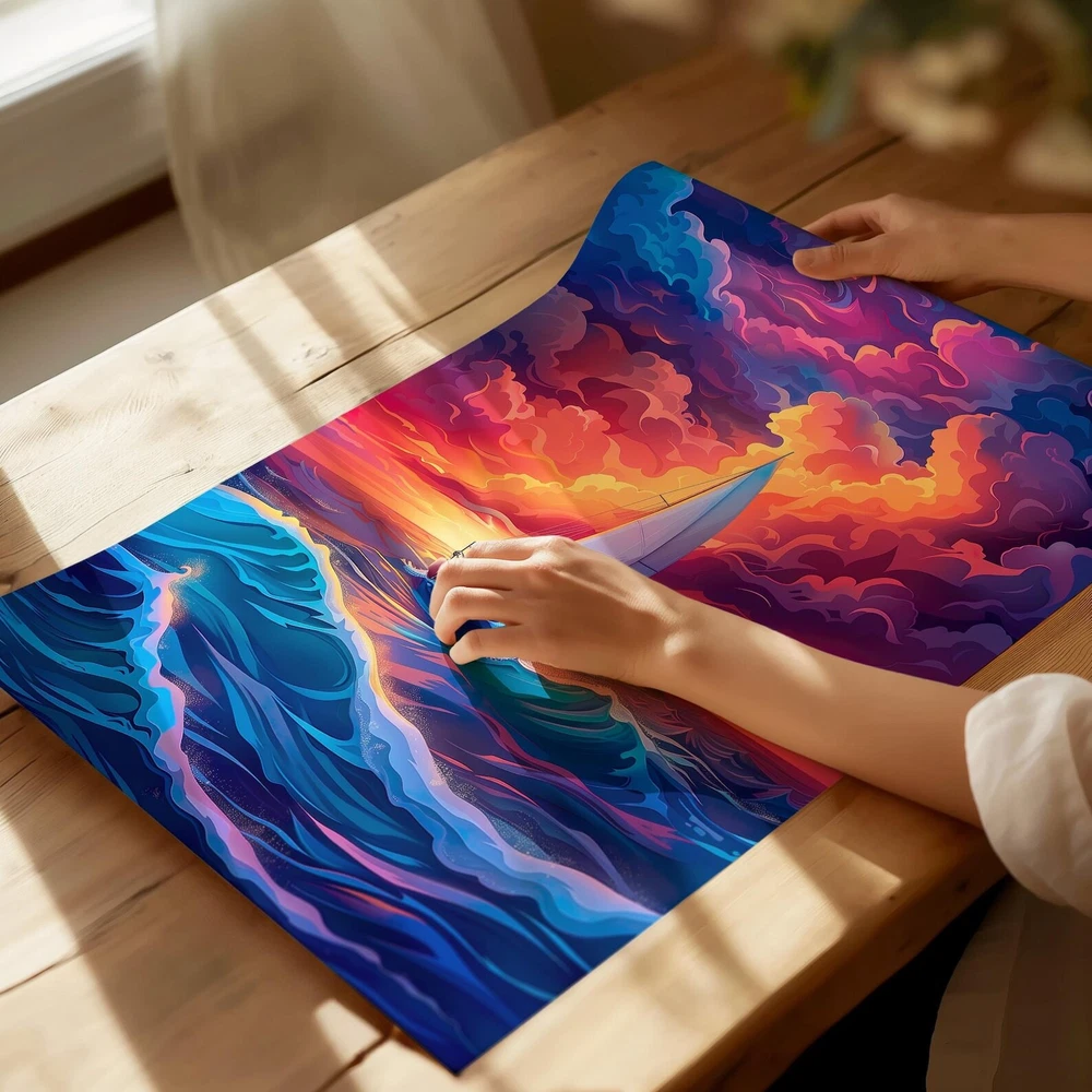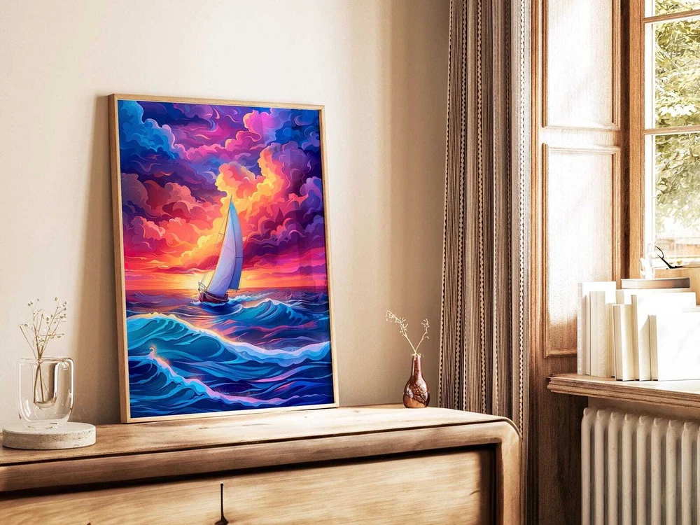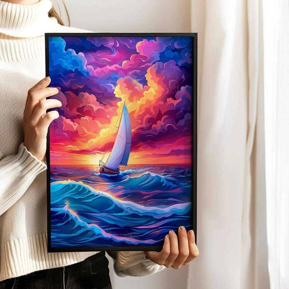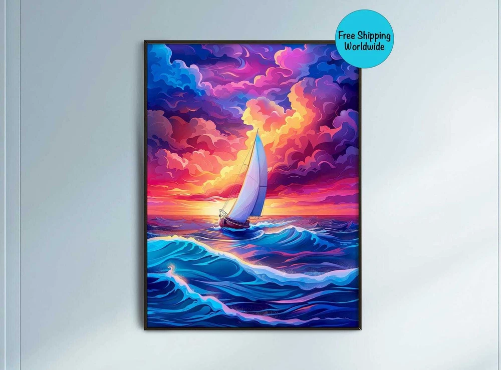 Sailboat Print Colourful Boat Print Coastal Wall Art Beachy Prints Sunset Art Print Maximalist Decor Beachy Wall Art Sailing In Summer Print Material: Premium luster photo paper Print type: Inkjet printing One side printed + The finish provides the highest possible resolution and color saturation + Lasts up to 200 years in color and 400 years in black-and-white + Printed on high-quality resin-coated photo base paper medium + Posters can be hung with double-sided tape, tacks, or framed + Hand washing with a gentle cry cloth is recommended for extended durability I will hand select the best choice of paper for your chosen design to ensure top quality results for a beautiful, bright and luxurious print. All prints are sealed in cellophane slips for protection during transportation, and are shipped in a protective cardboard envelope.