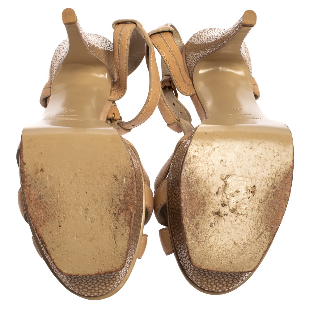 One of the most sought after designs from Saint Laurent is these smart and sophisticated sandals. They are such a craze amongst fashionistas, and it is time you own one yourself. These beige ones are designed from leather, ankle fastenings, and 14 cm heels supported by platforms.Certified by The Luxury Closet - This item has gone through a detailed authentication process overseen by our experts. We offer a lifetime guarantee of authenticity on all our items. Import duties, taxes and charges are not included in the item price. These charges are the buyers responsibility. Please check with your country’s customs office to determine what these additional cost will be prior to buying. Our eBay Store About Us Contact Us Add to Favorite Sellers Saint Laurent Beige Leather and Textured Leather Ankle Strap Platform Sandals Size 40 $166.1 One of the most sought after designs from Saint Laurent is these smart and sophisticated sandals. They are such a craze amongst fashionistas, and it is time you own one yourself. These beige ones are designed from leather, ankle fastenings, and 14 cm heels supported by platforms. Product Details Brand Color Beige Dimensions Material Leather Size 40 Outsole Width 7.5 cm Outsole Length 21 cm Heel Height 14 cm Includes Original Dustbag Certified by The Luxury Closet This item has gone through a detailed authentication process overseen by our experts. We offer a lifetime guarantee of authenticity on all our items. How We Check The in-house team of experts at The Luxury Closet is highly trained to verify the authenticity and the condition of the luxury products. They ensure that only 100% authentic items are put on sale.The evaluation process is unique with its own mix of assessment criteria and differs according to the category. Each item is evaluated based on the following combination of hallmarks, hardware, stitching, symmetry, material, craftsmanship, stamping, codes, hologram stickers, and packaging. Our authenticators also check if the items have been modified or amended (e.g., aftermarket diamonds, replaced batteries, repaired bags, etc.) International Buyers Import duties, taxes and charges are not included in the item price. These charges are the buyers responsibility. Please check with your country’s customs office to determine what these additional cost will be prior to buying.