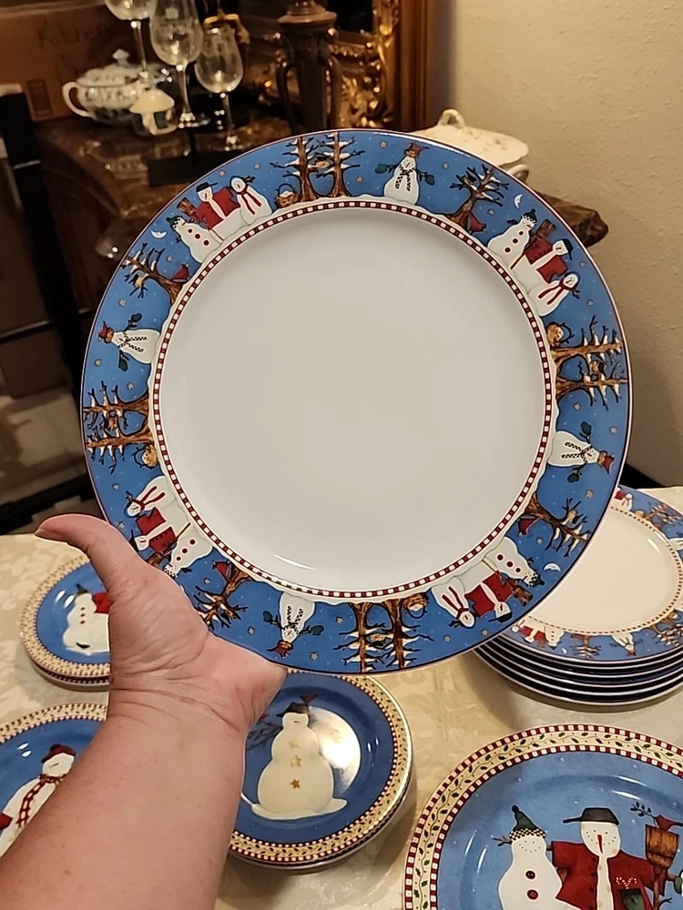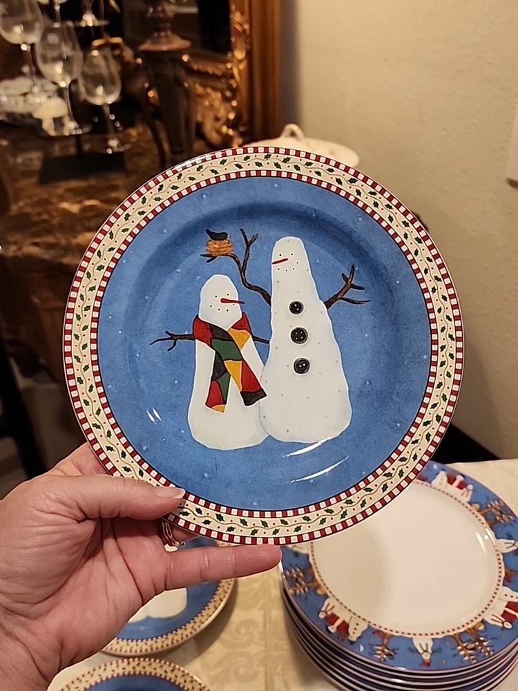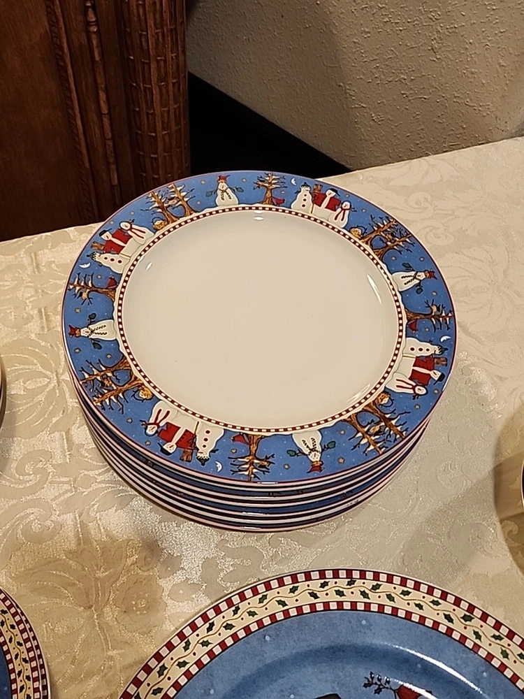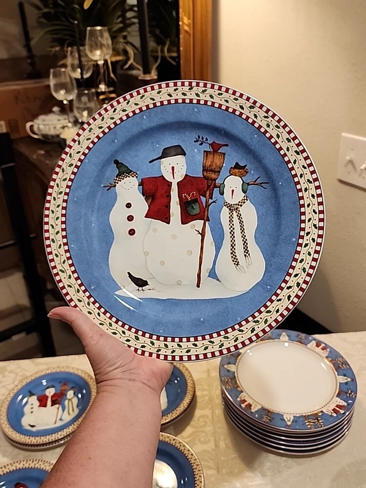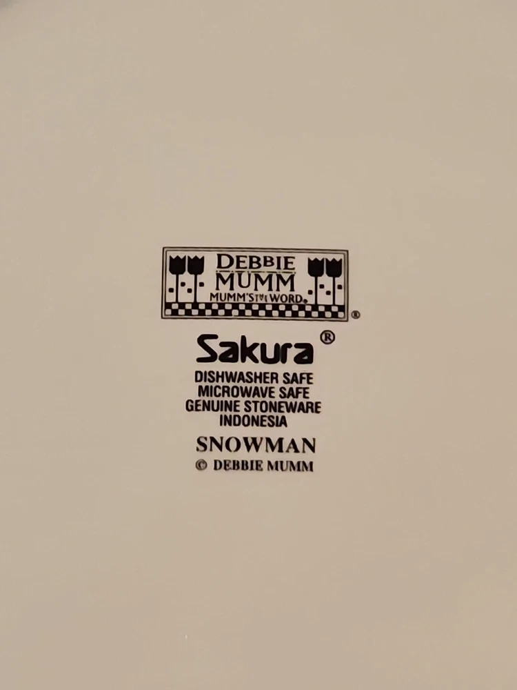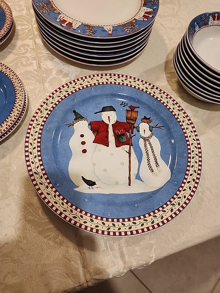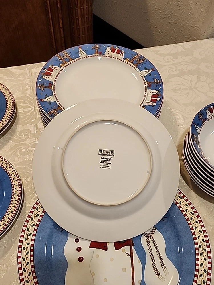 Add a festive touch to your dining table this Christmas season with this VINTAGE 27-piece dinnerware set by Sakura, featuring the Snowman designs by Debbie Mumm! (8) Dinner Plates (8) Salad/Dessert Plates (w/ 4 designs) (8) Soup Bowls (2) Serving Platter - 12.5" (1) Serving Bowl - 9 1/2" The pictures only show 7 dinner plates, as the pictor were taken before we found the missing plate. But indeed, there are 8 dinner plates! :) We also found an extra platter and serving bowl (featured in the last few pics), for a total of 2 serving platters and 1 serving bowl.